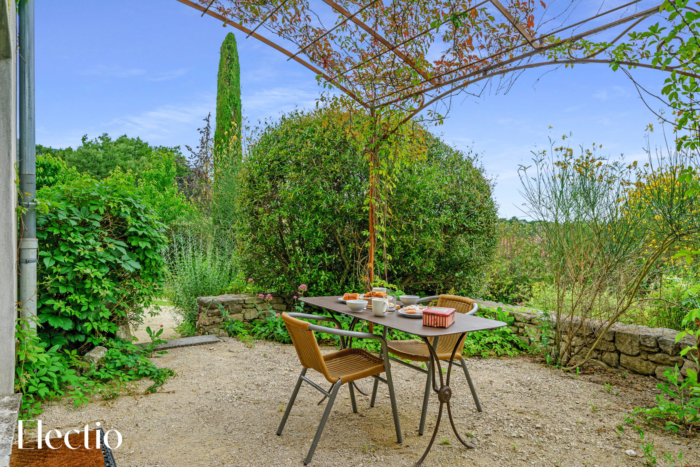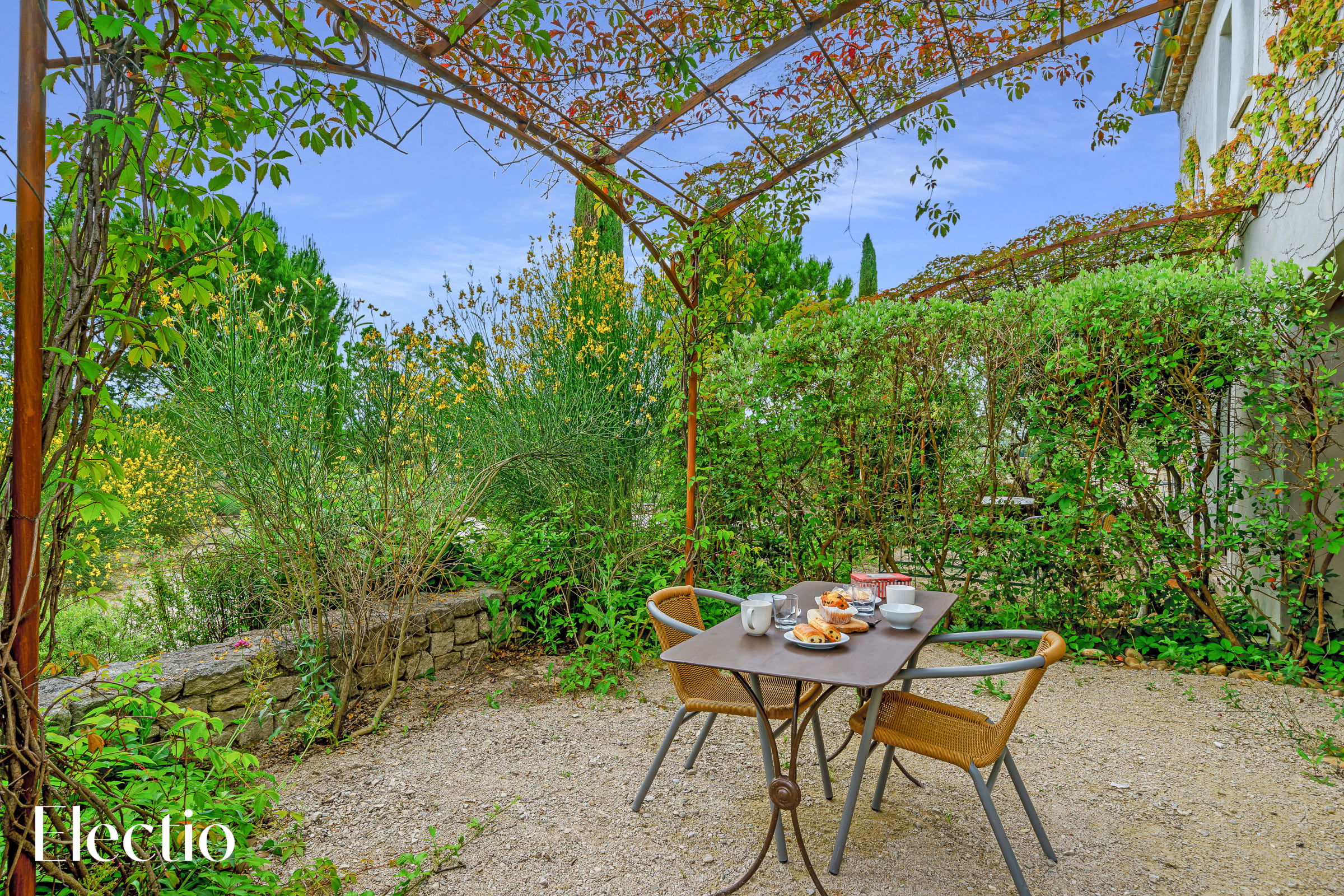 The private 20 m² terrace, equipped with an iron table and two wicker chairs, offers a panoramic view to the north of the Monts de Vaucluse and Mont Ventoux. Ideal for enjoying an outdoor breakfast or a sunset aperitif.