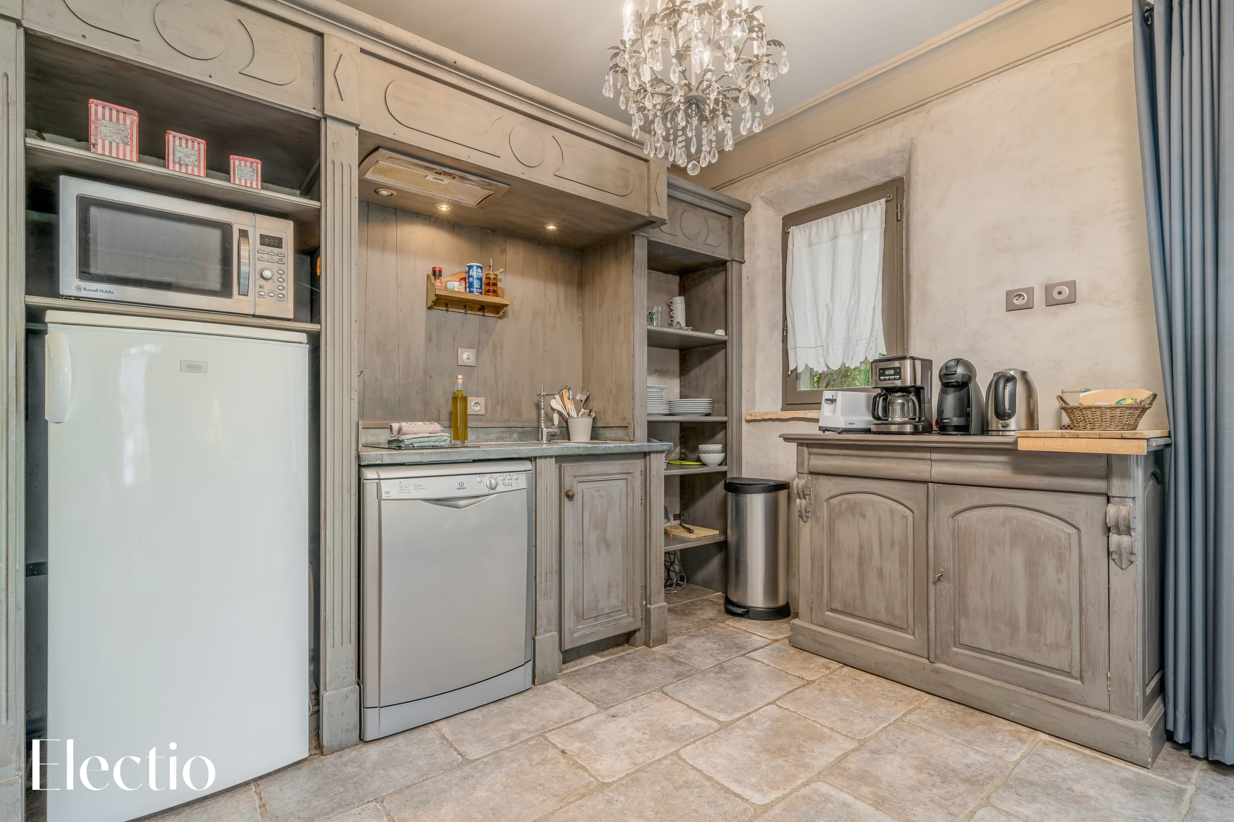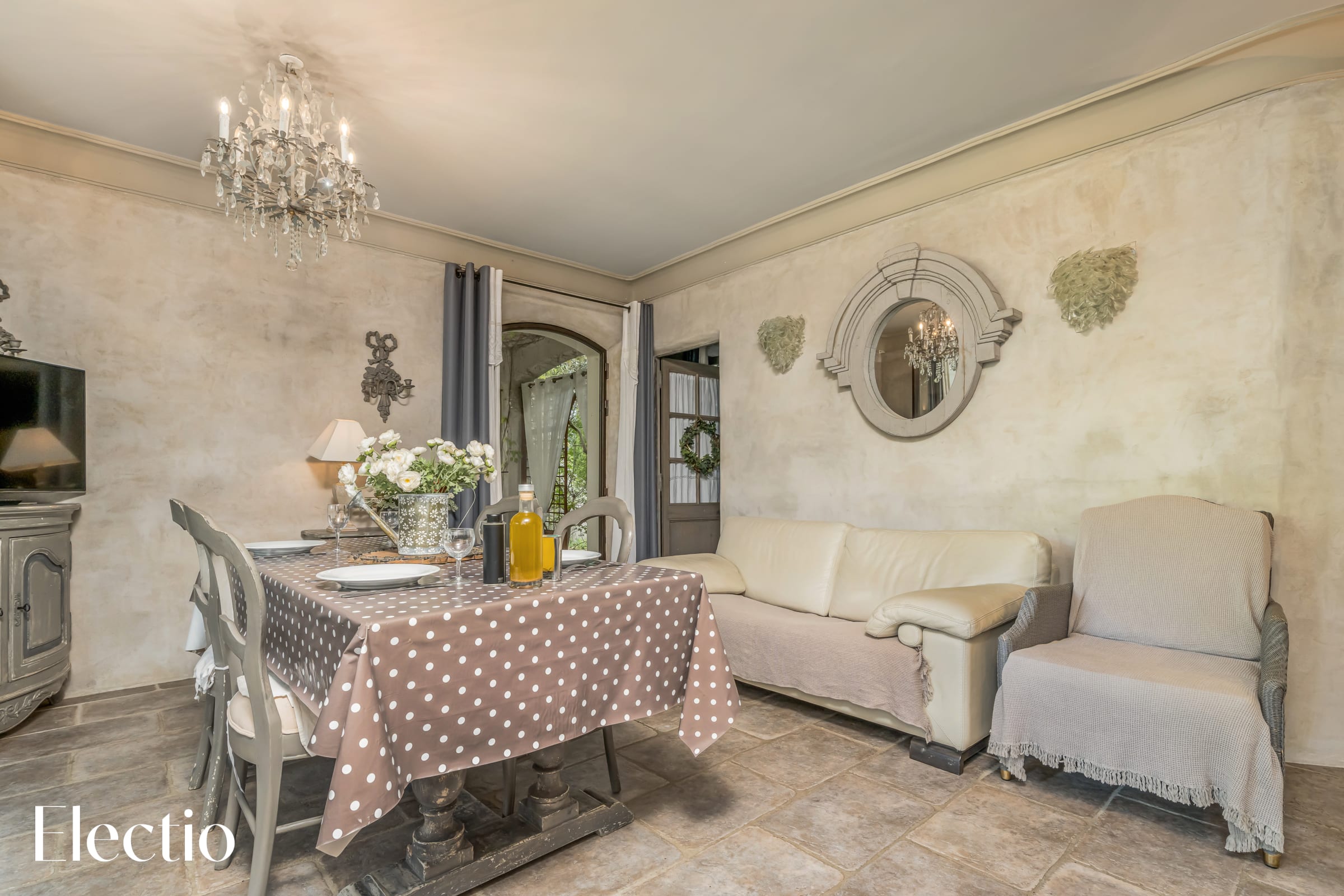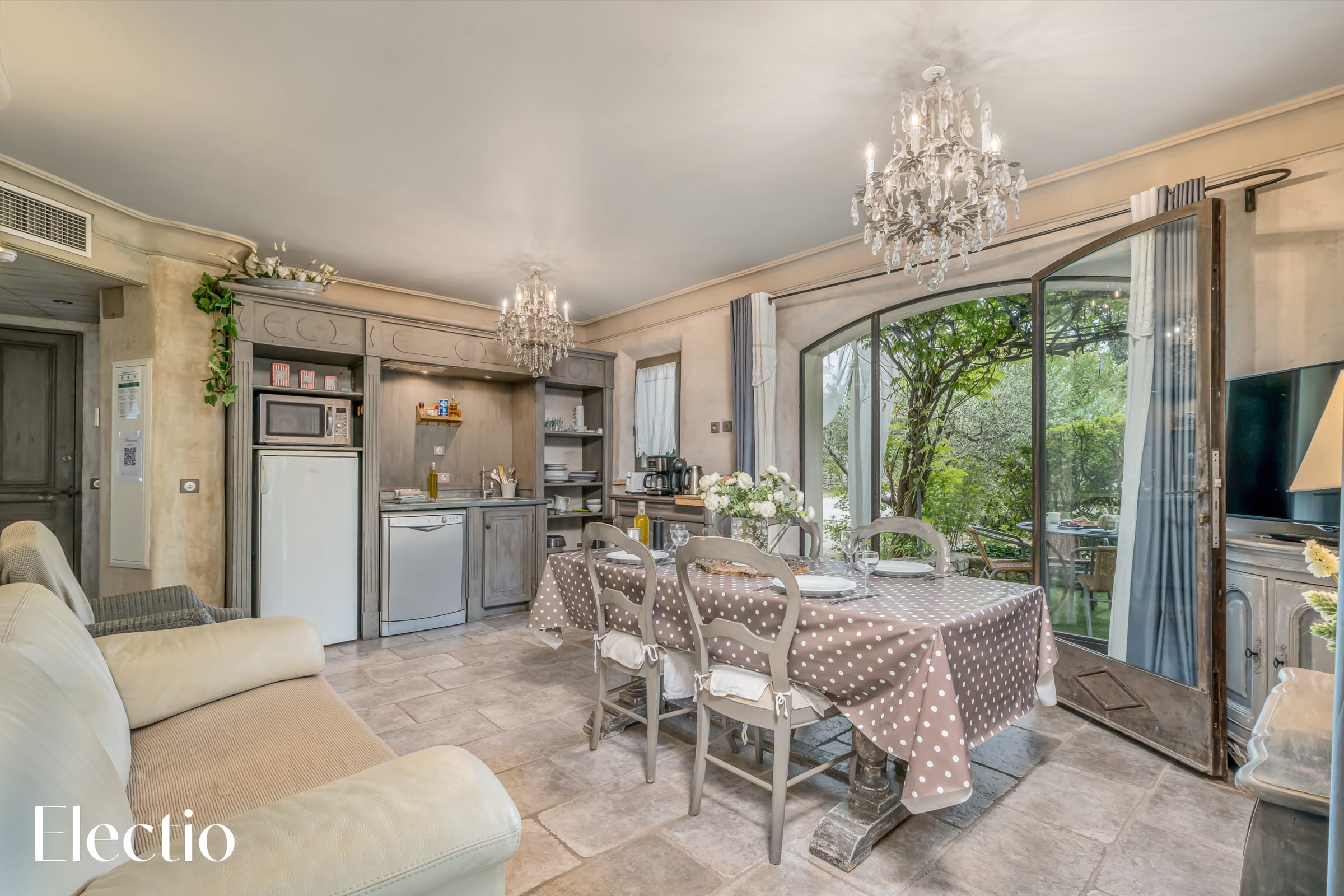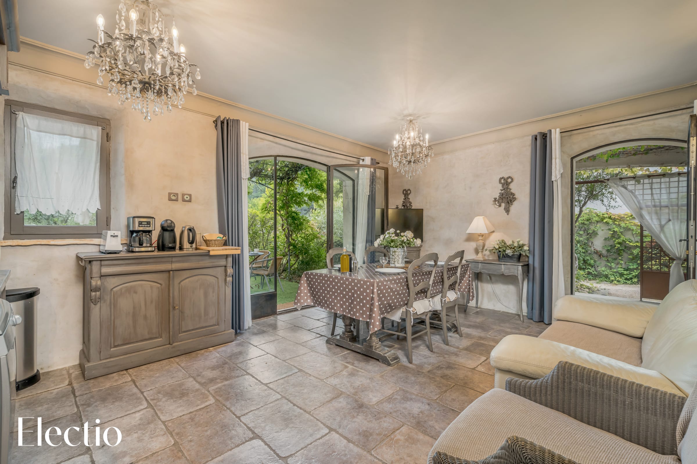 ☀️The living room, bathed in light thanks to its two large French doors facing south and southwest, includes a lounge area and a fully equipped kitchen. A wooden table covered with a waxed cloth, surrounded by four chairs, sits next to a comfortable sofa and an armchair, ideal for relaxing in front of the TV after a day of exploring the Luberon.