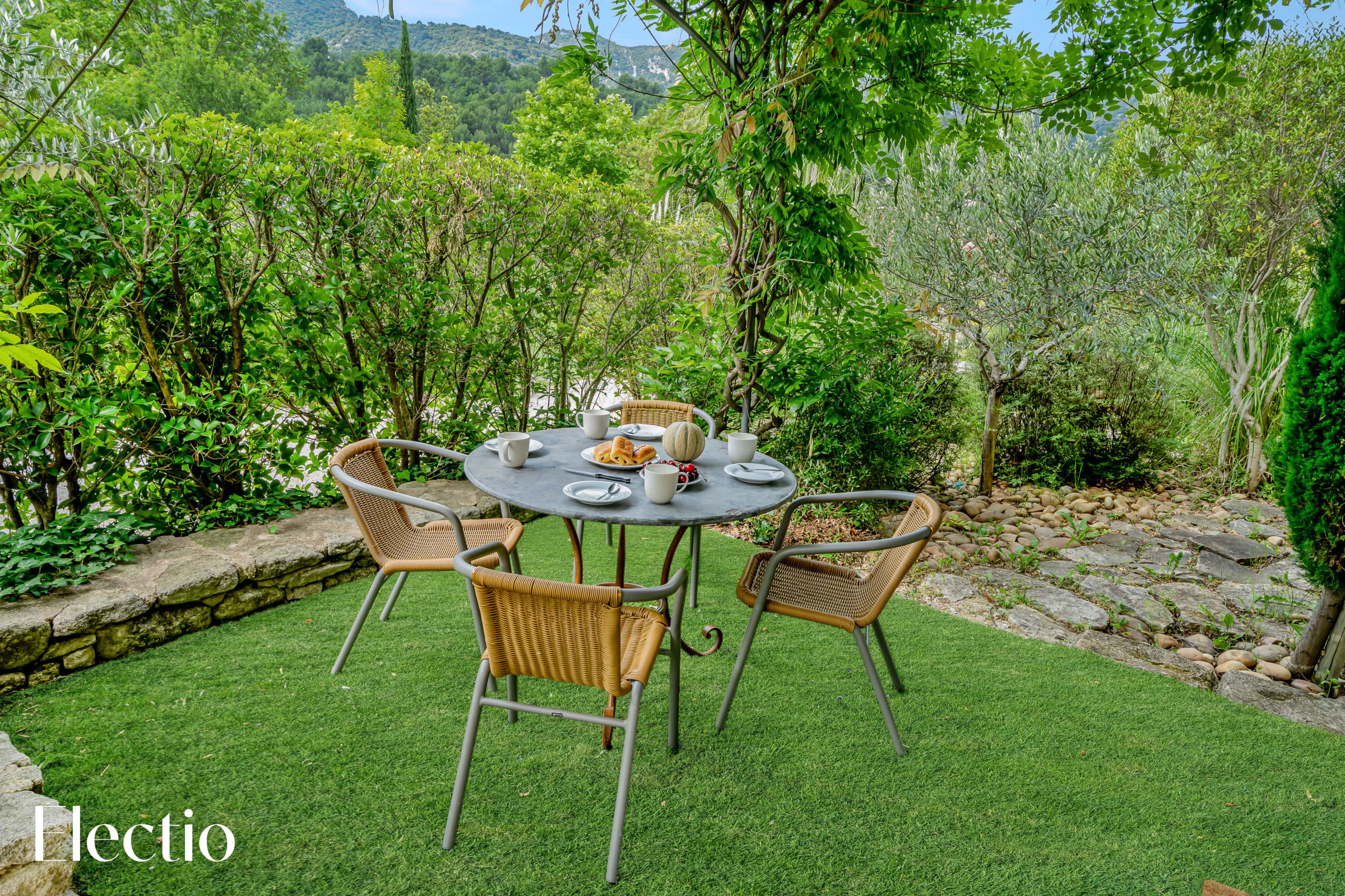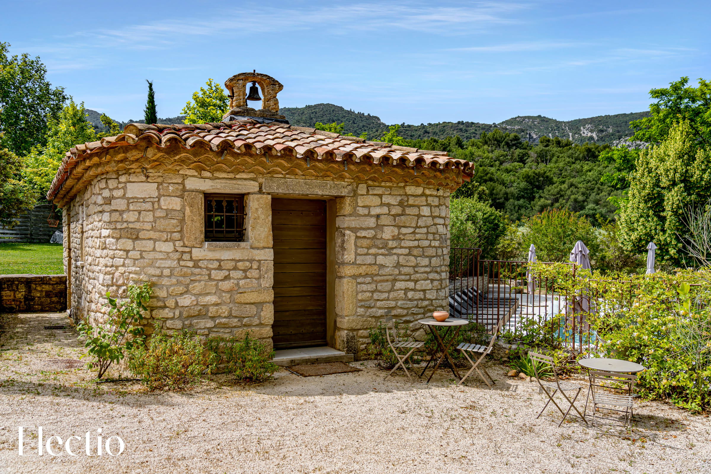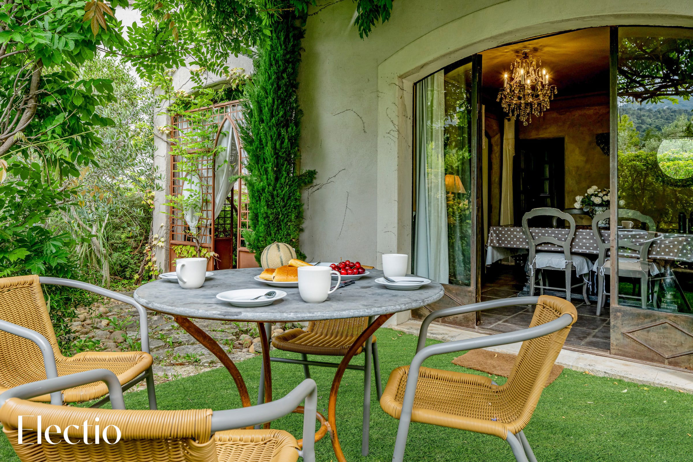 The residence's outdoor spaces are beautifully landscaped to offer you an authentic Provençal experience. You’ll find shaded areas with pergolas, white curtains, plane trees, and stone benches for relaxing. A charcoal barbecue is available for your use, with charcoal easily found in a nearby supermarket. The typical Provençal vegetation – century-old olive trees, broom, oleanders, and lavender – creates an enchanting atmosphere. A fountain and a bell tower add even more charm to the setting.