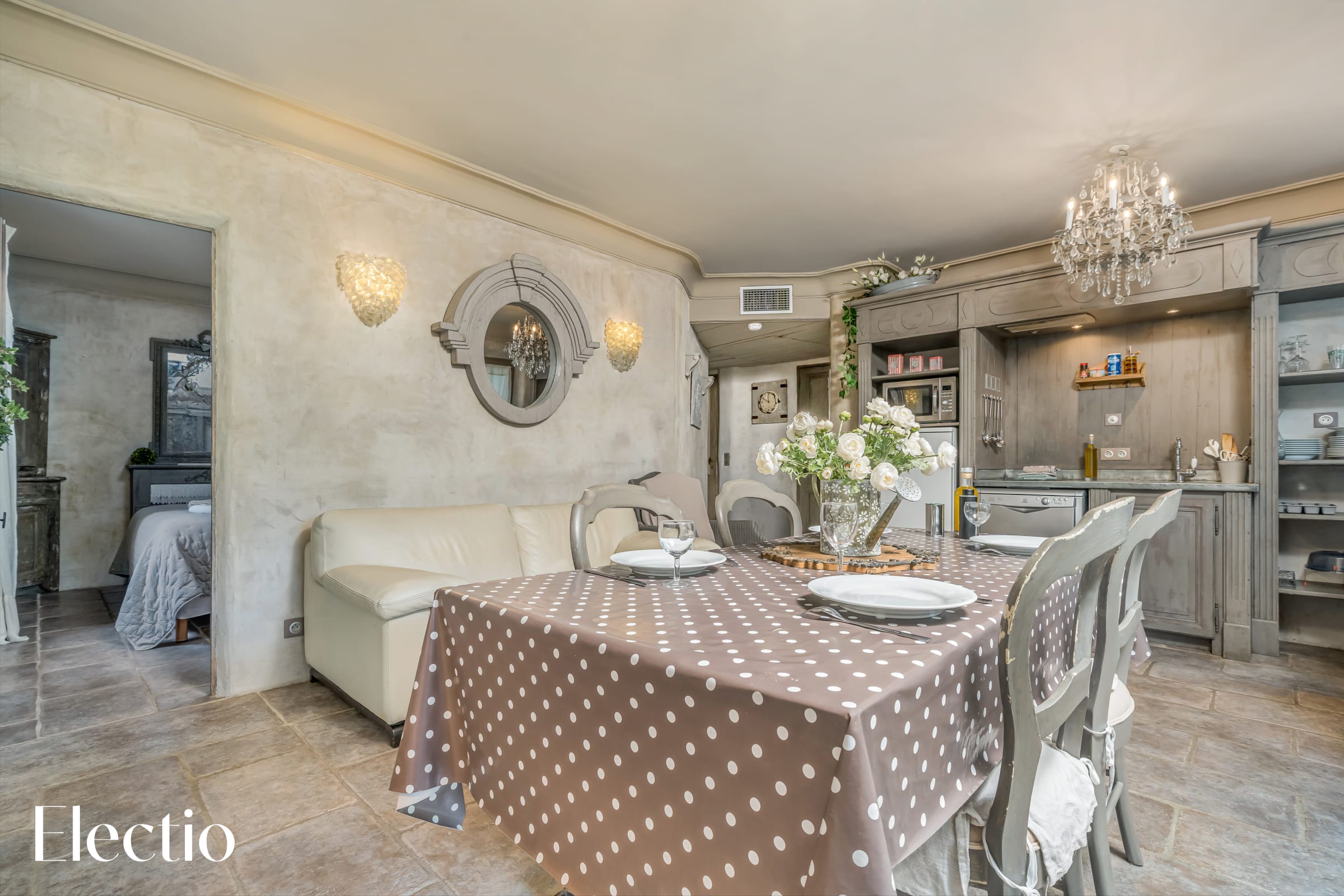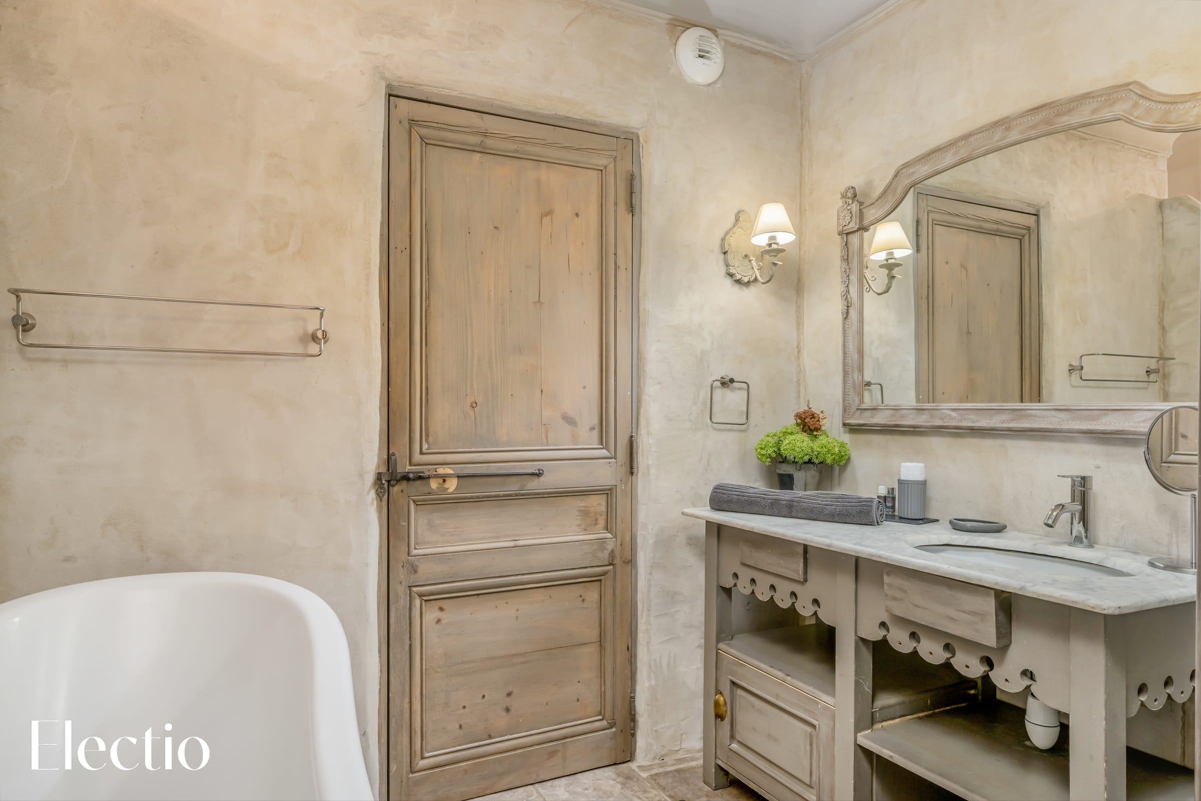 The private terrace, measuring 12 m² and facing south, offers a view of the Luberon and is furnished with a round iron table and four chairs. The second terrace, measuring 9 m² and facing south-southwest and shaded, has an iron table and four comfortable wicker chairs. This terrace offers a panoramic view of the Monts de Vaucluse and Mont Ventoux, perfect for an outdoor breakfast or an aperitif at sunset.