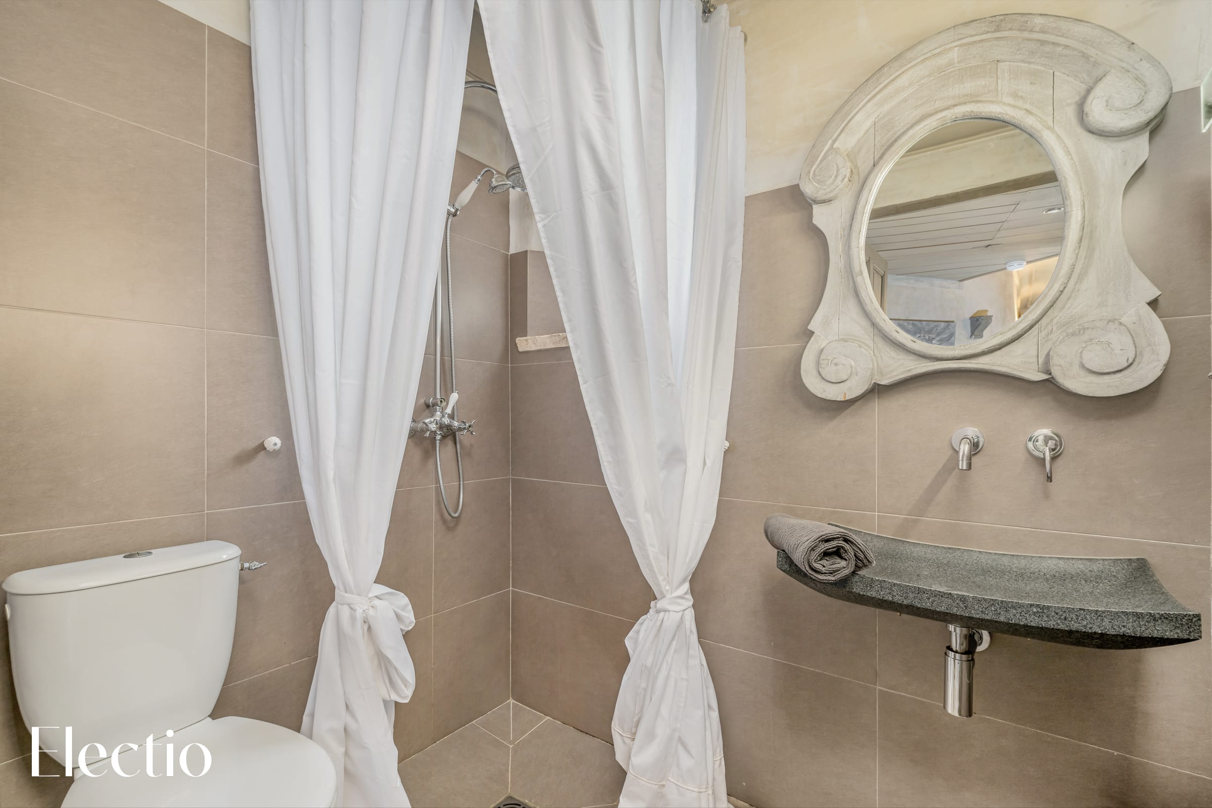 🛏️ The bedroom, facing southeast, has two single beds (90x190 cm) side by side, with wooden nightstands and lamps. You will also find storage spaces and a mirror. Nearby is a bathroom with a walk-in shower, sink, mirror, and toilet.