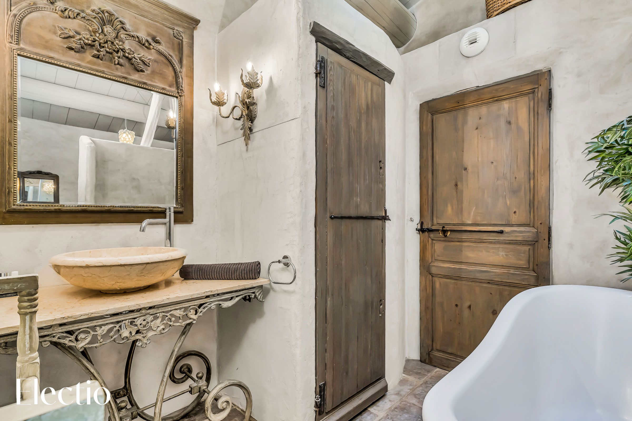 🛏️ The large bedroom features a 160x200 cm bed, several lighting sources, a mirror, and a window overlooking the Luberon, complemented by a chair. The ensuite bathroom includes a bathtub, a sink with a mirror, and has direct access to the toilet.