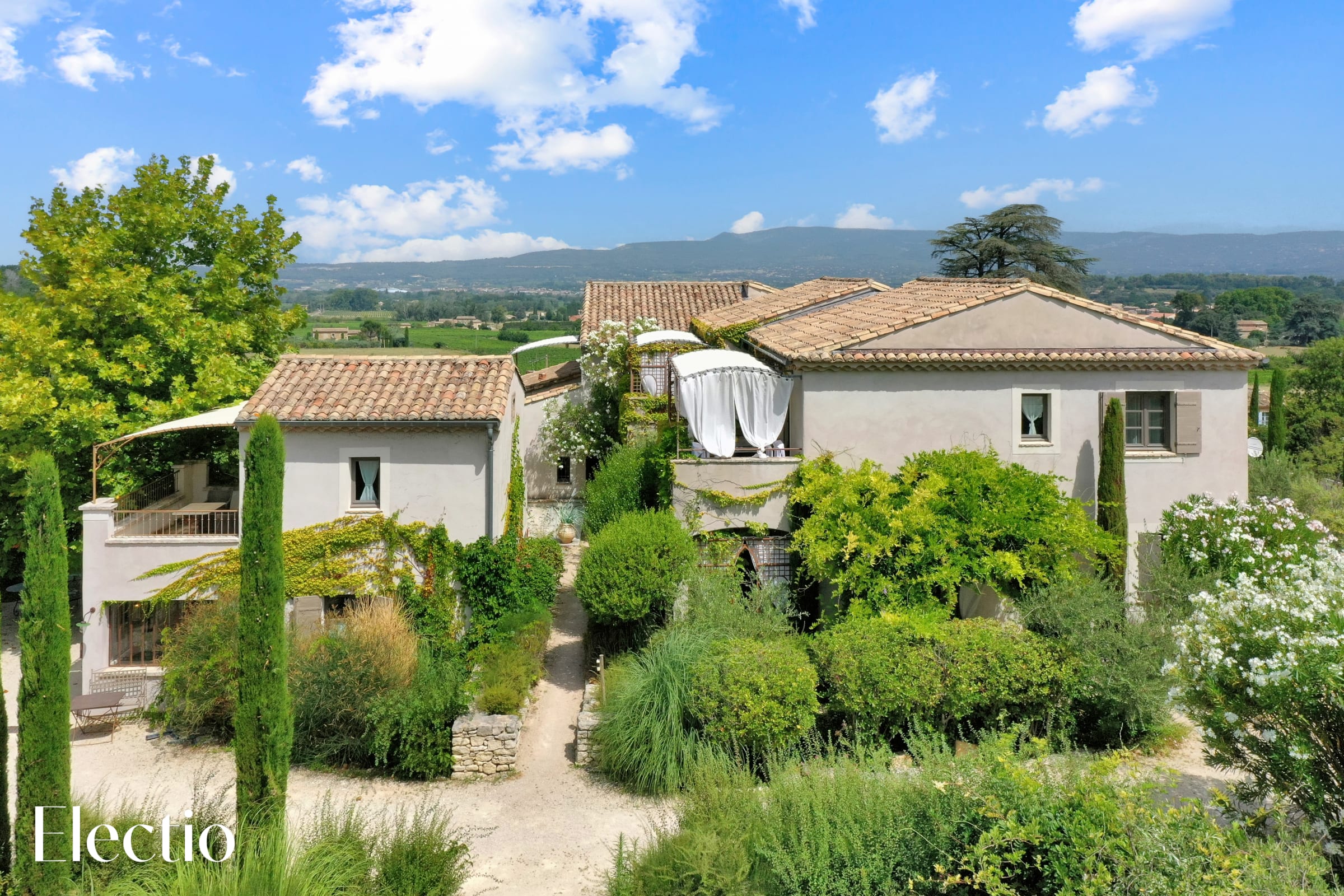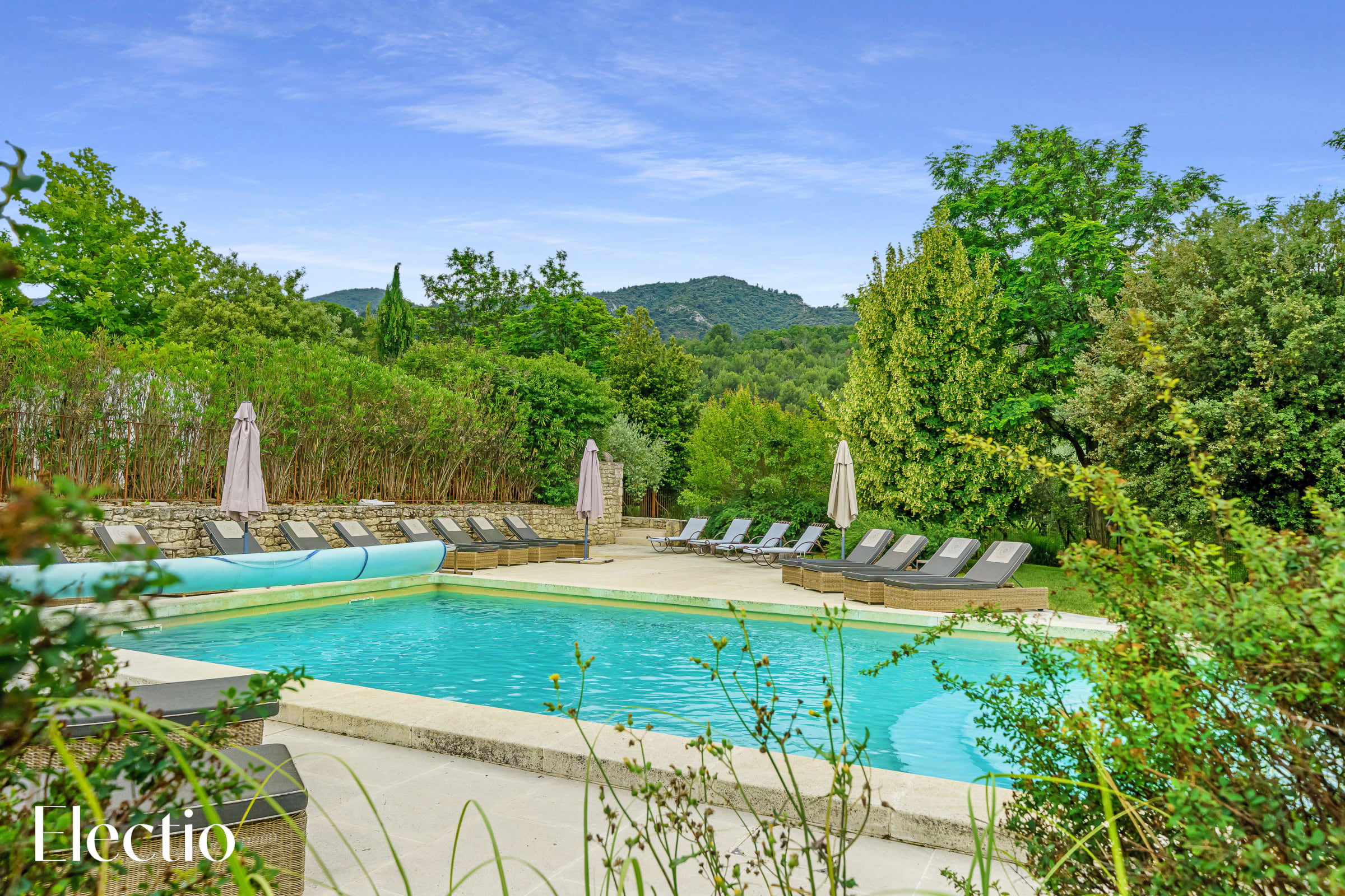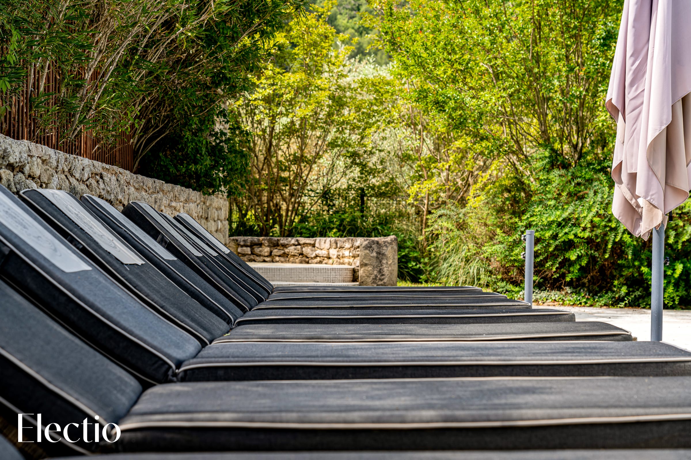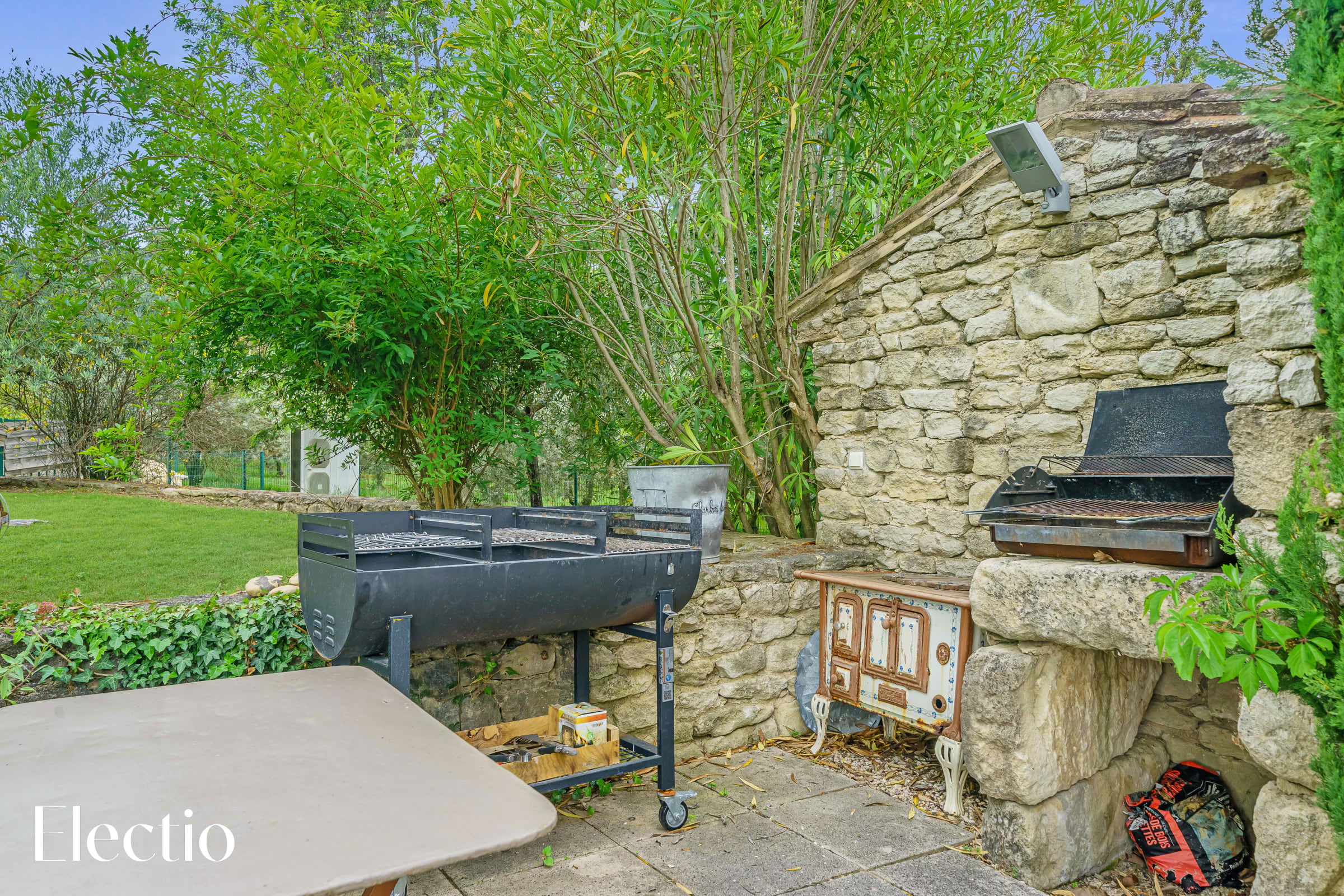 The residence's outdoor spaces are beautifully landscaped to offer you an authentic Provençal experience. You’ll find shaded areas with pergolas, white curtains, plane trees, and stone benches for relaxing. A charcoal barbecue is available for your use, with charcoal easily found in a nearby supermarket. The typical Provençal vegetation – century-old olive trees, broom, oleanders, and lavender – creates an enchanting atmosphere. A fountain and a bell tower add even more charm to the setting.