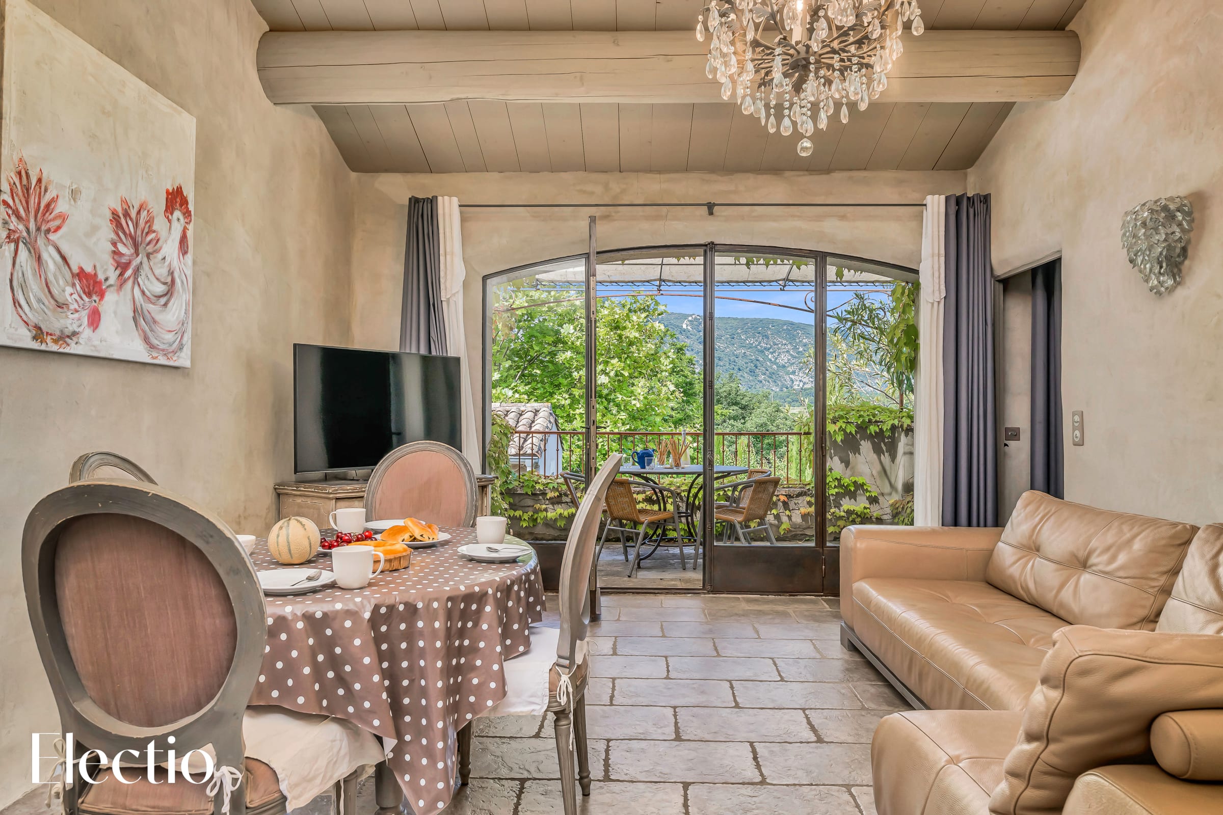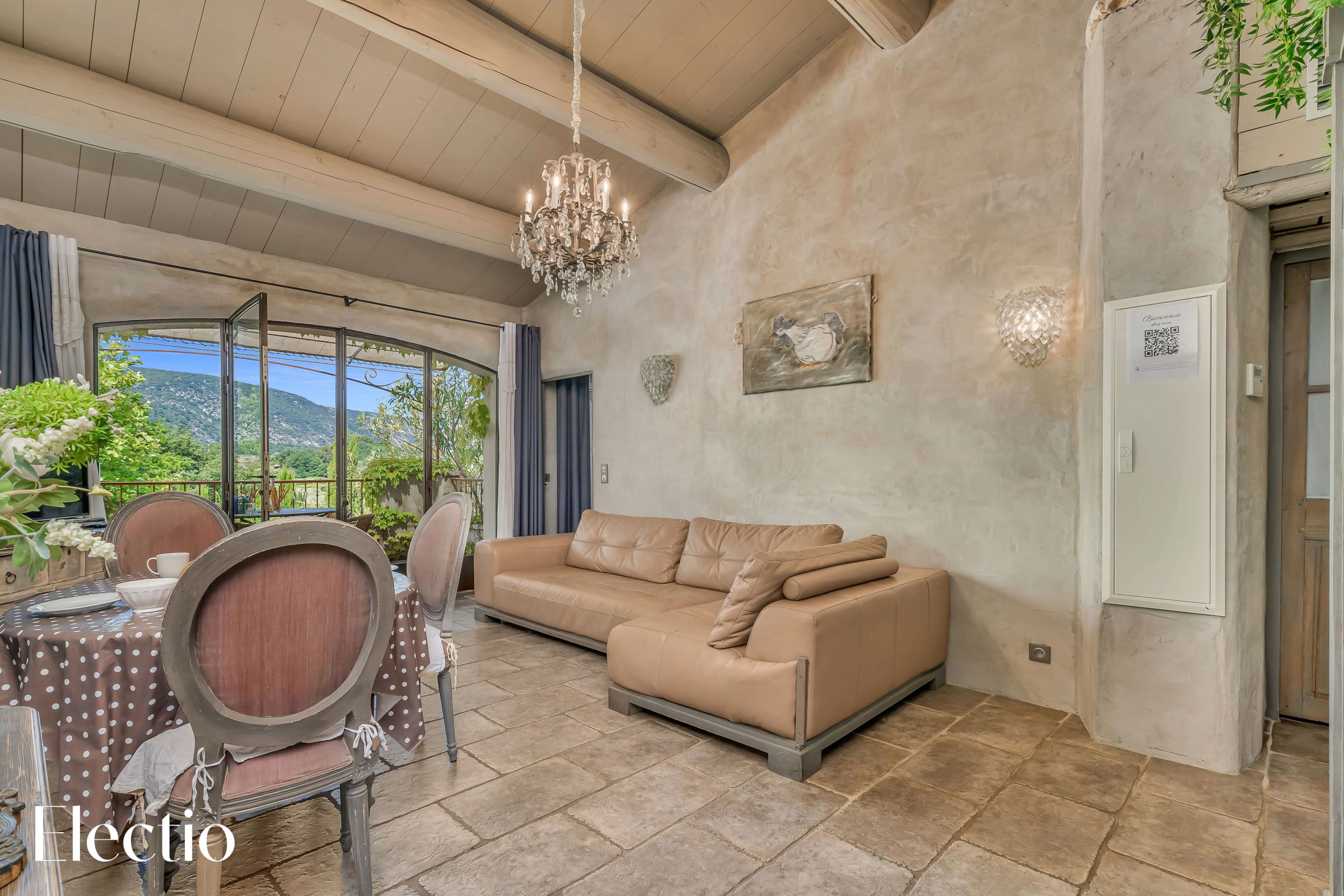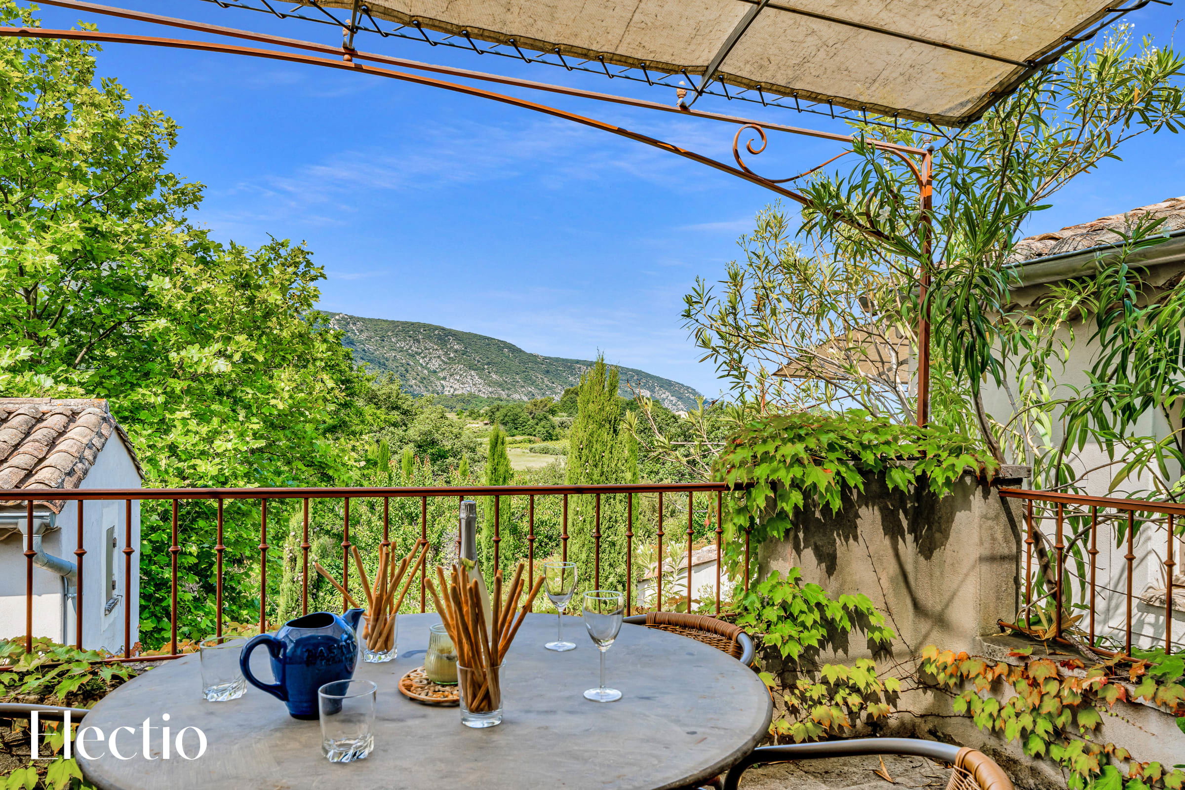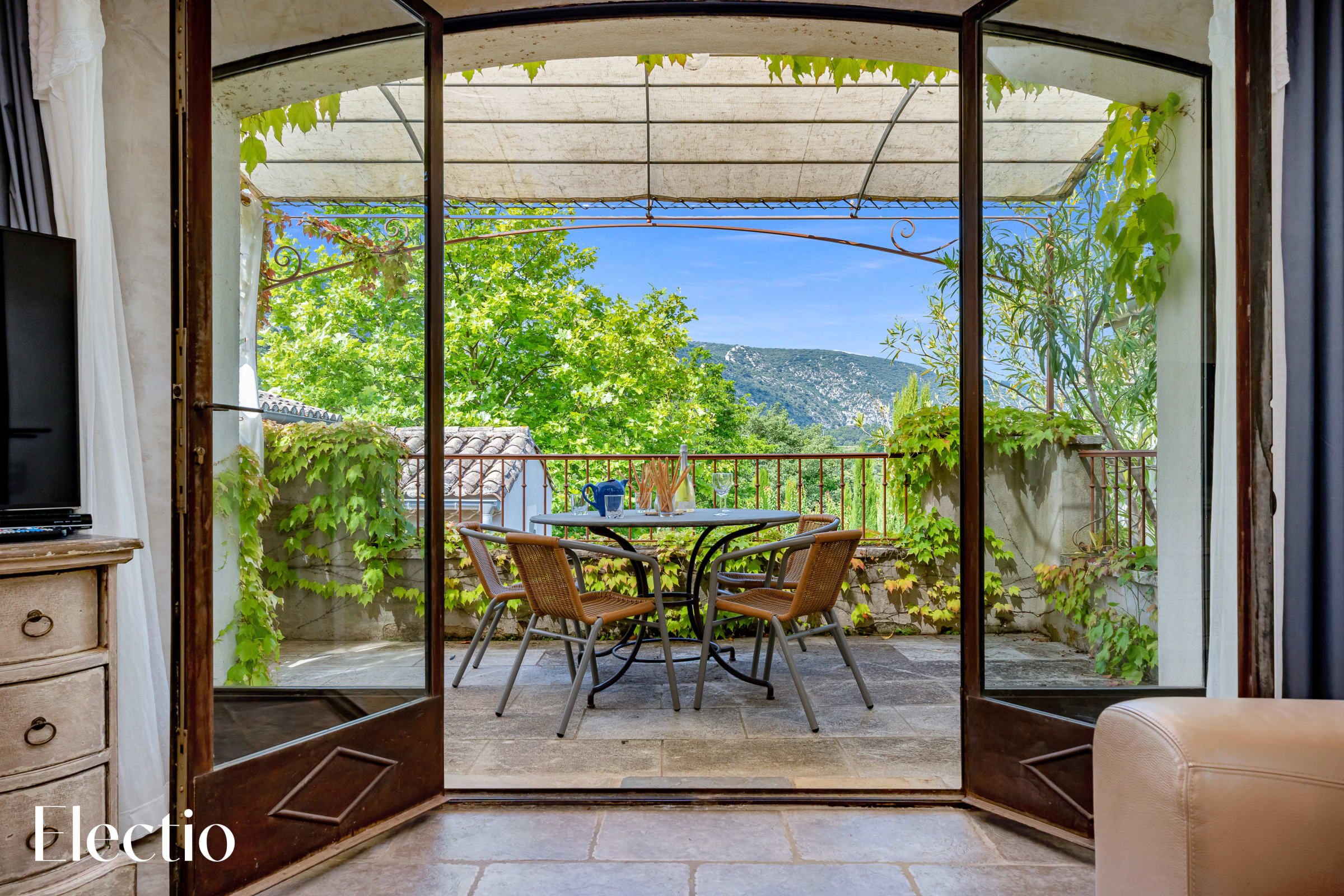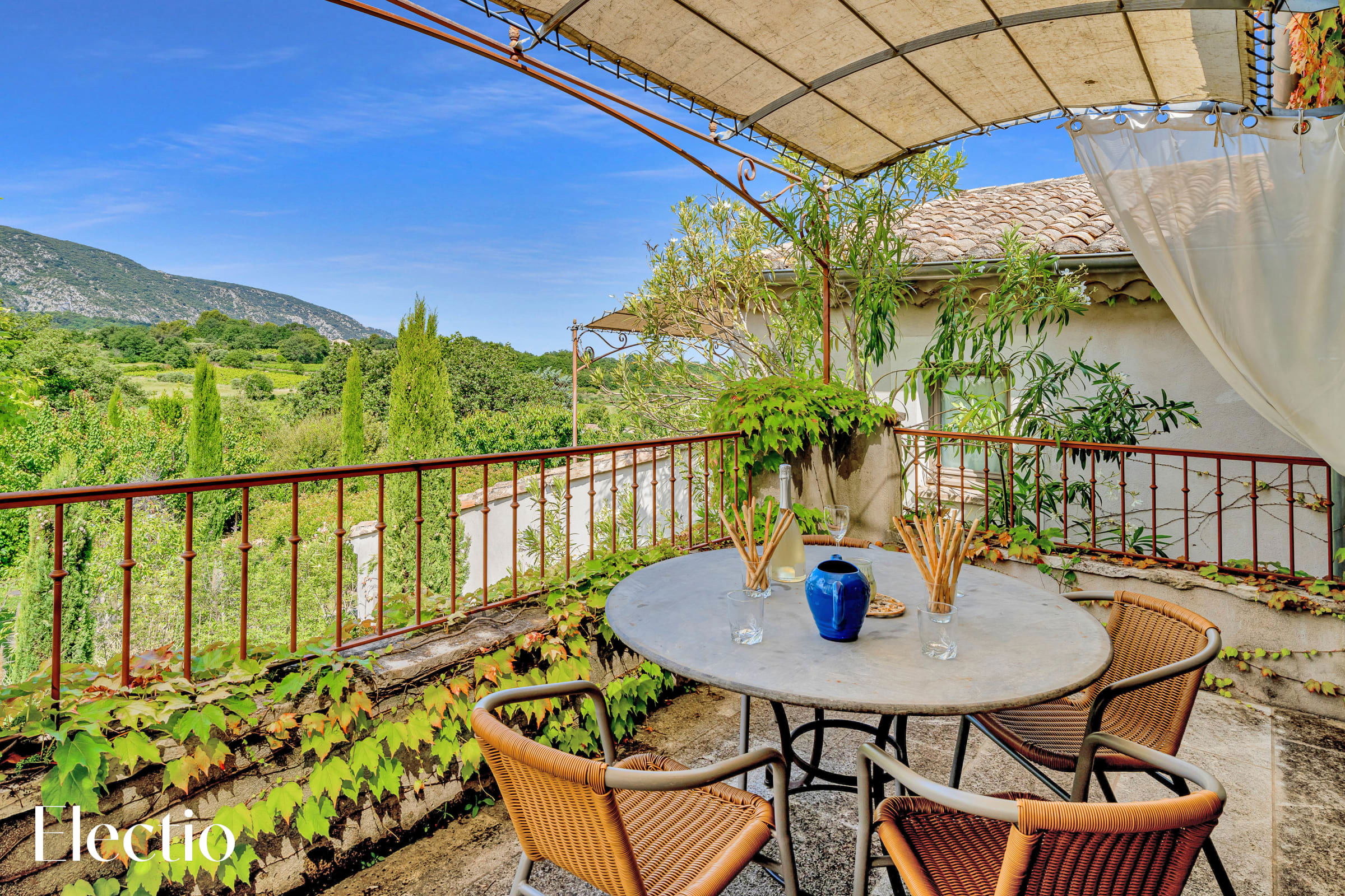 The private 12 m² terrace offers a stunning south-southwest view of the surrounding countryside and Mont Ventoux. It is furnished with a metal table and four wicker chairs, ideal for enjoying an outdoor breakfast or an evening aperitif while admiring the panoramic view of the Luberon.