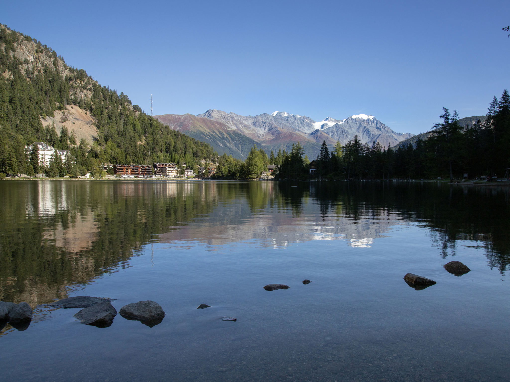 "Colline 3", 3-room apartment 75 m2, on the ground floor. Practical and beautiful furnishings: living/dining room with open-hearth fireplace and cable TV. Exit to the terrace. 1 room with 1 french bed. 1 room with 2 beds. Kitchen (oven, raclette grill, fondue Set (cheese)). Bathroom, sep. WC. Terrace furniture. Beautiful view of the lake. Facilities: hair dryer. Internet (WiFi, free). Parking at the house. Please note: non-smokers only. Maximum 1 pet/ dog allowed.