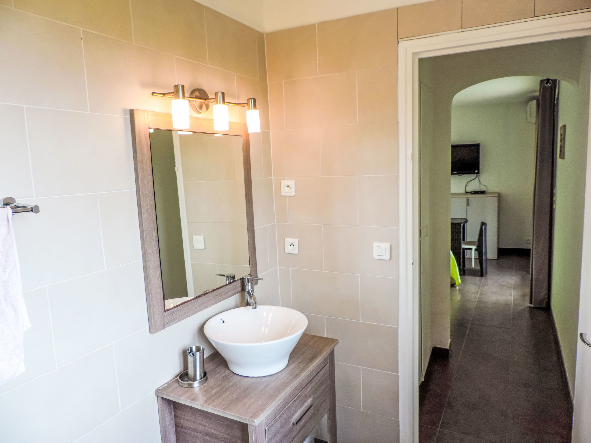 "Fougère", 1-room apartment 27 m2, on the ground floor. Beautiful furnishings: living/sleeping room with 1 french bed, dining table and satellite TV. Exit to the terrace. Kitchenette (oven, dishwasher, 3 ceramic glass hob hotplates, toaster, kettle, microwave, freezer, electric coffee machine). Shower/WC. Electric heating, air-conditioning. Terrace 10 m2. Terrace furniture. Beautiful view of the mountains, the countryside, the forest and the ocean. Facilities: Internet (WiFi, free). Please note: non-smokers only. Maximum 1 pet/ dog allowed. Smoke alarm. Offer by a commercial proprietor according to Art. 155, IV, CGI