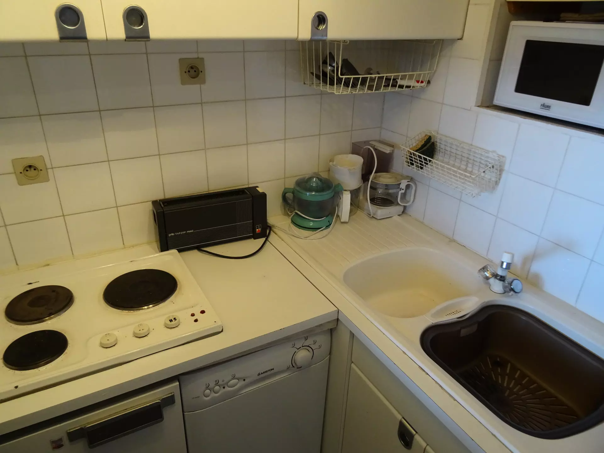 It is equipped with electric hobs, an oven, a microwave, a dishwasher and a refrigerator.