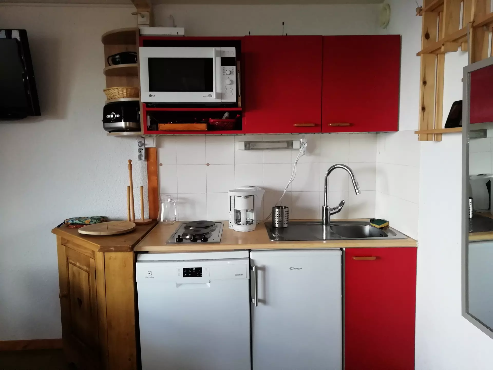It is equipped with electric hotplates, a dishwasher, a microwave oven and a refrigerator.