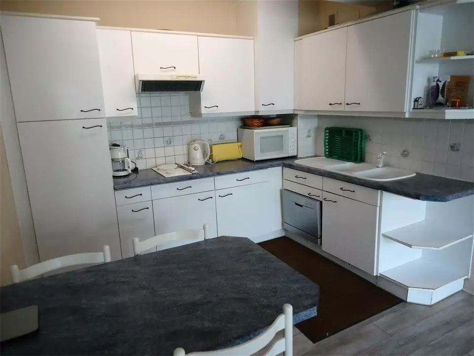 -An open kitchen fitted and equipped with sink, extractor hood, fridge/freezer, electric hob, coffee maker, kettle, toaster, dishwasher;