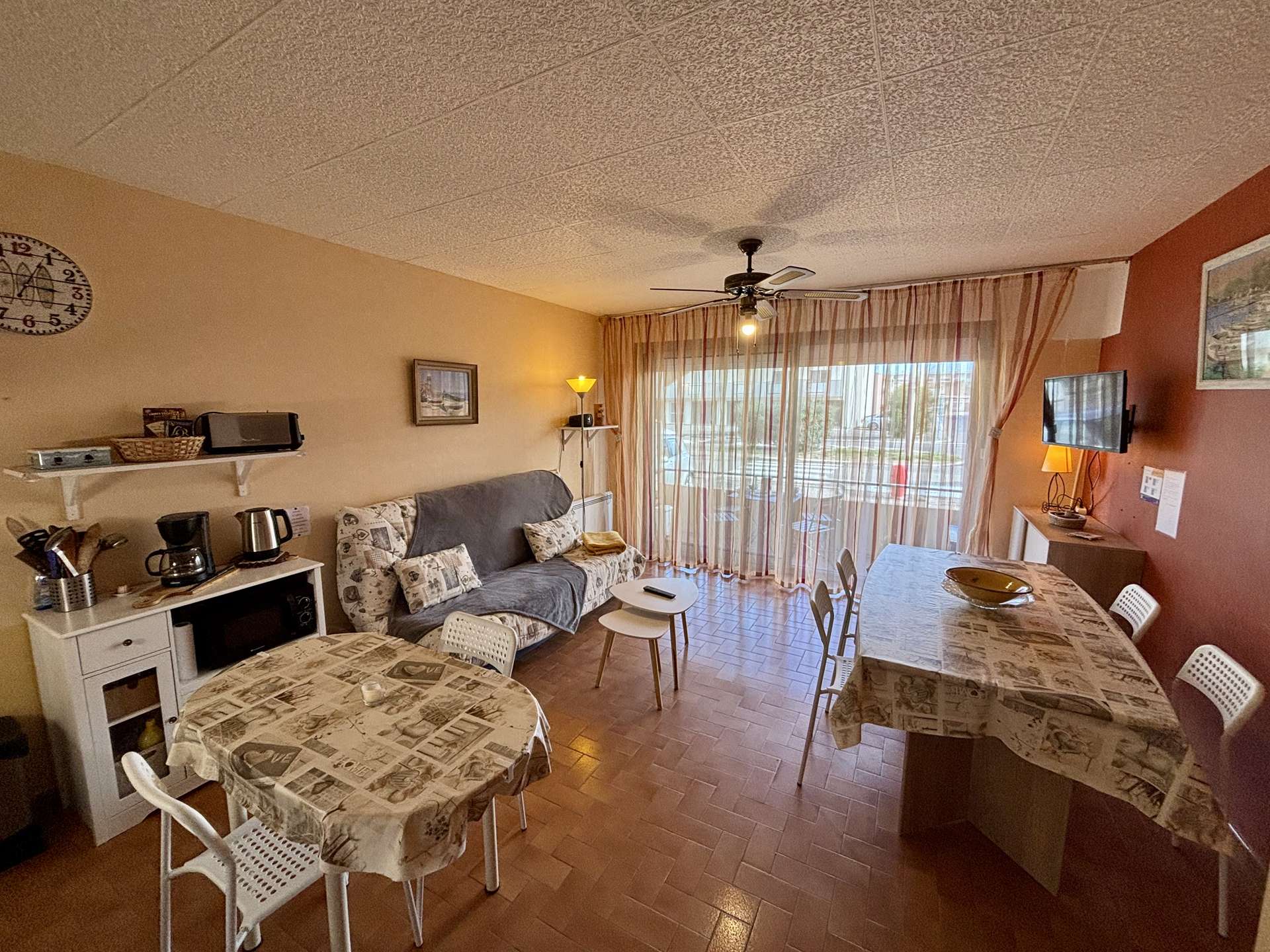 Un séjour lumineux avec canapé convertible et télévision