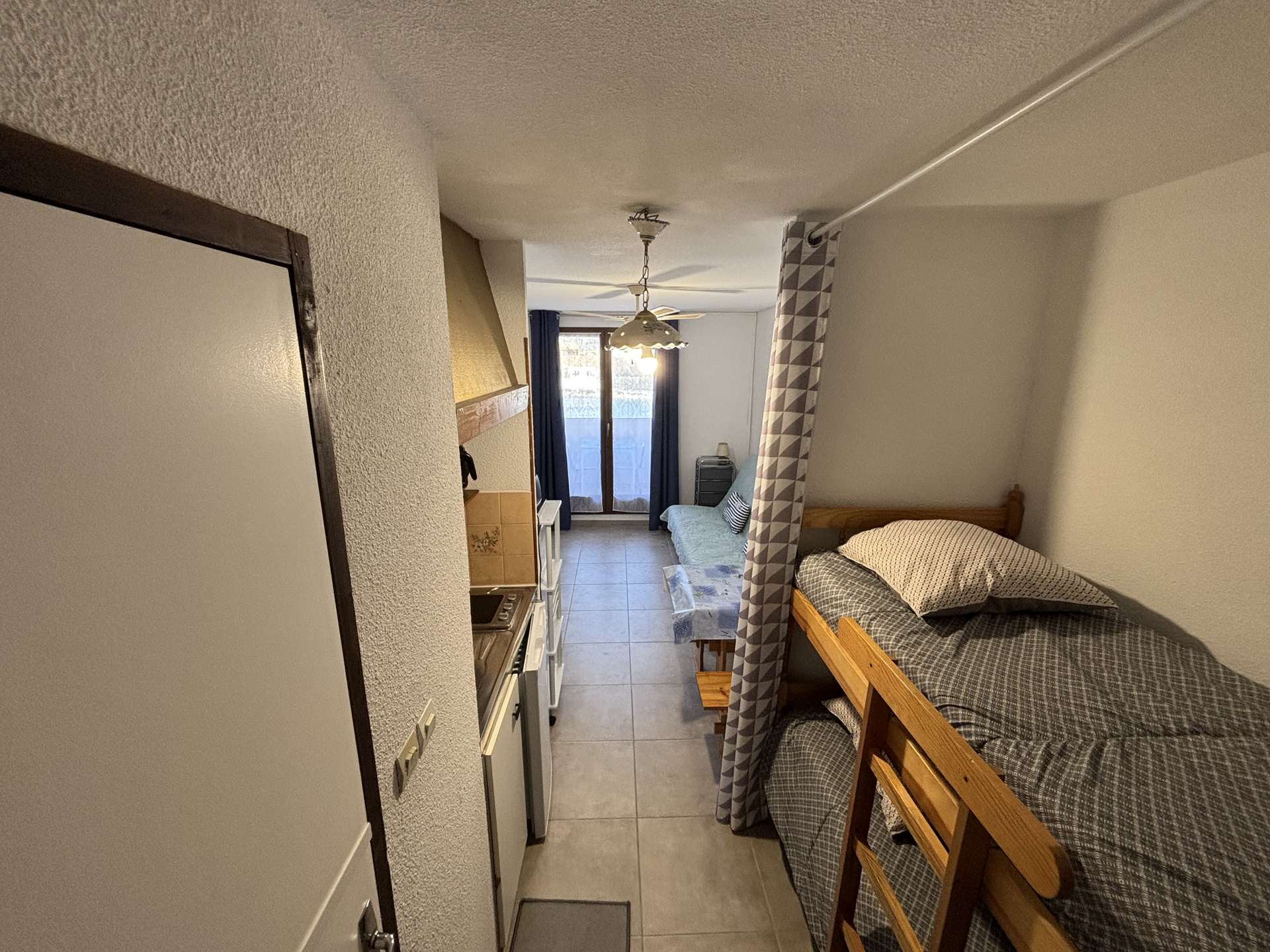 Cet hébergement de vacances, situé au 1er étage, comprend un séjour avec télévision et canapé lit 2 personnes, un coin cuisine, une salle d'eau avec WC. Un coin cabine avec lit superposé et une terrasse fermé avec vue sur le lac.