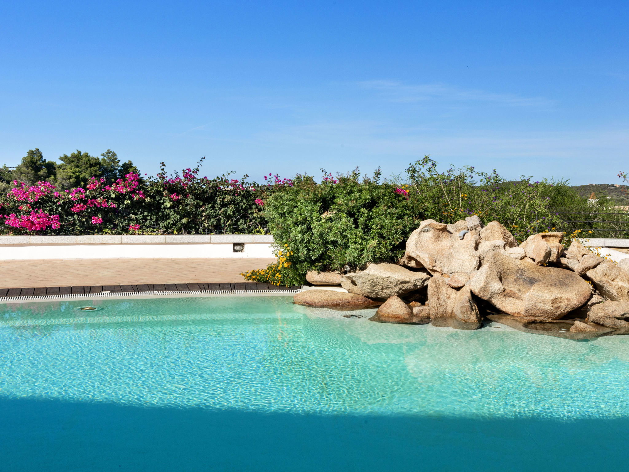 Resort "Il Giardino degli Oleandri", 2 storeys, surrounded by trees. 21 apartments in the residence. 3 km from the centre of Porto Cervo, 3.7 km from the centre of Baia Sardinia, outside the resort, 17 km from the centre of Arzachena, on top of a hill, 750 m from the sea. For shared use: beautiful garden with lawn and plants, 2 swimming pools kidney-shaped (seasonal availability: 01.May. - 15.Oct.) with internal staircase. In the complex: reception, washing machine (for shared use). Parking. Shop 3 km, supermarket 3 km, bus stop 1.5 km, ferry "Olbia" 26 km, sandy beach "Spiaggia di Pitrizza" 750 m. Golf course (18 hole) 5 km. On request: airport transfer to the holiday accommodation. The photo is just an example.