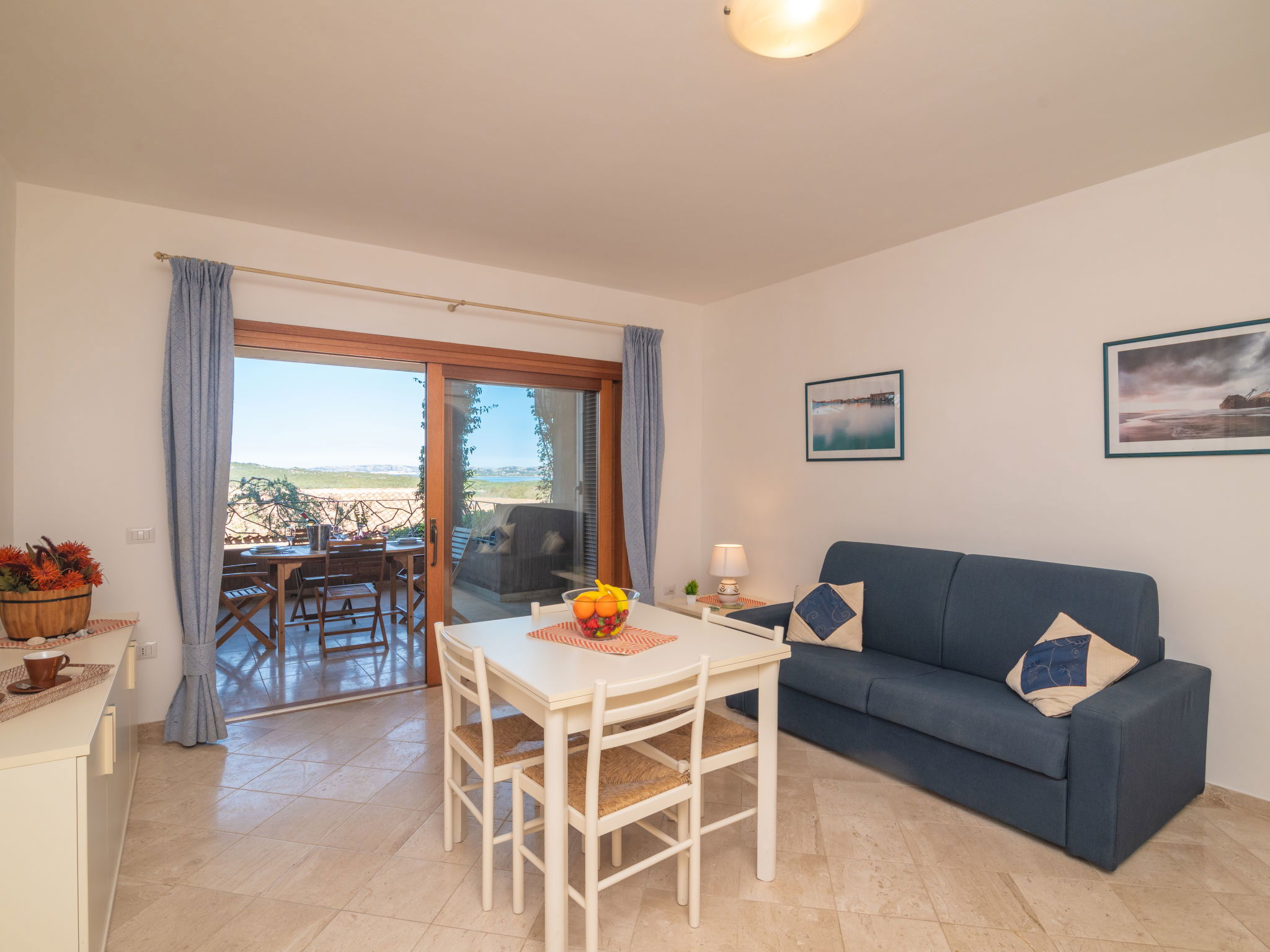 "Il Fjordo bilo ", 2-room apartment 45 m2, on the upper ground floor. Bright, modern furnishings: living/sleeping room with 1 double sofabed and dining table. Exit to the terrace. 1 room with 1 french bed (160 cm). Open kitchen (oven, 4 gas rings, toaster, electric coffee machine). Shower/WC. Electric heating, air-conditioning. Balcony 10 m2. Balcony furniture, deck chairs (2). View of the sea. Facilities: washing machine, children's high chair, baby cot. Internet (WiFi, free). Maximum 1 pet/ dog allowed.