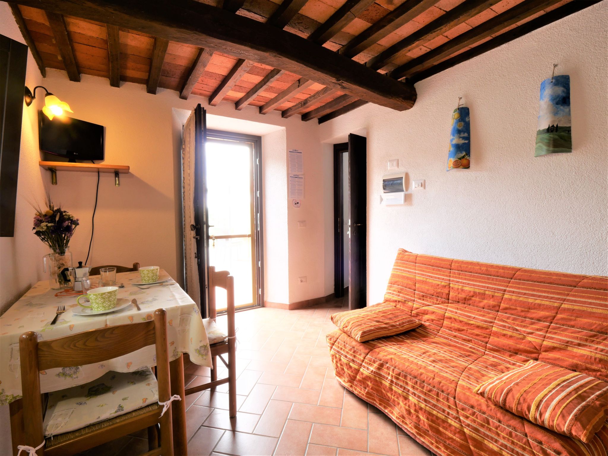 "Pian dei Carpini - Chiara", 2-room apartment 29 m2 on 2 levels. Rustic and cosy furnishings: living/sleeping room with 1 sofabed, dining table and satellite TV. Exit to the garden. Open kitchen (oven, Gas stove, 4 gas rings, kettle, freezer, electric coffee machine). Upper floor: (steep stair), 1 room with 1 double bed and shower/WC. Patio roofed. Beautiful panoramic view of the forest. Facilities: safe, mosquito net, baby cot, hair dryer. Internet (WiFi, free). Please note: non-smokers only. Maximum 1 pet/ dog allowed. Private entrance. IT053015C2A5EZLG4C