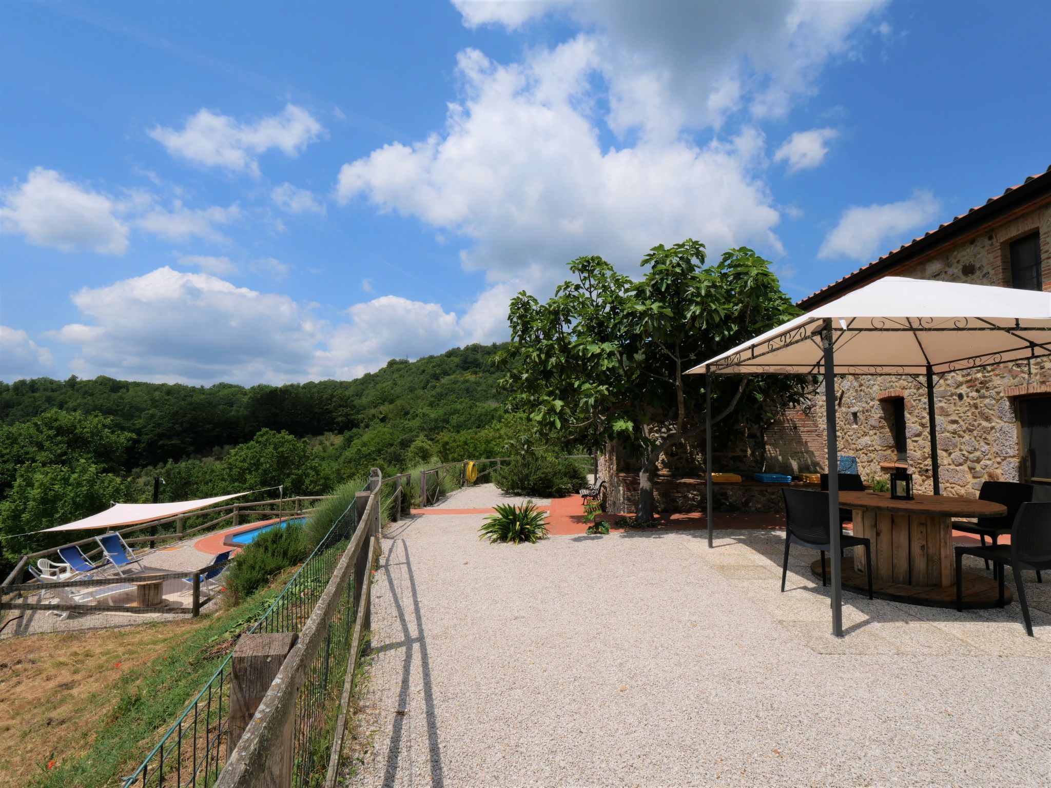 Country house "Podere Pian dei Carpini", 435 m a.s.l., detached, surrounded by trees and fields. 4 apartments in the residence. Below Prata 2.6 km from the centre of Prata, 10 km from the centre of Massa Marittima, in a secluded, quiet position, 30 km from the sea, in the countryside. For shared use: natural state property 2'000 m2 (fenced), garden with flowers and trees, meadow, swimming pool fenced (6 x 4 m, depth 120 - 130 cm, seasonal availability: 28.May. - 30.Sep.) with salt-electrolysis pool-cleaning system. Unconventional pool shape. Outdoor shower, boccia, garden furniture, barbecue. Steep motor access (700 m via unmade road). Parking (for 3 cars) on the premises. Shop 2.6 km, supermarket 10 km, restaurant 2.6 km, bicycle rental 11 km, bus stop 2 km, sandy beach 30 km. Walking paths from the house 50 m. Nearby attractions: San Galgano Abbey 22 km, Giardino dei suoni 11 km, Siena 60 km. Well-known lakes can easily be reached: Accesa 20 km. Hiking paths: Mountain-bike 7 km. Please note: the owner lives in the same residence. The owner has a dog. Small house for children and swing. The pool can be reached via an external staircase.