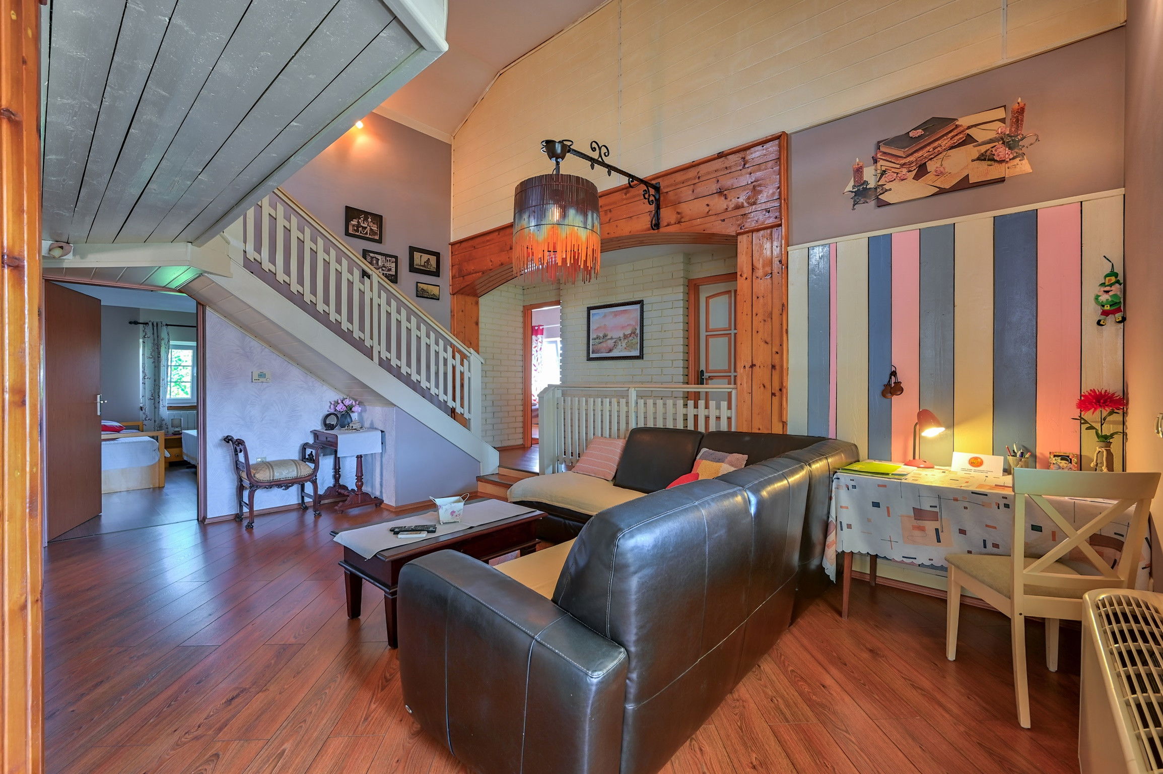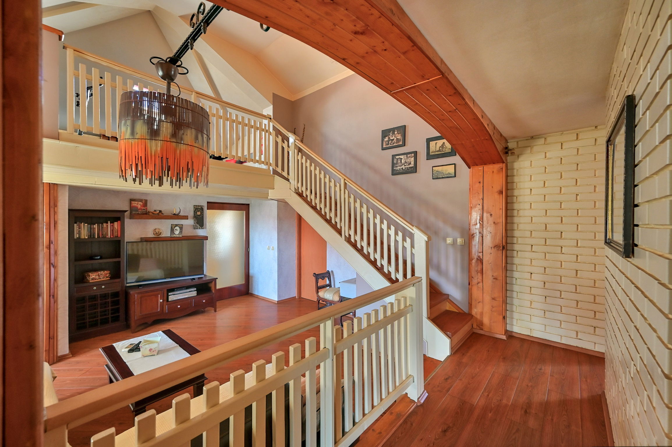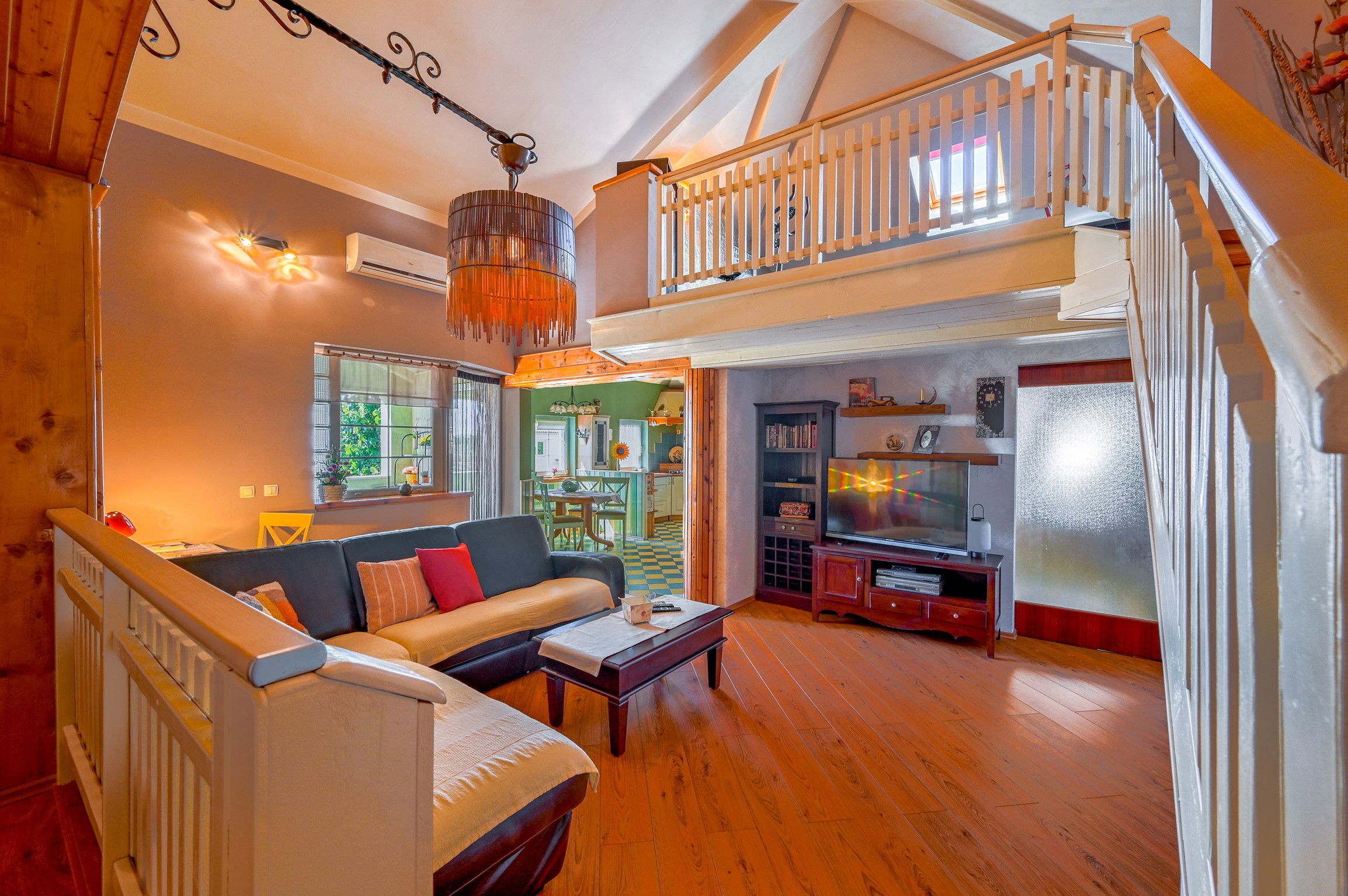A galery above the living room provides a comfortable space for reading or exercising, and it is especially liked by children.