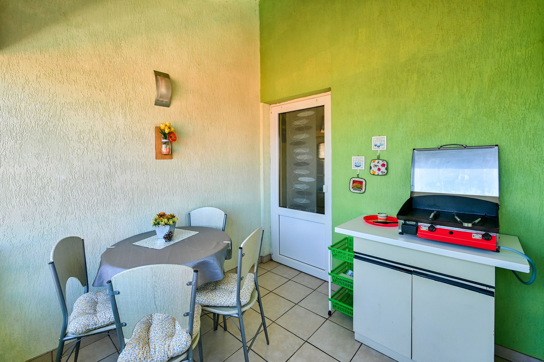 The apartment has two spacious balconies, one of which is equipped with BBQ and outdoor dining area, and the kitchen is equipped with all the necessary cooking utensils.