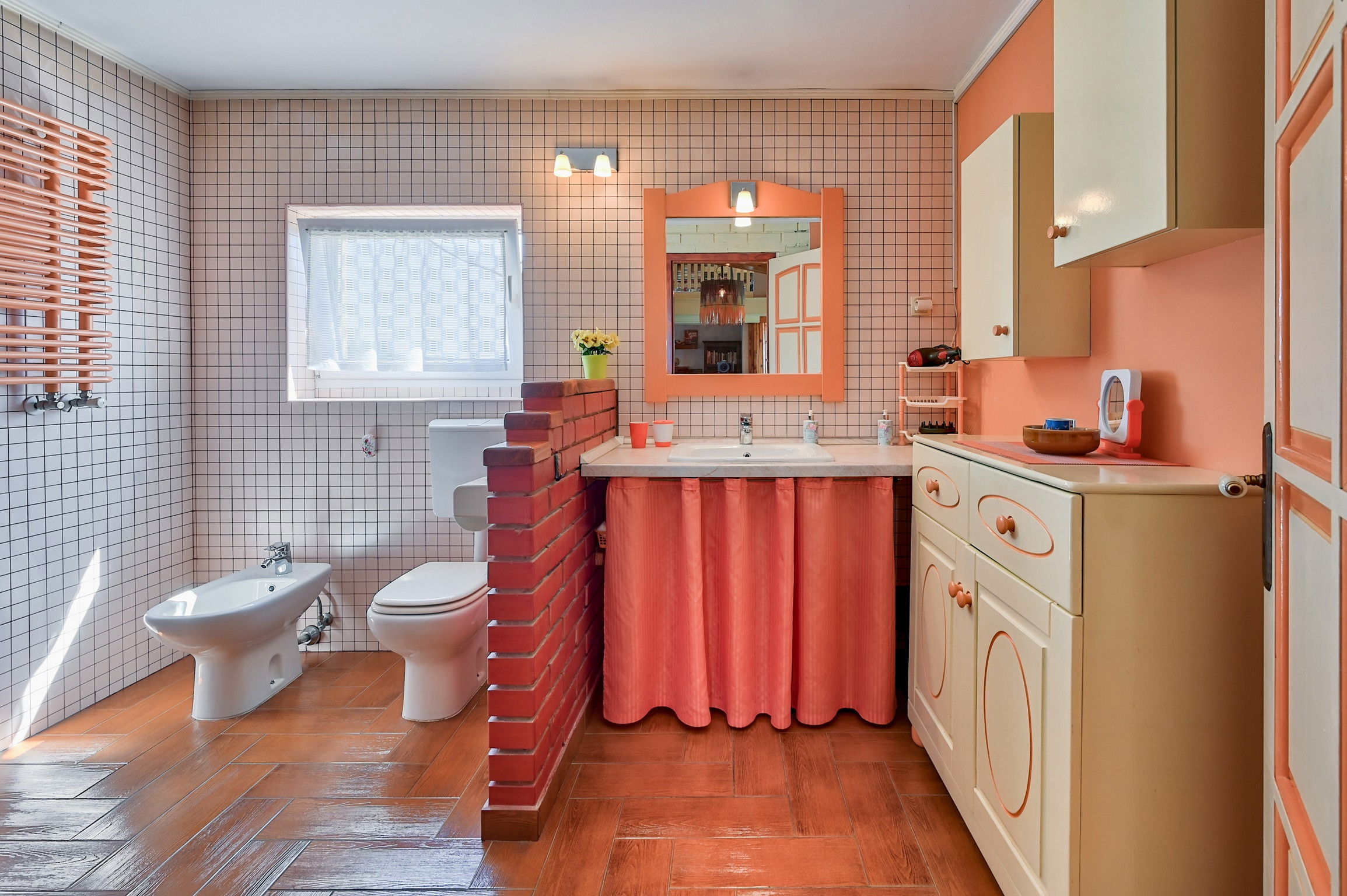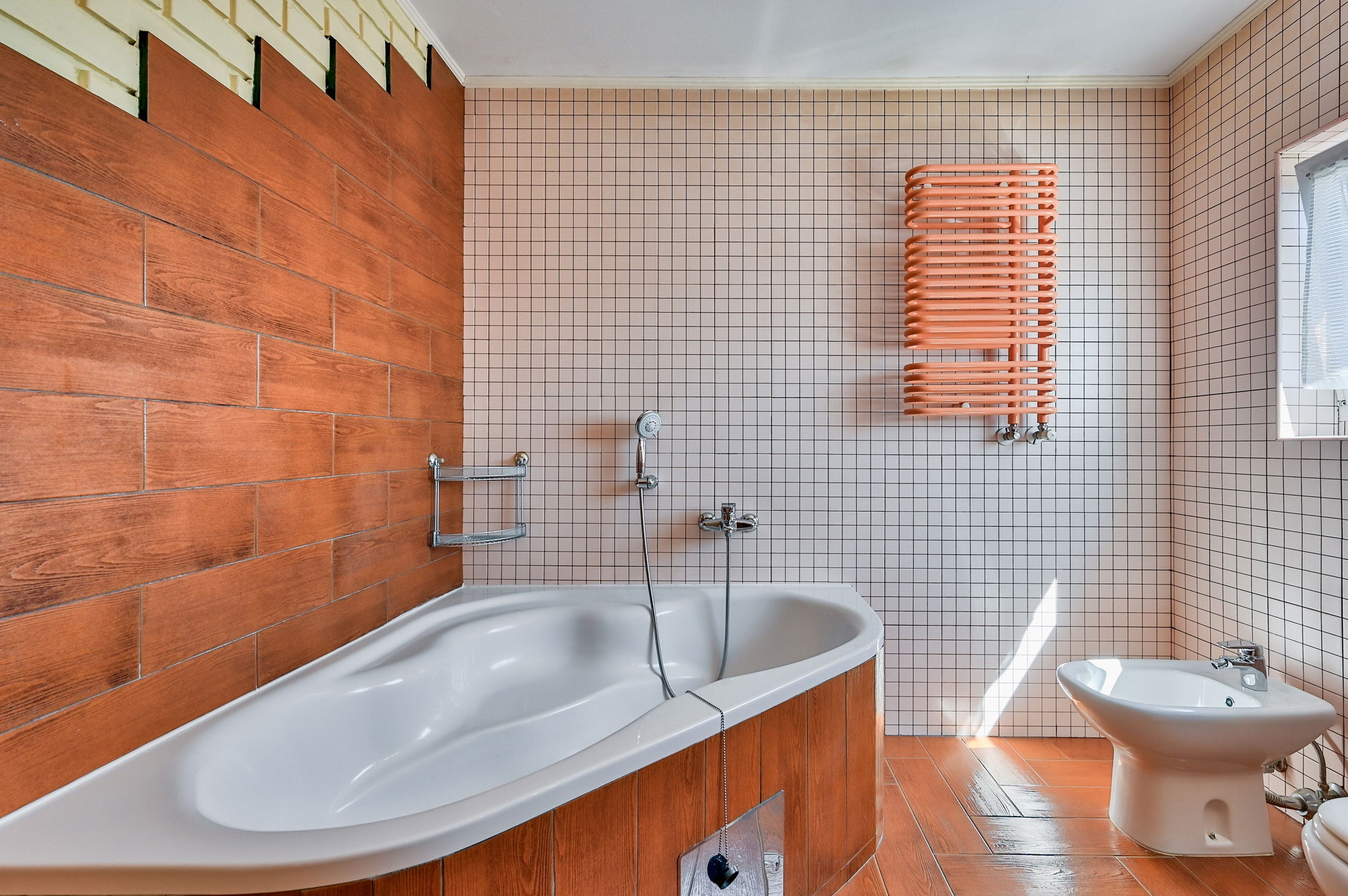 The apartment has two bathrooms, one with shower and one with a large bathtub, which is perfect for relaxing after a long day.