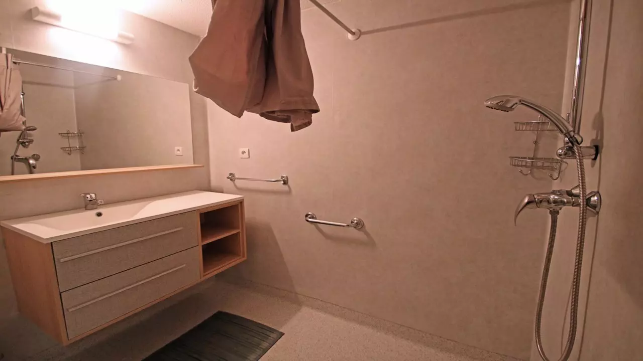 - Beds: one bedroom with double bed (140x190) and one cabin bedroom with two single beds (80x190) and storage shelves. Beds equipped with duvets