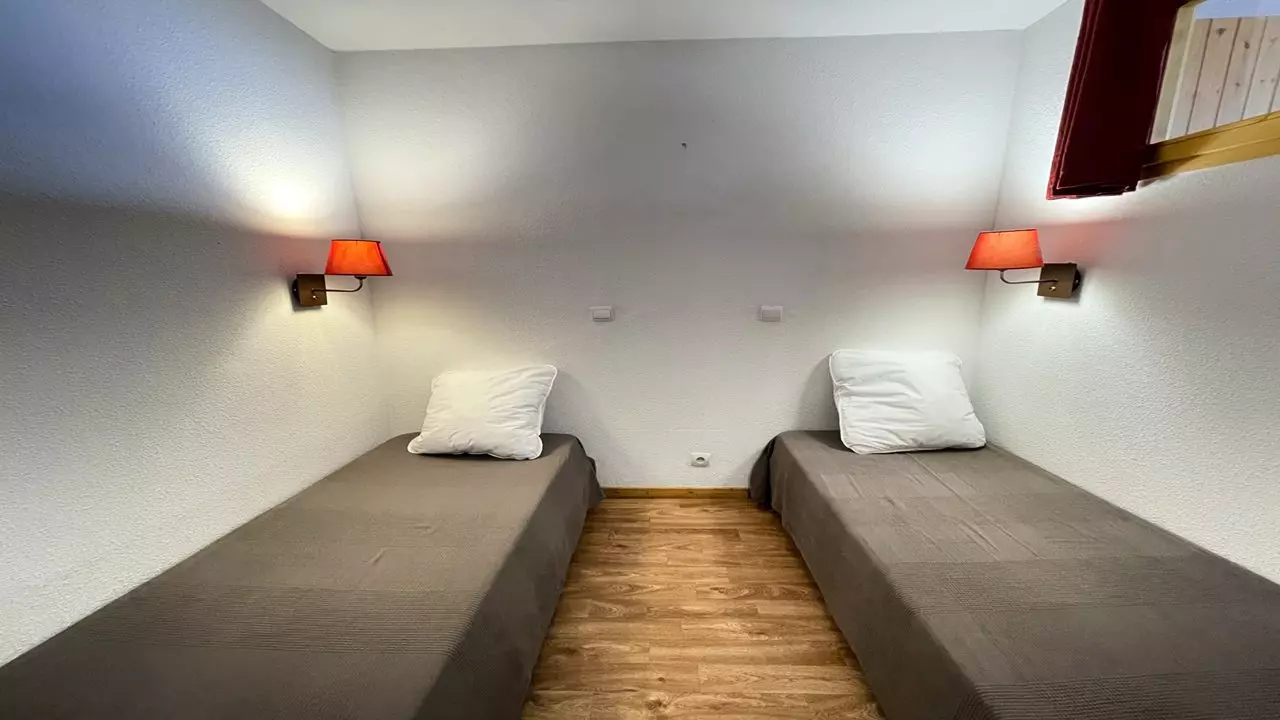 - Beds: one bedroom with double bed (140x190) and one cabin bedroom with two single beds (80x190) and storage shelves. Beds equipped with duvets