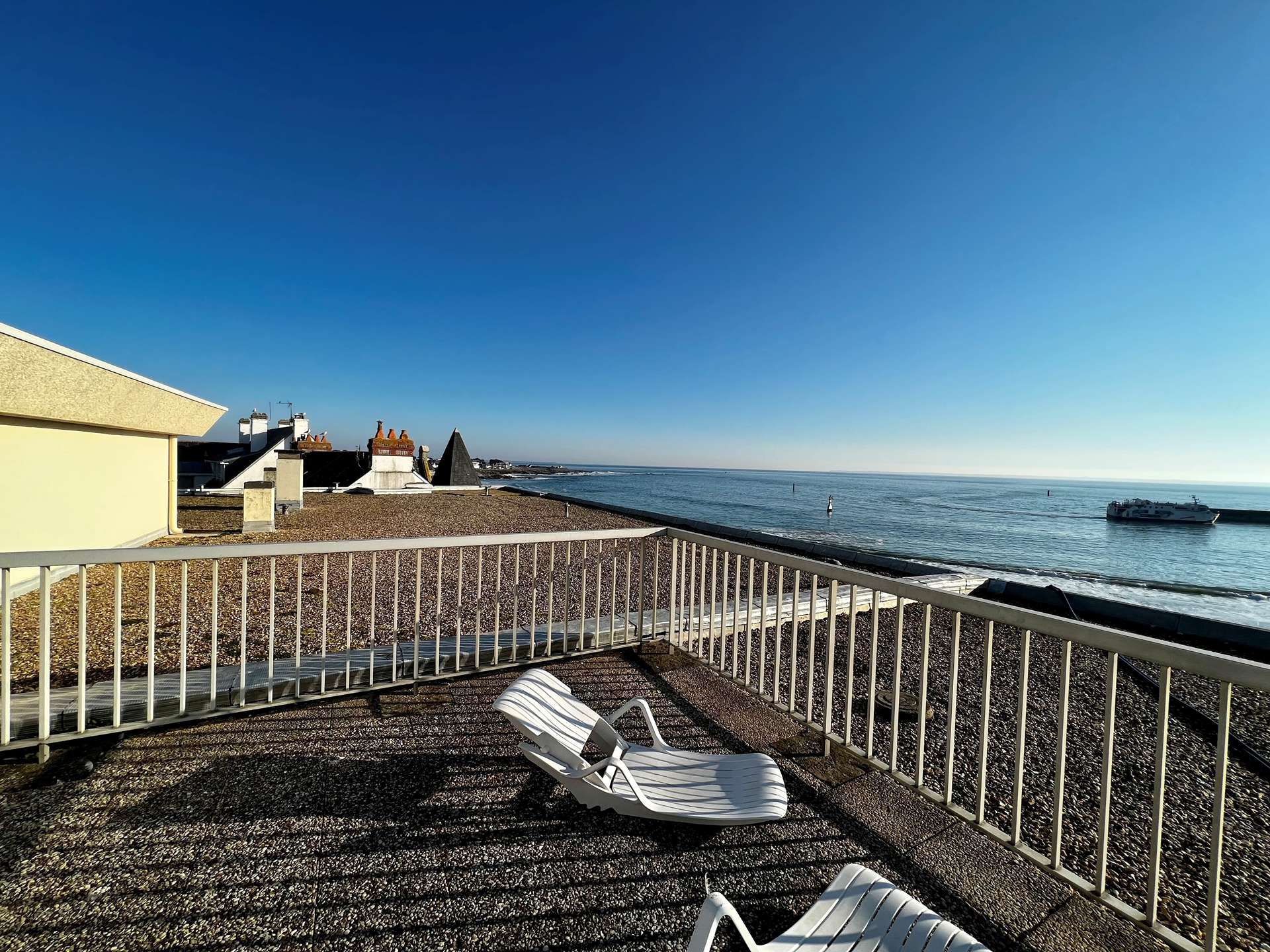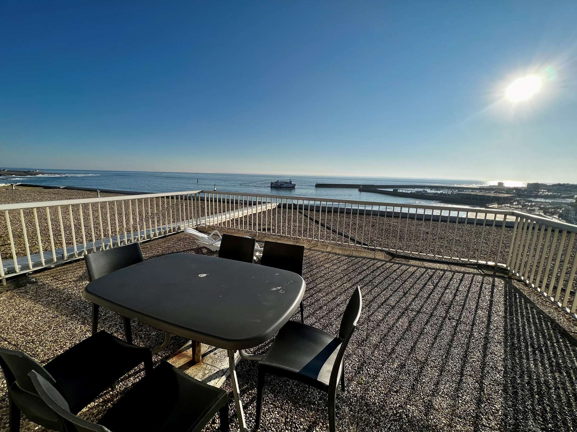 Large terrace with sea view and garden furniture.