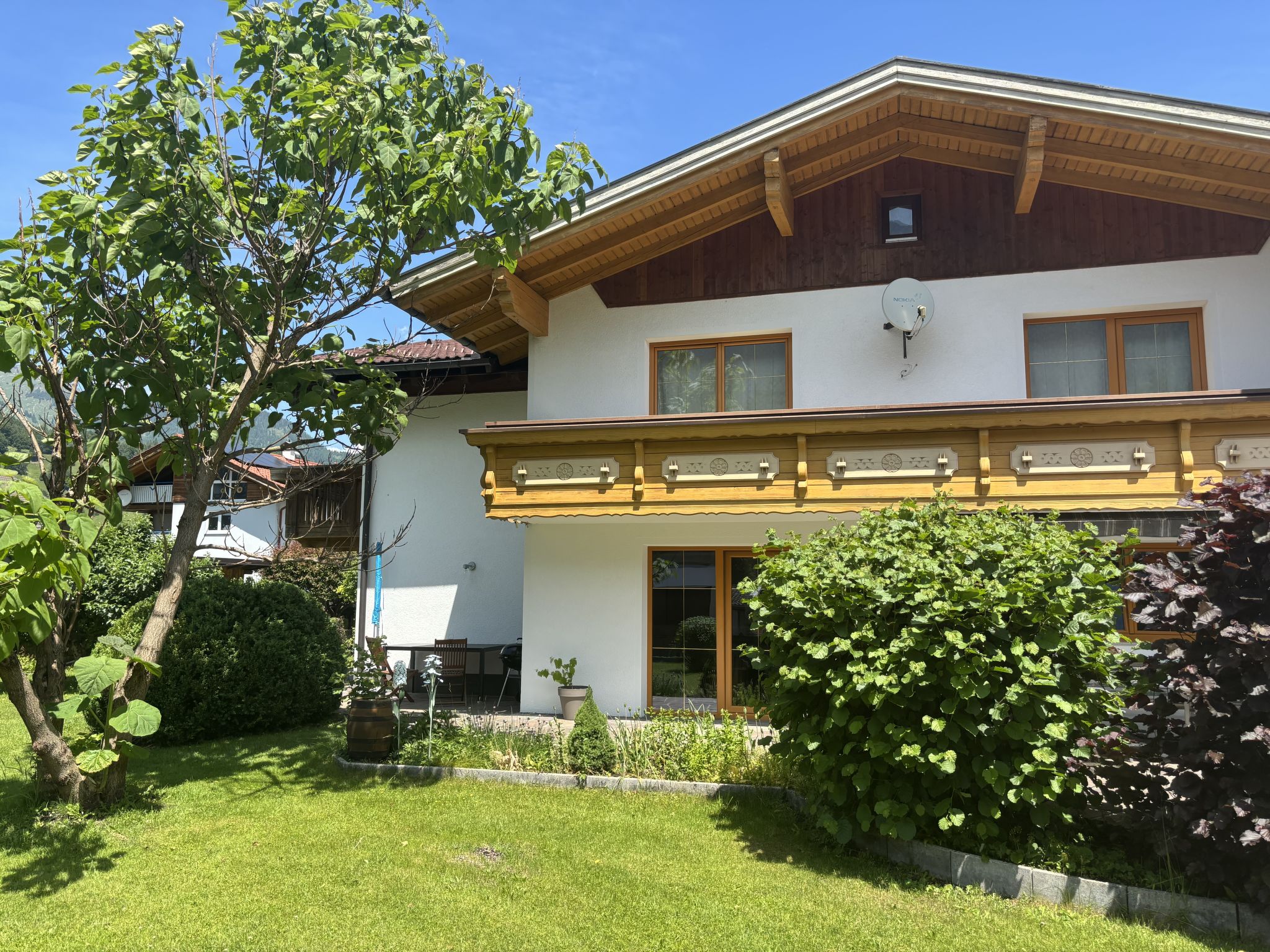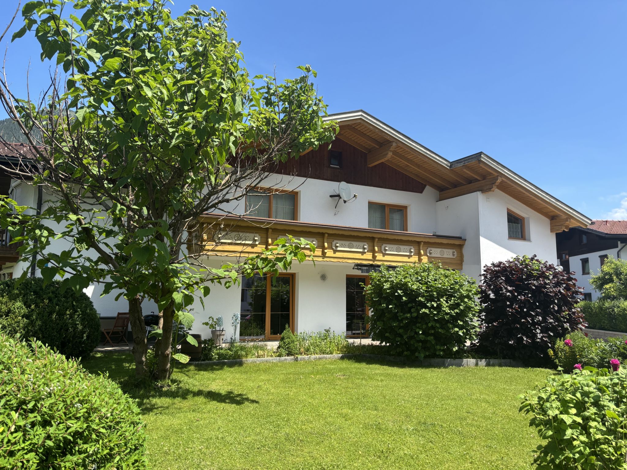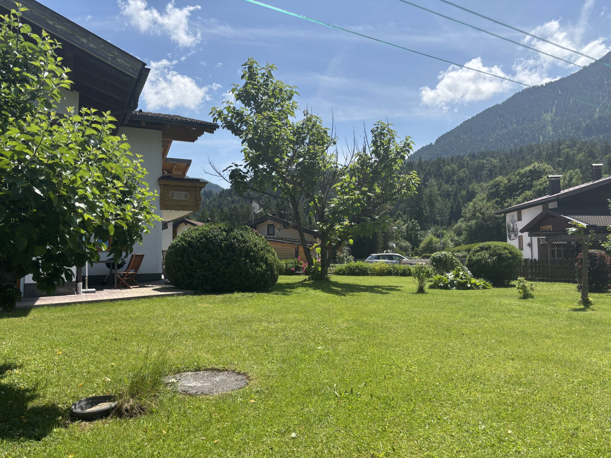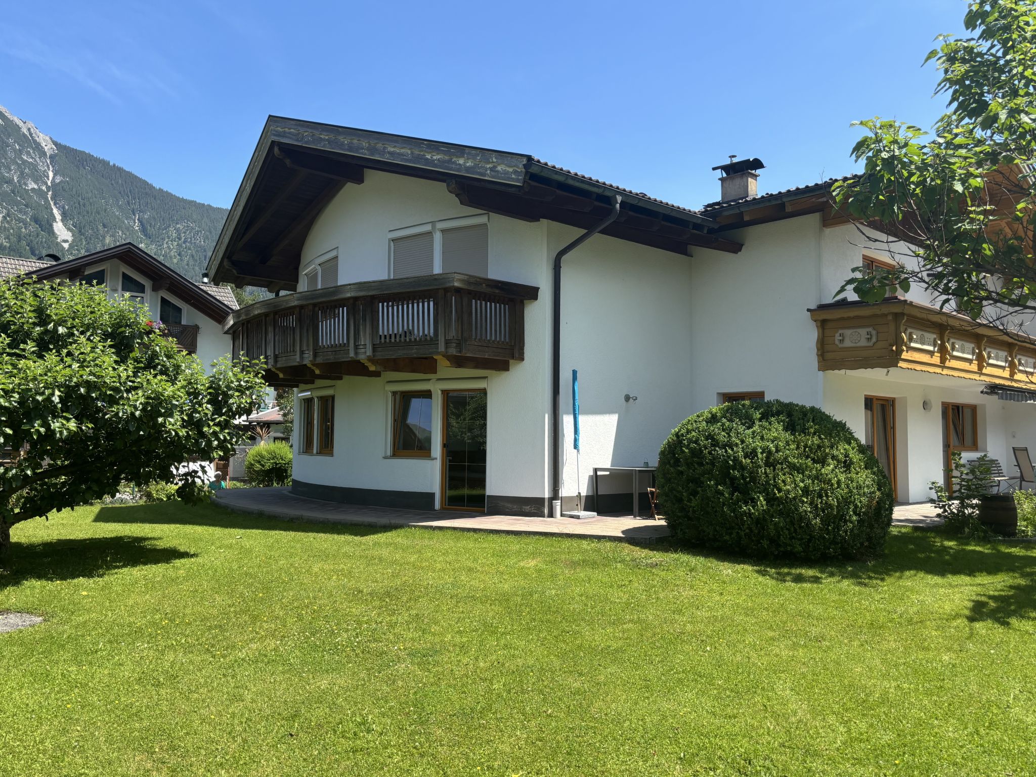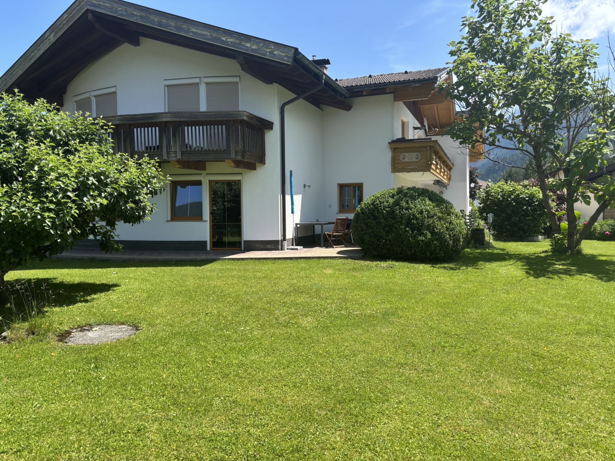 Weißenbach am Lech: Beautiful apartment house "Panoramablick". On the outskirts, in a quiet position, 8 km from the skiing area. For shared use: property 1'200 m2, garden 500 m2. Private: barbecue. In the house: washing machine, tumble dryer. Parking (for 4 cars). Carport. Grocery, supermarket, bakery, bus stop 300 m, railway station "Reutte" 10 km, thermal baths "AlpenTherme" 10 km. Golf course (18 hole) 20 km, skisport facilities 8 km, ski rental 8 km, ski school 8 km. Nearby attractions: Burg Ehrenberg 10 km, Highline 10 km, Tier-und Spielpark Bichlbach 15 km, Alpentherme Ehrenberg 10 km, Königliche Kristall Therme 28 km. Well-known ski regions can easily be reached: Hahnenkamm Reutte 8 km. Hiking paths: Lechweg. Please note: the owner lives in the same residence.