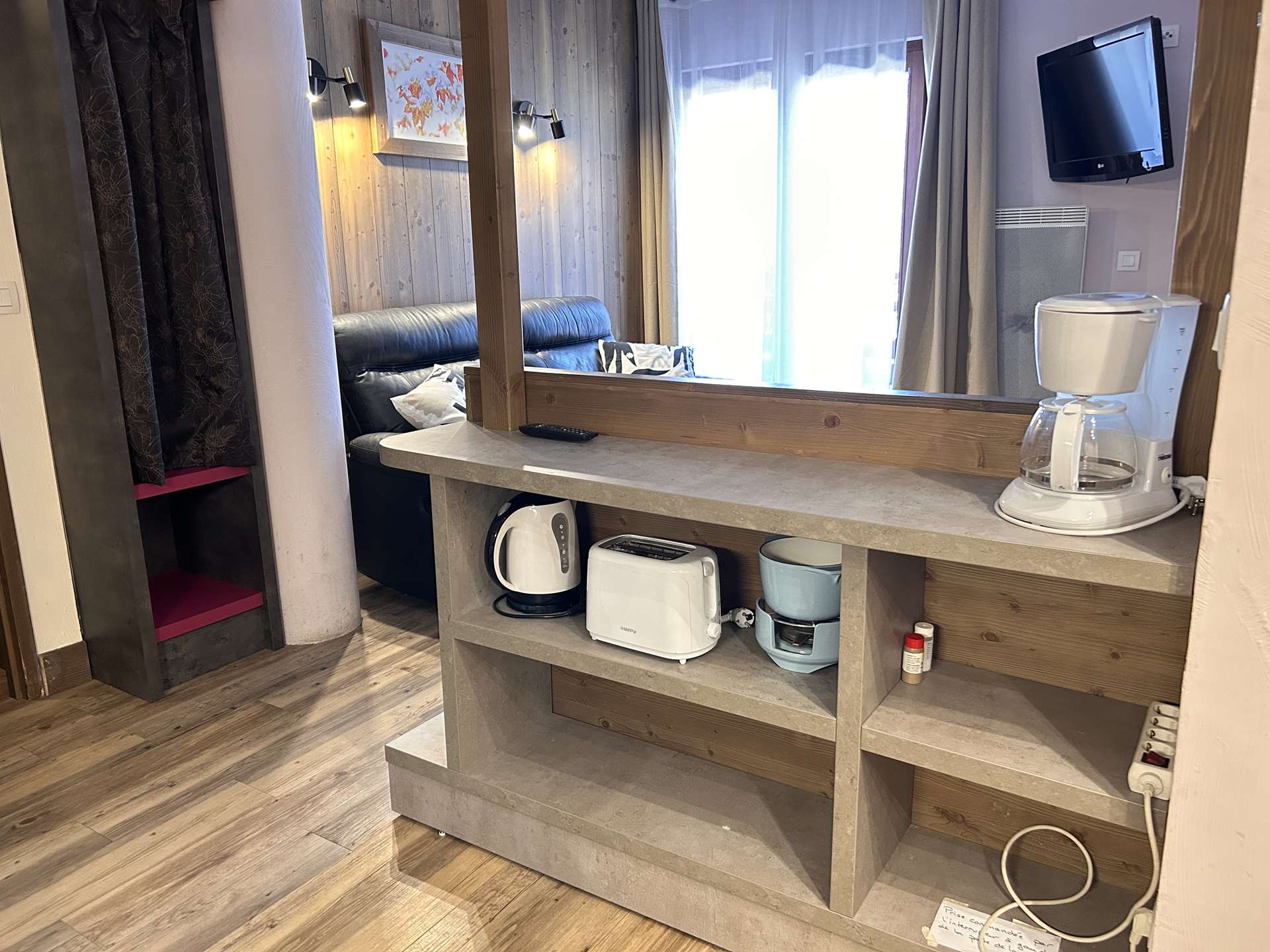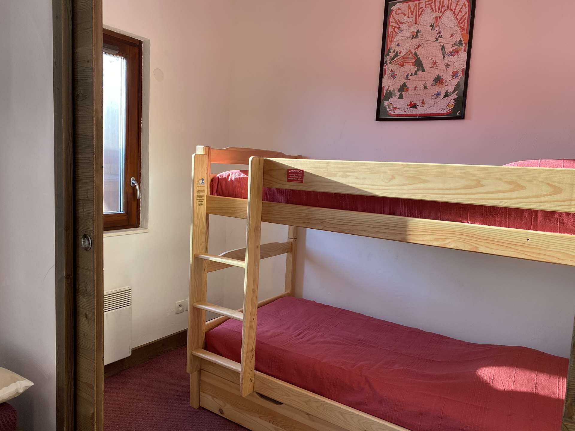 Located at the top of the resort, a few steps from the slopes, this vacation rental on the ground floor consists of a bedroom with a 160 cm bed, a single sofa bed and, separated by a sliding door, a single bed in a cabin.
