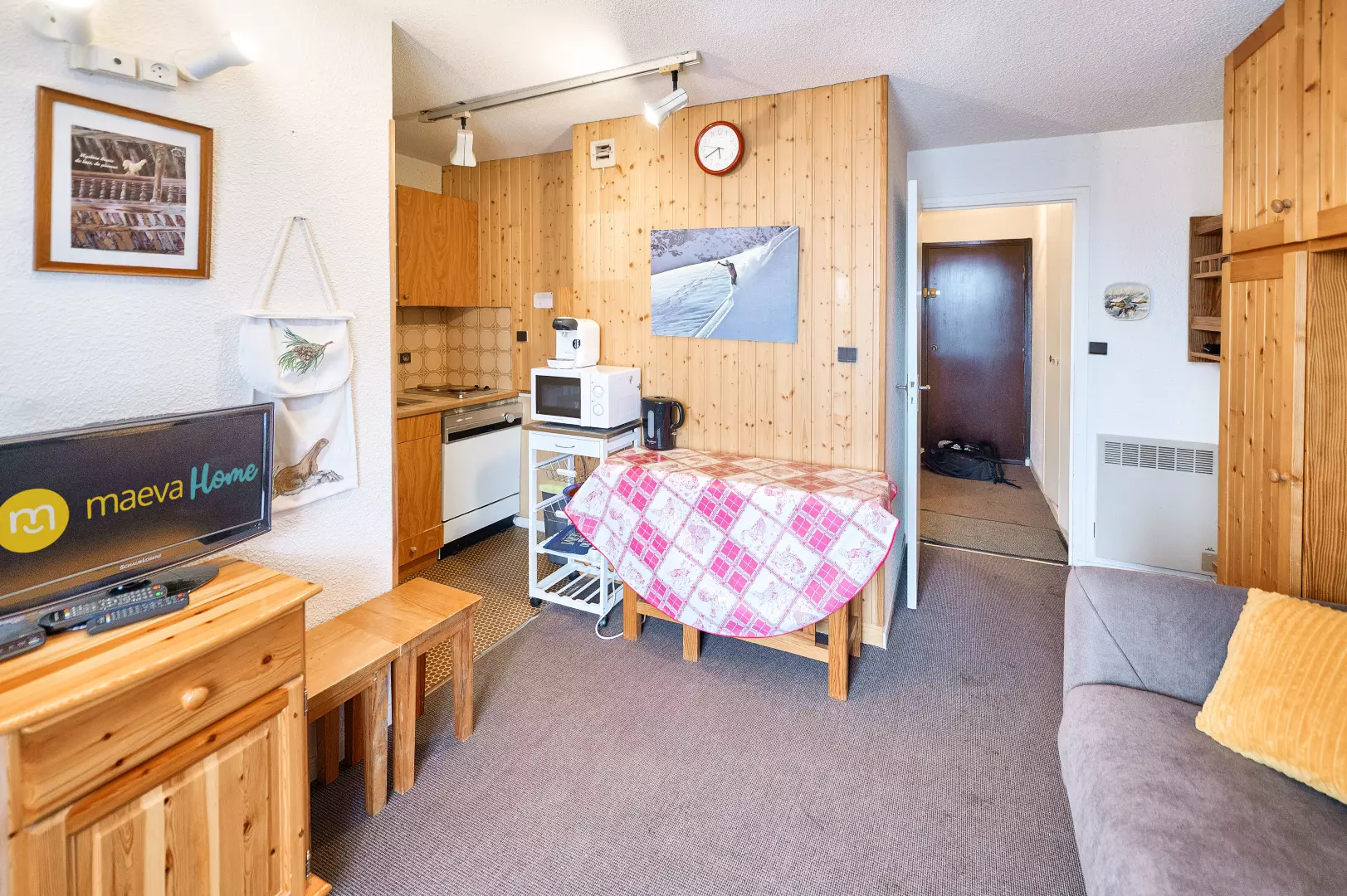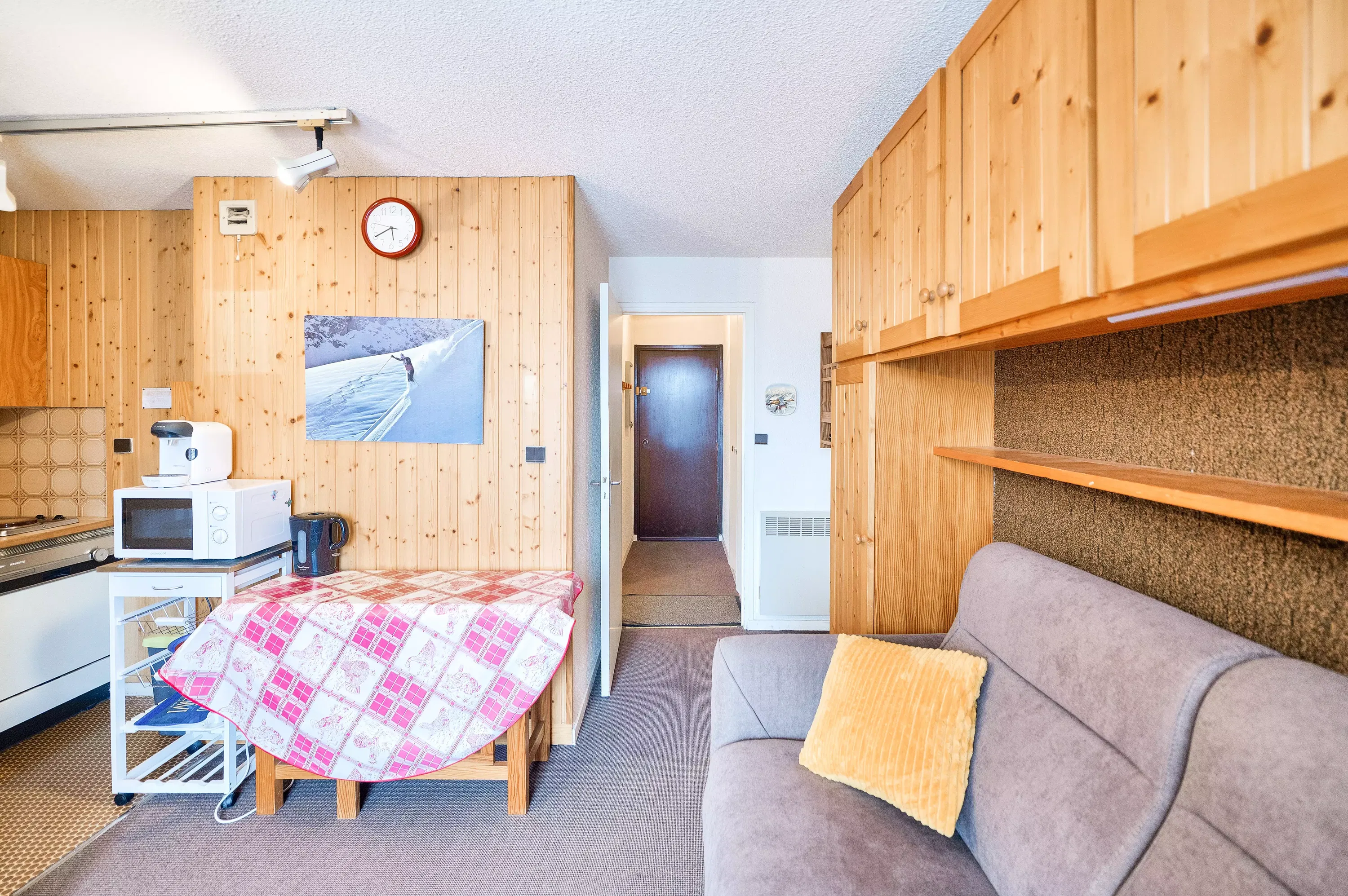 The advantages of your rental: Located in the heart of the village center, this apartment enjoys a prime location at the foot of the slopes, ideal for a hassle-free ski holiday. Situated on the 2nd floor with elevator access, it offers a lovely mountain view from the north-facing balcony. The functional layout includes a living room with a sofa bed, a separate sleeping alcove with bunk beds, a shower room with WC, and a semi-open kitchen. A ski locker completes the amenities. Less than 100 meters from shops, activities, and ski lifts, this accommodation provides a convenient and sought-after base for a mountain holiday, right at the foot of the slopes and in the heart of the resort.