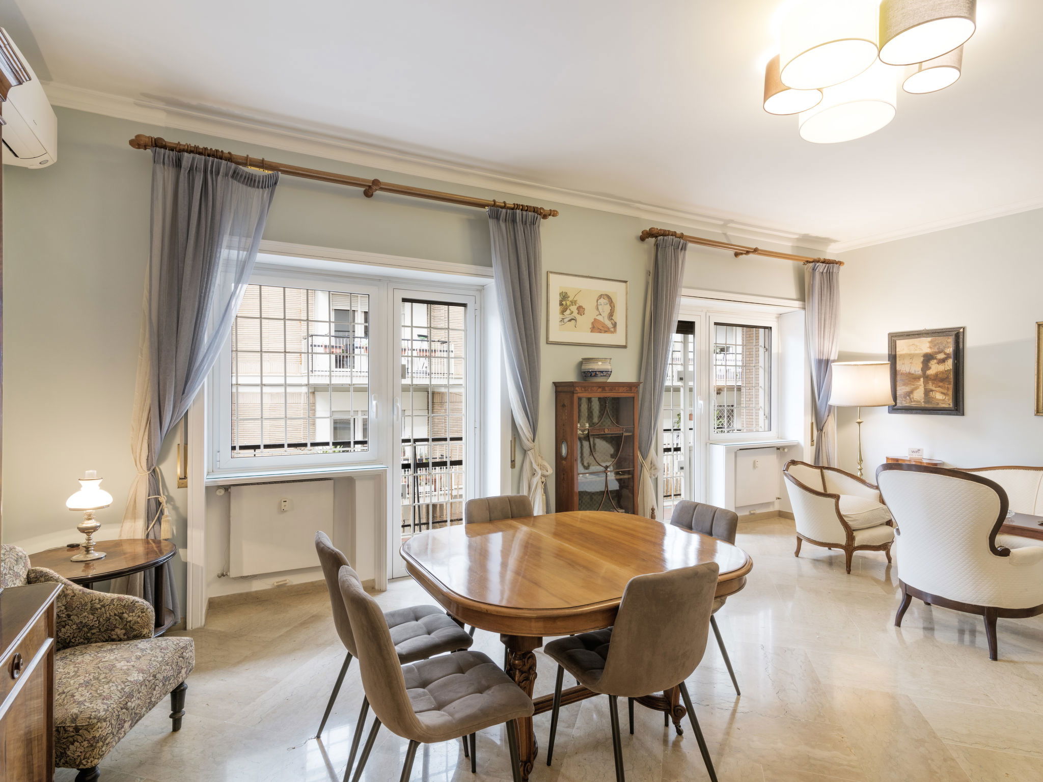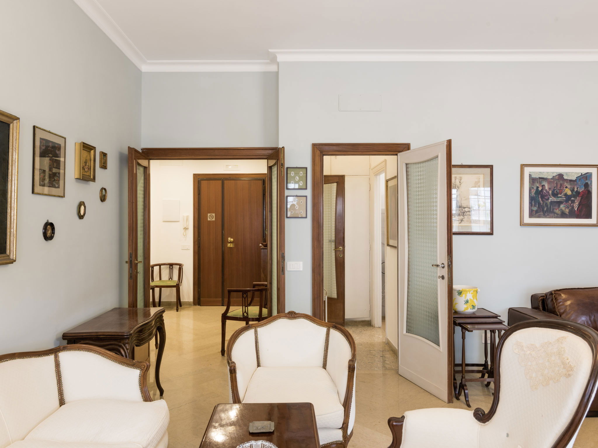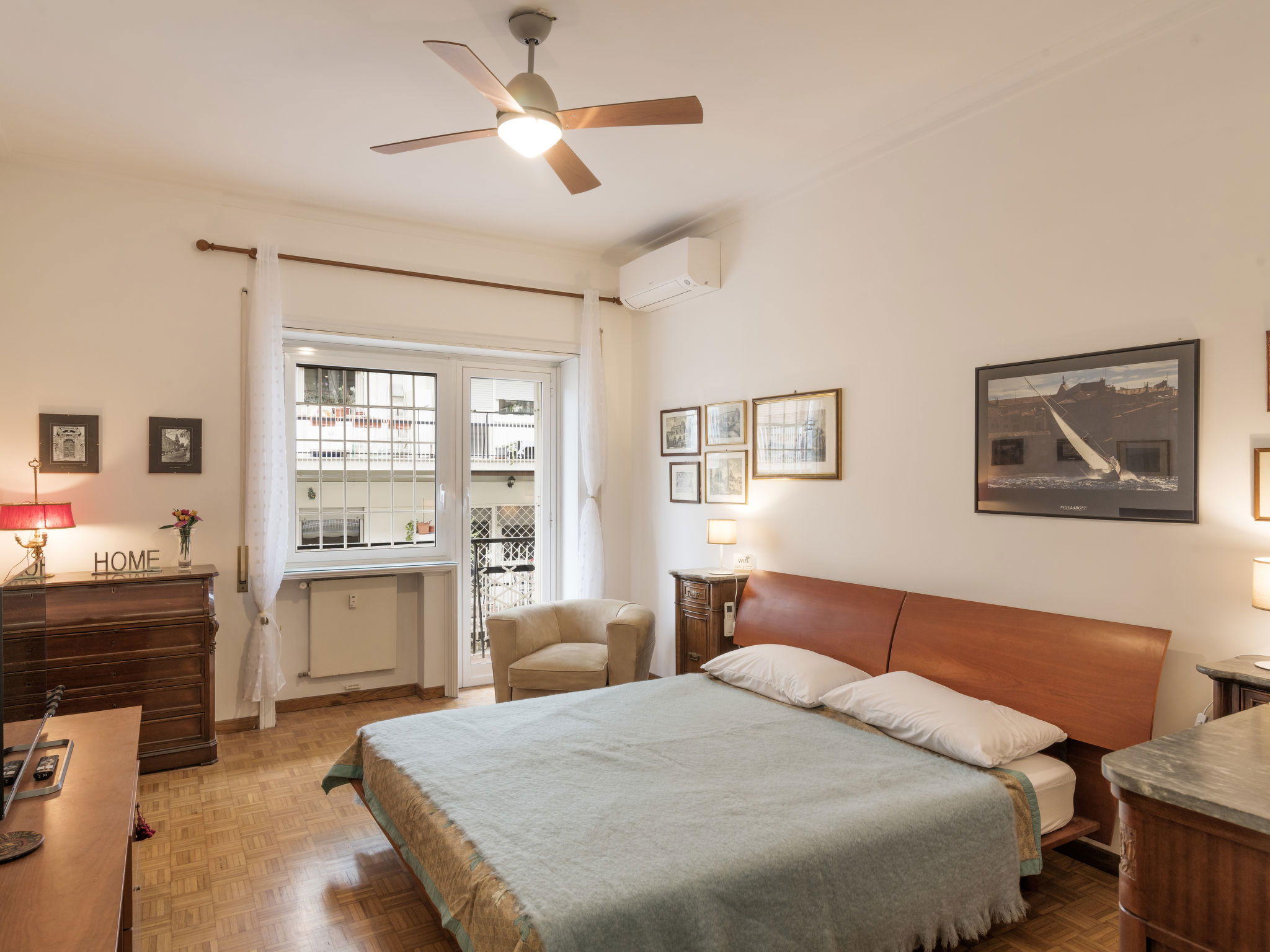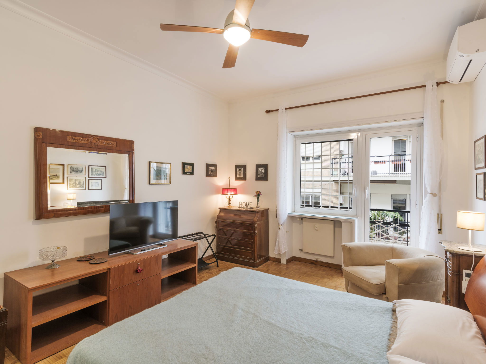 "AMP Vatican Home", 4-room apartment 140 m2 on 3rd floor. Spacious and bright, comfortable and cosy furnishings: living room with 1 double sofabed. Exit to the balcony. Entrance hall. 1 room with 1 double bed and TV. 1 room with 1 double bed. Kitchen-/living room (4 hot plates, oven, dishwasher, kettle, microwave, freezer, electric coffee machine, Capsules for coffee machine (2) free) with dining table. 2 bathrooms, 2 showers/bidet/WC. Heating, air-conditioning. Parquet floors. 3 balconies. Facilities: washing machine, iron, baby cot, hair dryer. Internet (WiFi, free). Please note: non-smokers only. Maximum 1 pet/ dog allowed. Fire extinguisher. IT058091C2S7YRWVNX
