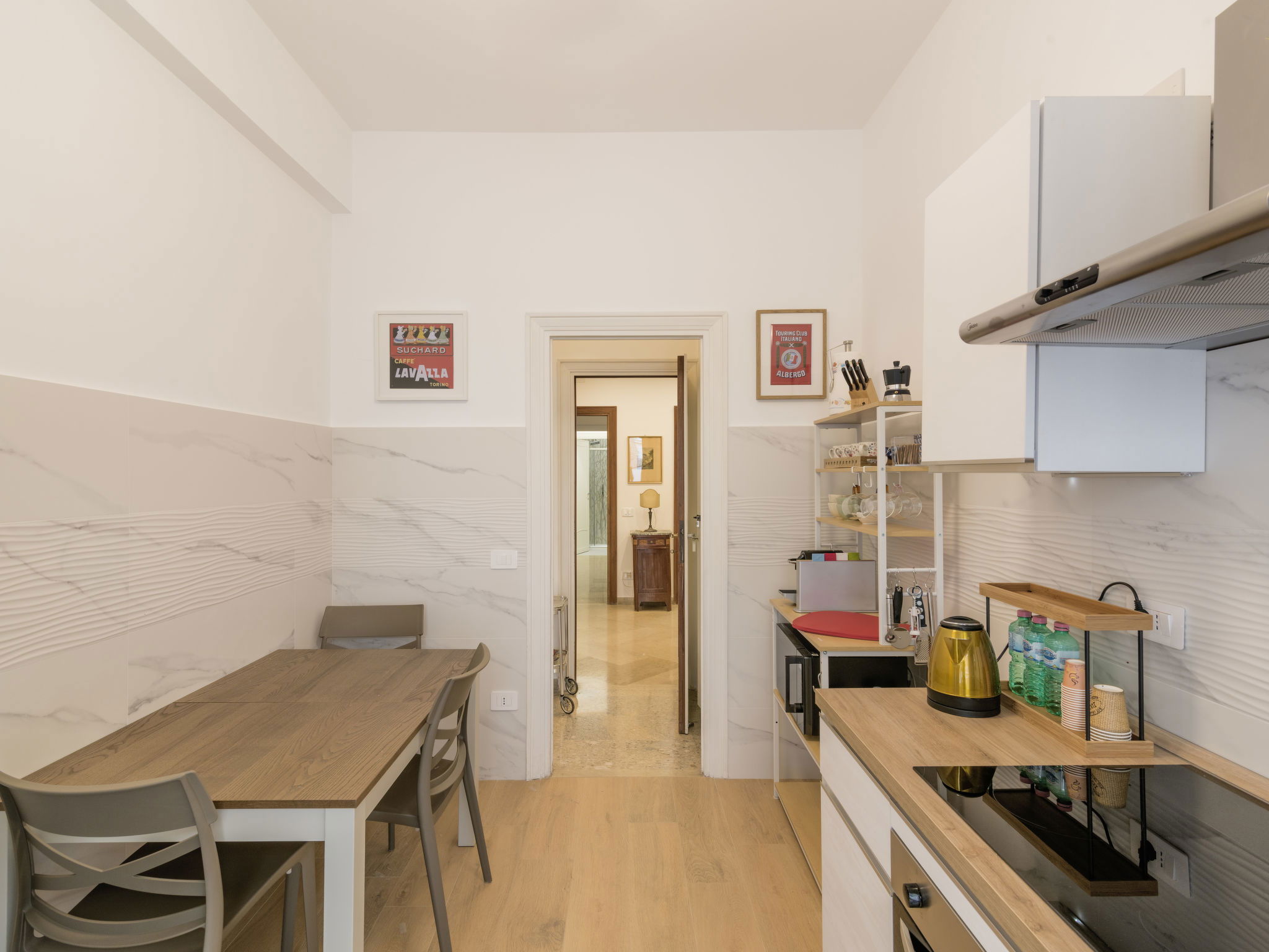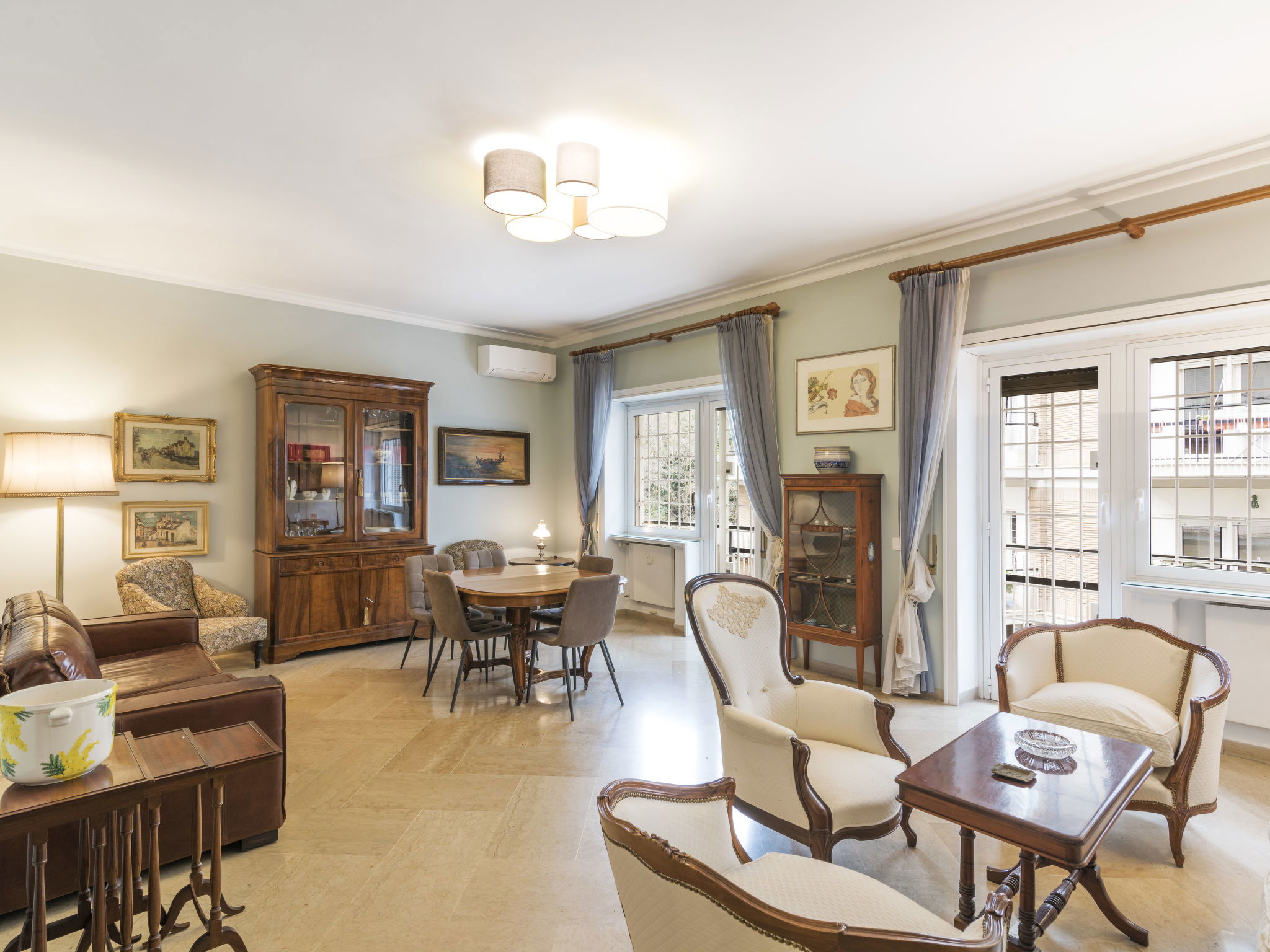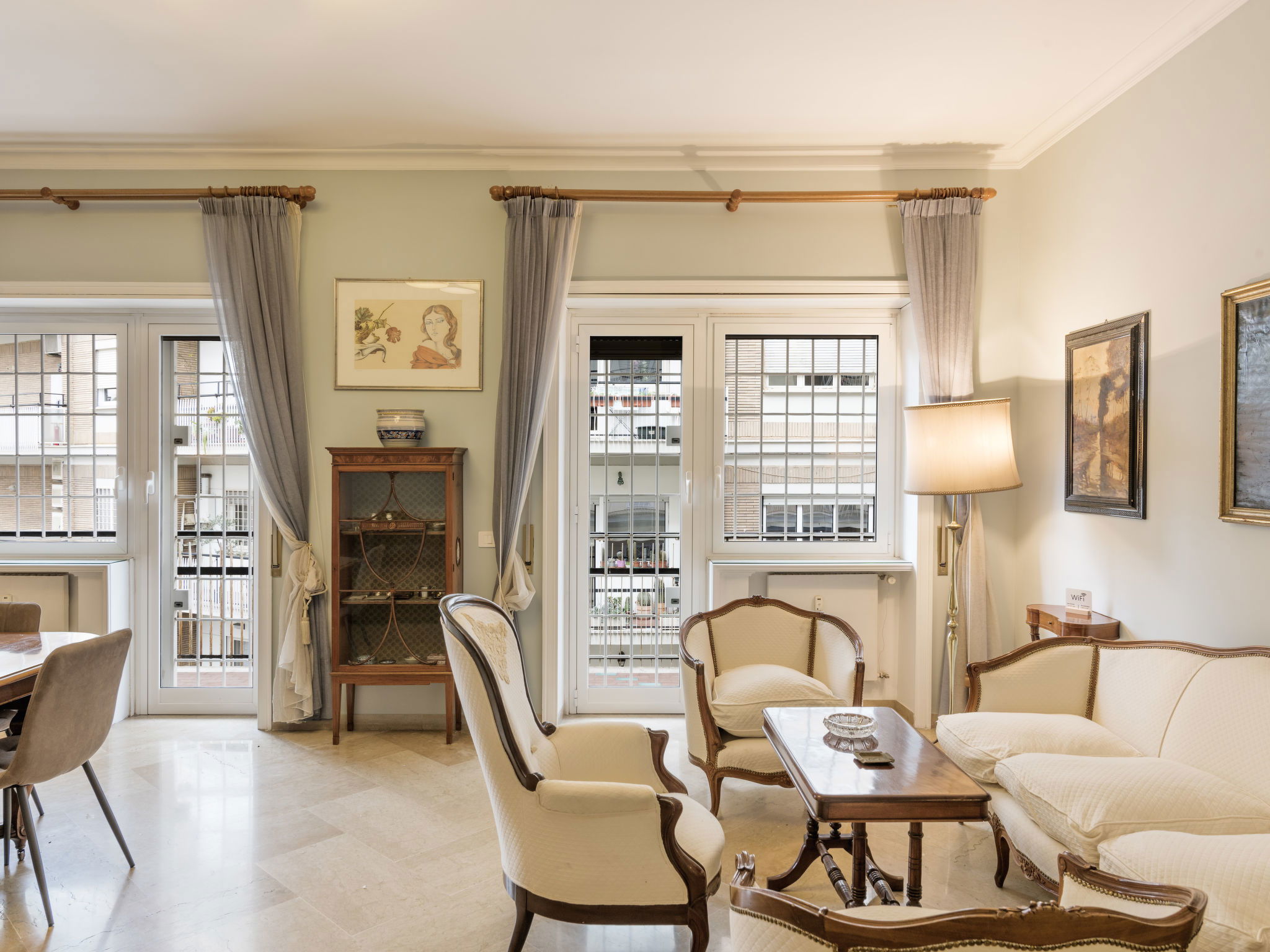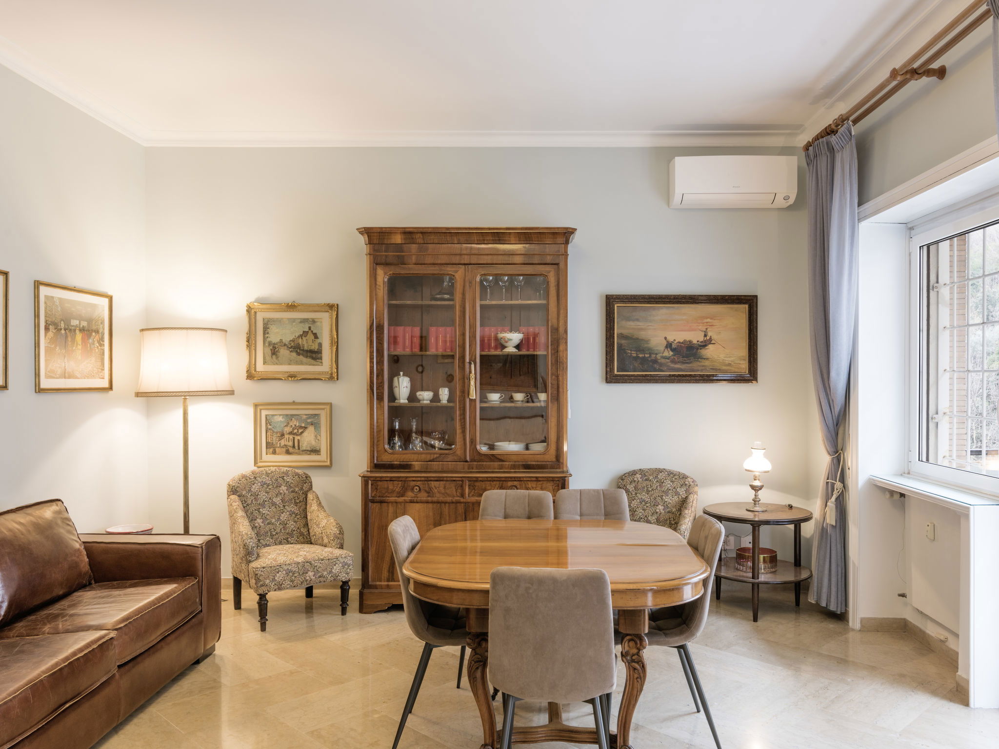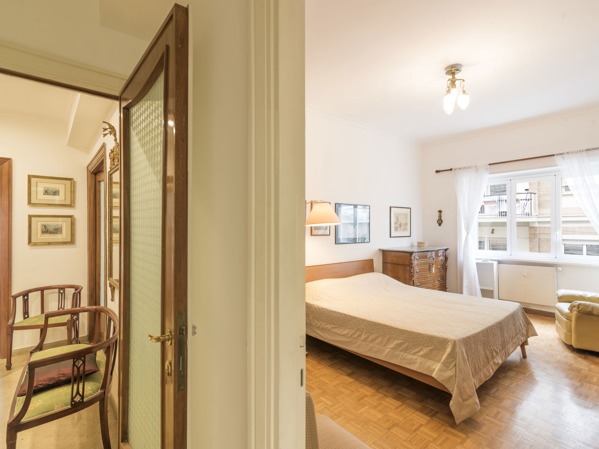 "AMP Vatican Home", 4-room apartment 140 m2 on 3rd floor. Spacious and bright, comfortable and cosy furnishings: living room with 1 double sofabed. Exit to the balcony. Entrance hall. 1 room with 1 double bed and TV. 1 room with 1 double bed. Kitchen-/living room (4 hot plates, oven, dishwasher, kettle, microwave, freezer, electric coffee machine, Capsules for coffee machine (2) free) with dining table. 2 bathrooms, 2 showers/bidet/WC. Heating, air-conditioning. Parquet floors. 3 balconies. Facilities: washing machine, iron, baby cot, hair dryer. Internet (WiFi, free). Please note: non-smokers only. Maximum 1 pet/ dog allowed. Fire extinguisher. IT058091C2S7YRWVNX