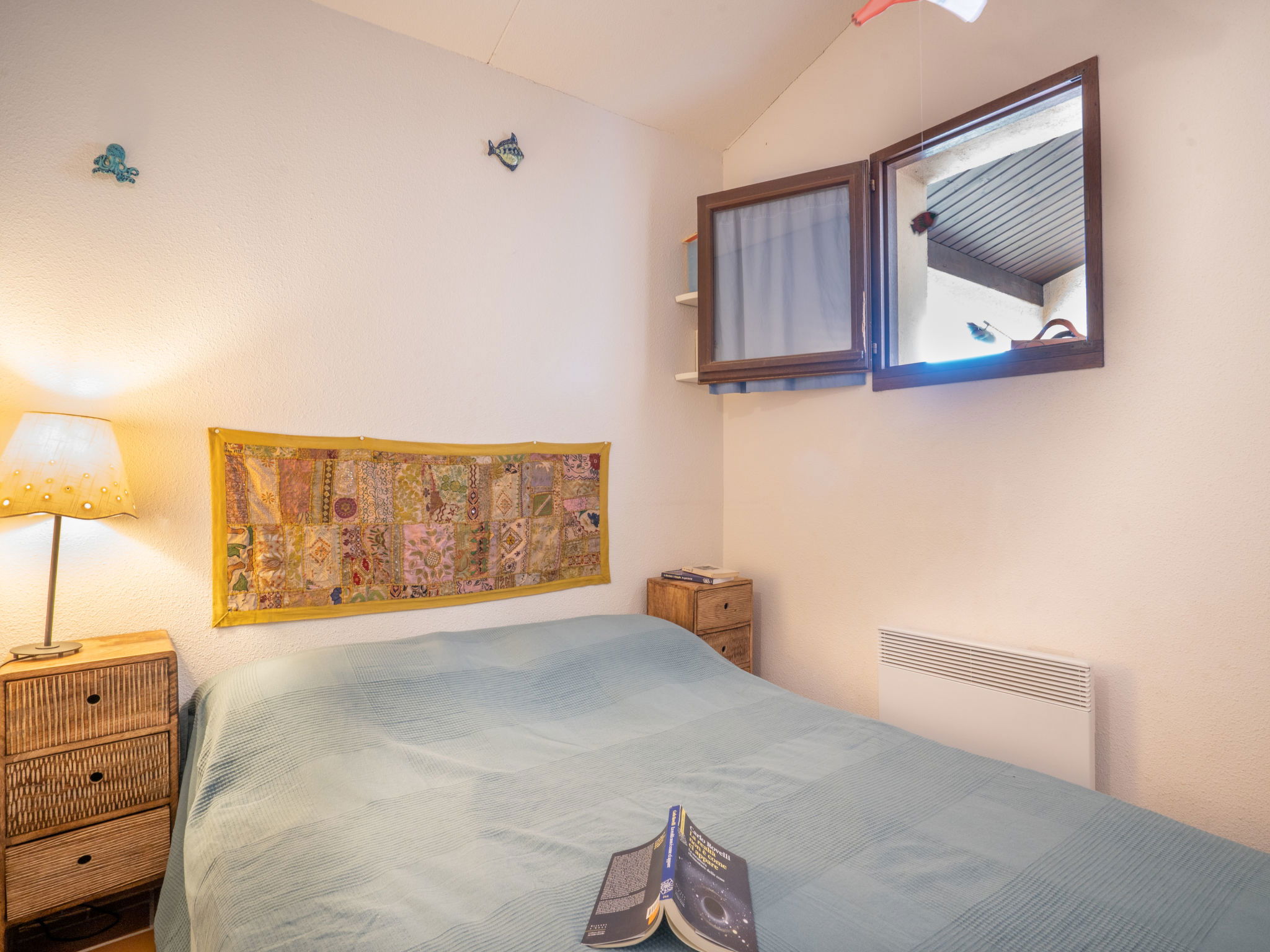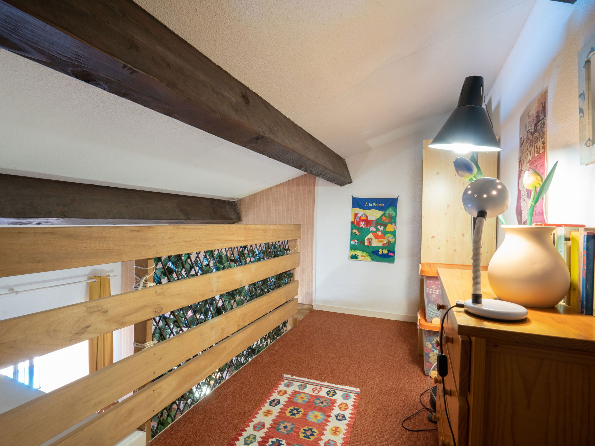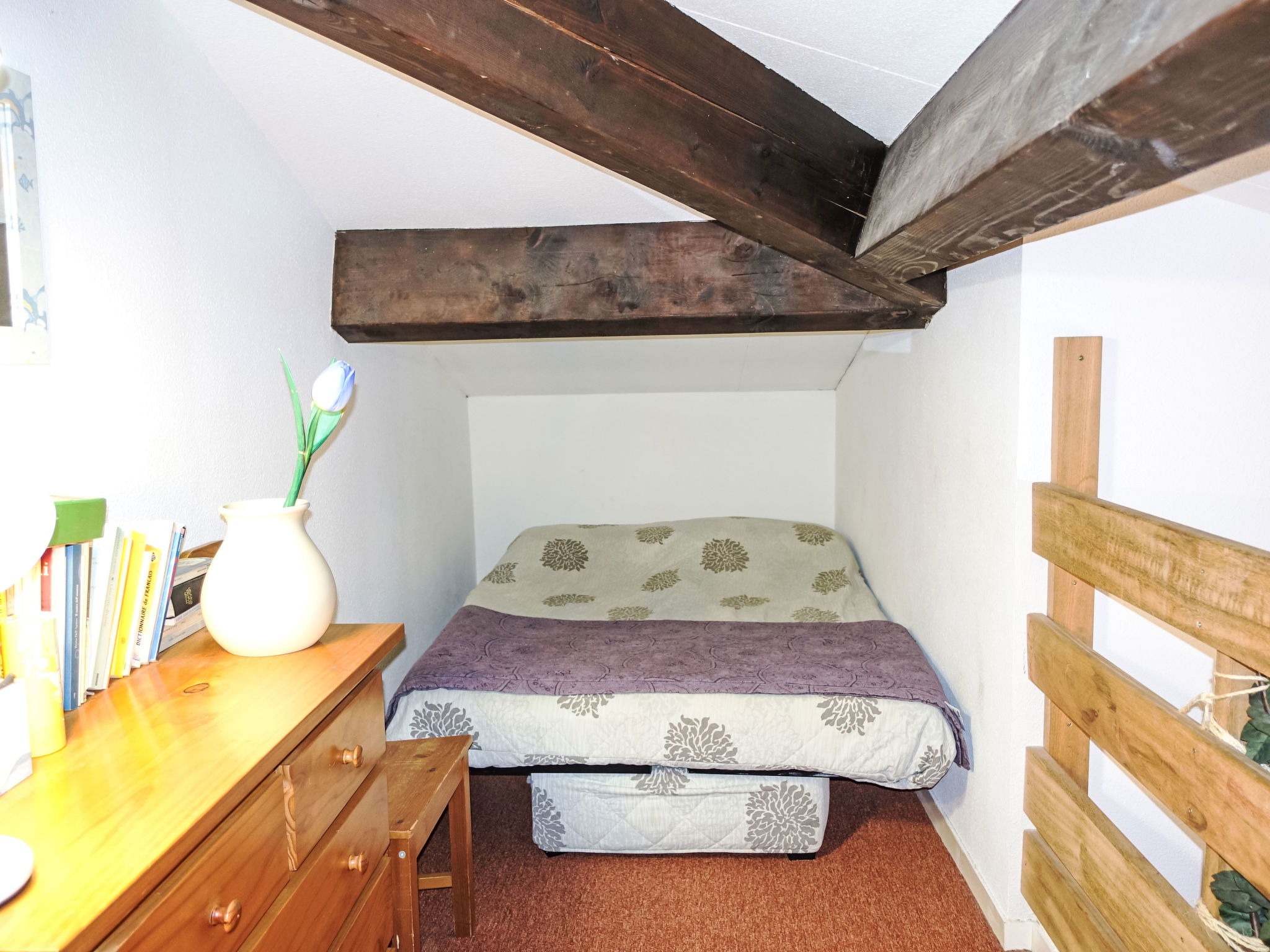 2-room apartment 27 m2 on 2nd floor, east facing position. Simple furnishings: living/dining room with panoramic window with 1 double sofabed (1 x 140 cm, length 190 cm), kitchen corner and TV (flat screen), fan. Exit to the balcony. 1 room with 1 french bed (140 cm, length 190 cm), fan. Small kitchenette (4 hot plates, mini-oven, toaster, kettle, microwave, freezer, electric coffee machine). Exit to the balcony. Shower, sep. WC. Heating. Upper floor: gallery with sloping ceilings with 2 sleeping facilities (2 x 80 cm, length 190 cm). Balcony 5 m2. Balcony furniture. Beautiful view of the valley and the swimming pool. Facilities: iron, hair dryer. Internet (WiFi, extra). Reserved parking space n 140 (1 car). Please note: 1 pet/ dog allowed. TV only FR. Smoke alarm, no lift. Offer by a private individual according to Art. 155, IV of CGI. 8310700112481