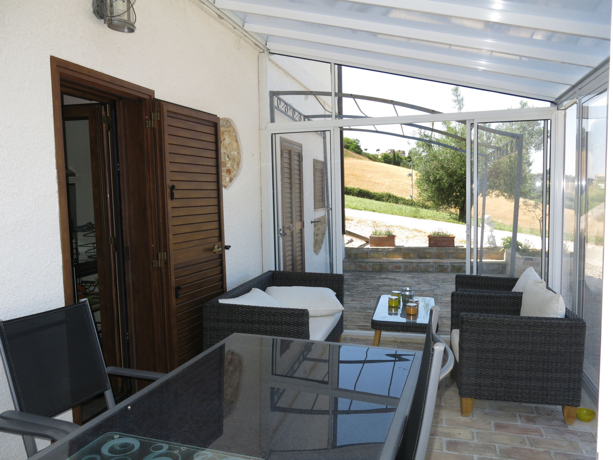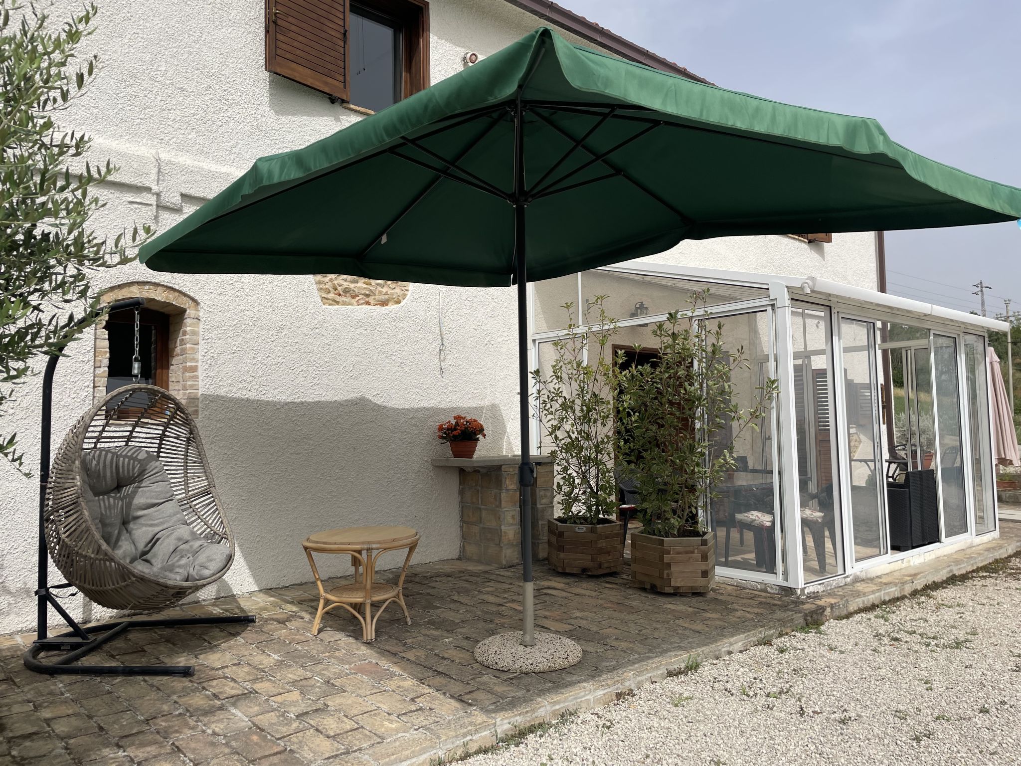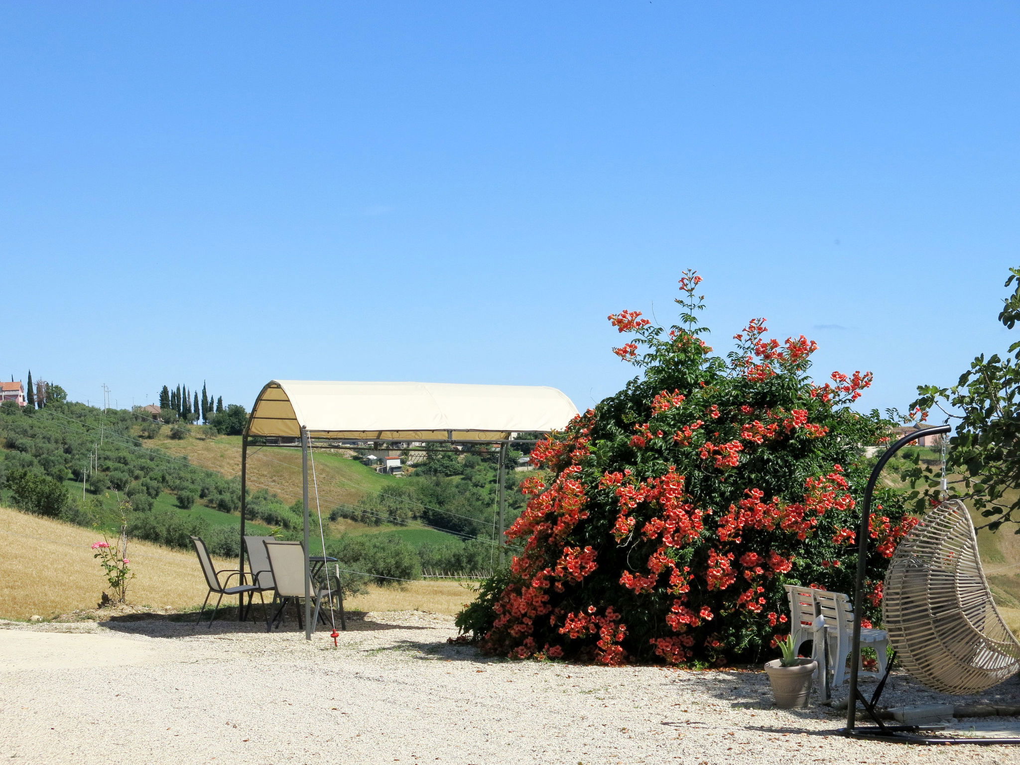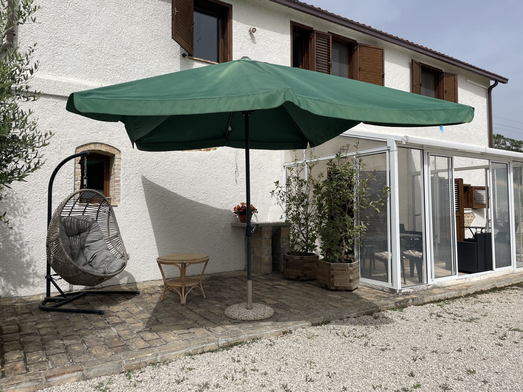 Very beautiful, rustic, comfortable country house "Serrani", renovated in 2018, surrounded by meadows and fields. 2 houses in the residence. 4 apartments in the residence. 8 km from the centre of Roseto degli Abruzzi, 13 km from the centre of Giulianova, 17 km from the centre of Pineto, in a secluded, sunny position on a slope, 6 km from the sea, in the countryside. For shared use: natural state property 5 ha, beautiful terraced garden, 5'000 m2 (not fenced) with plants and trees, orchard, lawn for sunbathing, swimming pool (above ground) (10 x 5 m, depth 130 cm, seasonal availability: 01.Jun. - 28.Sep.). Patio, arbour, pergola, garden furniture, barbecue. In the complex: hot tub (extra). Washing machine (for shared use). 100 m long bumpy motor access to the house. Stepped path to the house. Parking on the premises. Shop 1 km, supermarket 8 km, bus stop 500 m, railway station "Roseto degli Abruzzi" 8 km, sandy beach 6 km. Local sale of farm products. Please note: Additional accommodations can be booked.