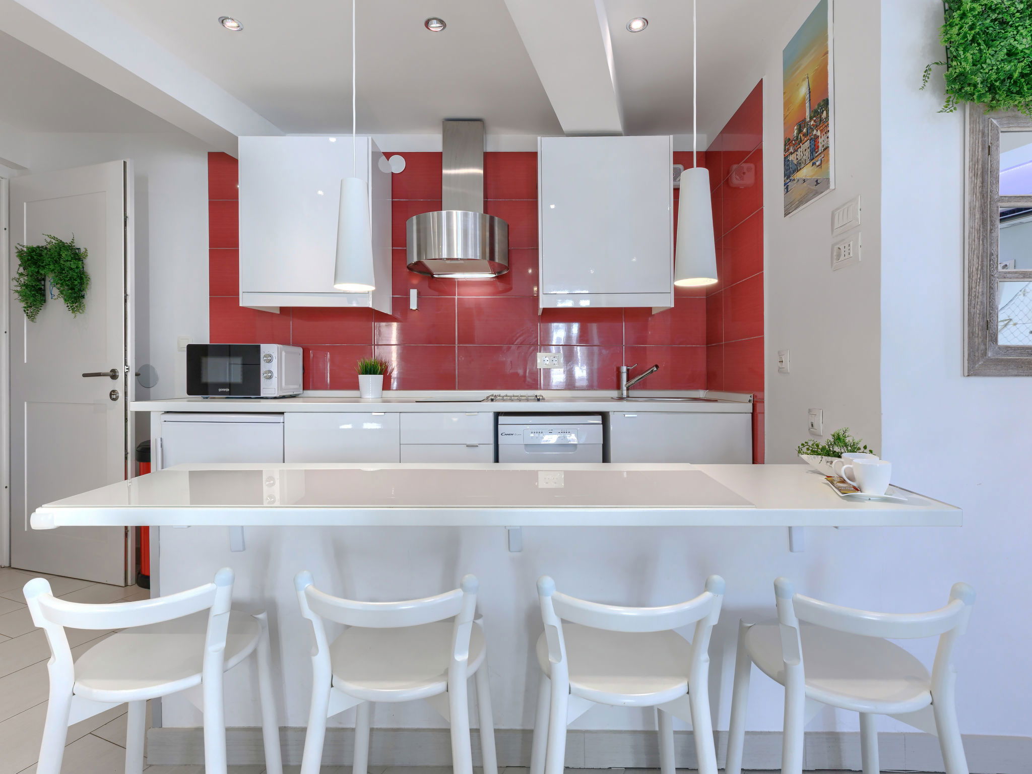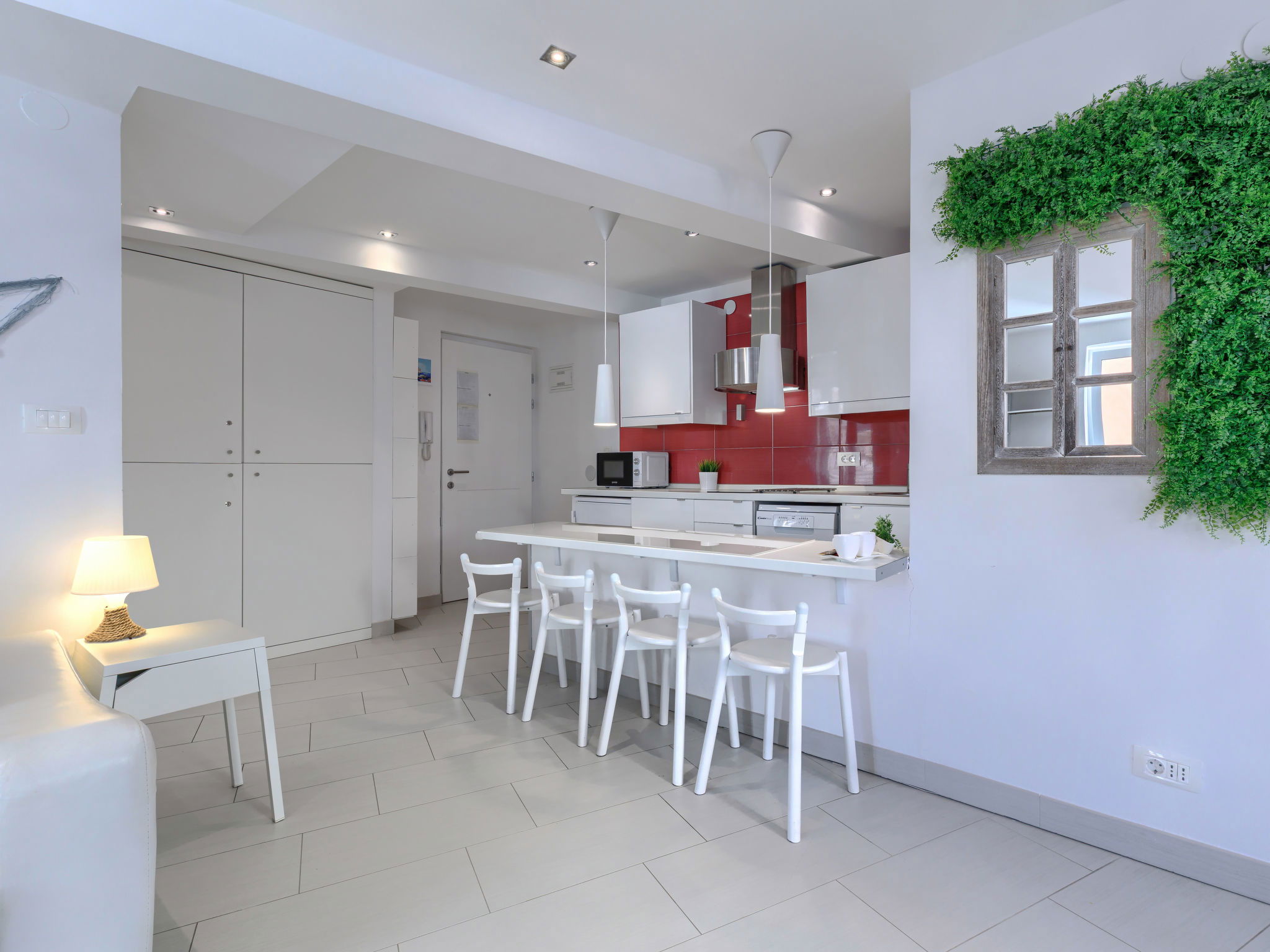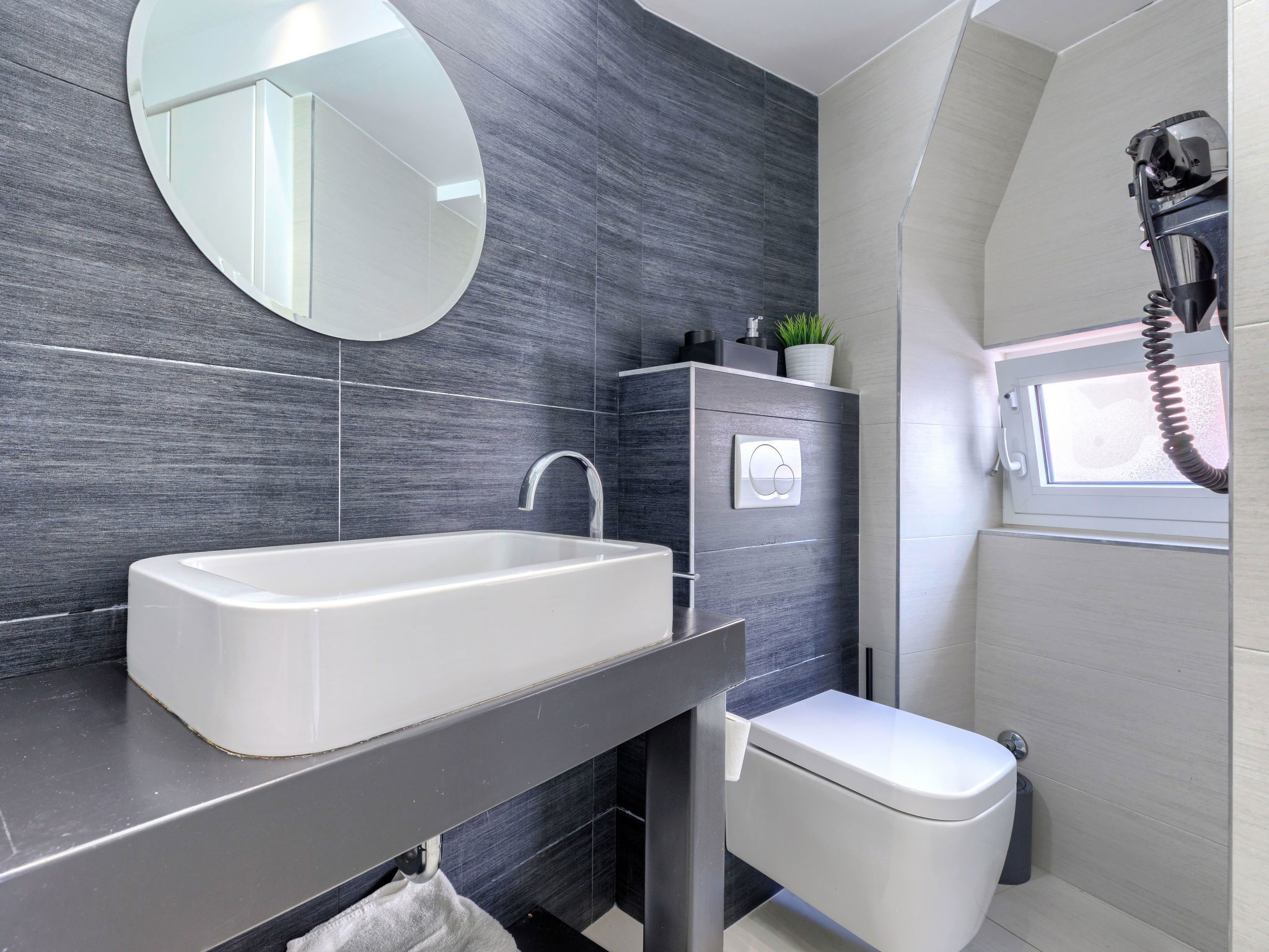 "Ambient", 2-room apartment 45 m2, on the upper floor. Bright, modern and tasteful furnishings: living/dining room with 1 double sofabed (160 cm, length 200 cm), TV and air conditioning. 1 room with 1 french bed (160 cm, length 200 cm). Open kitchen (2 hot plates, dishwasher, toaster, kettle, microwave, electric coffee machine). Shower/WC with corner bath. Forced-air heating. Facilities: washing machine, safe, iron, hair dryer. Internet (WiFi, free). Maximum 1 small pet/ dog allowed.