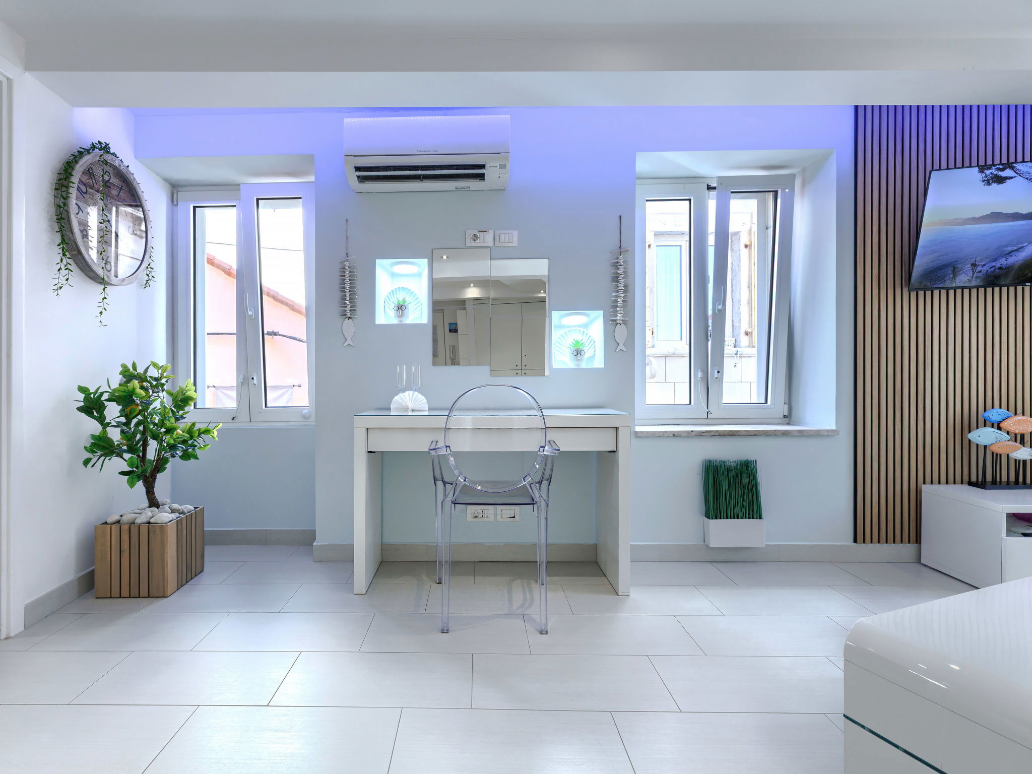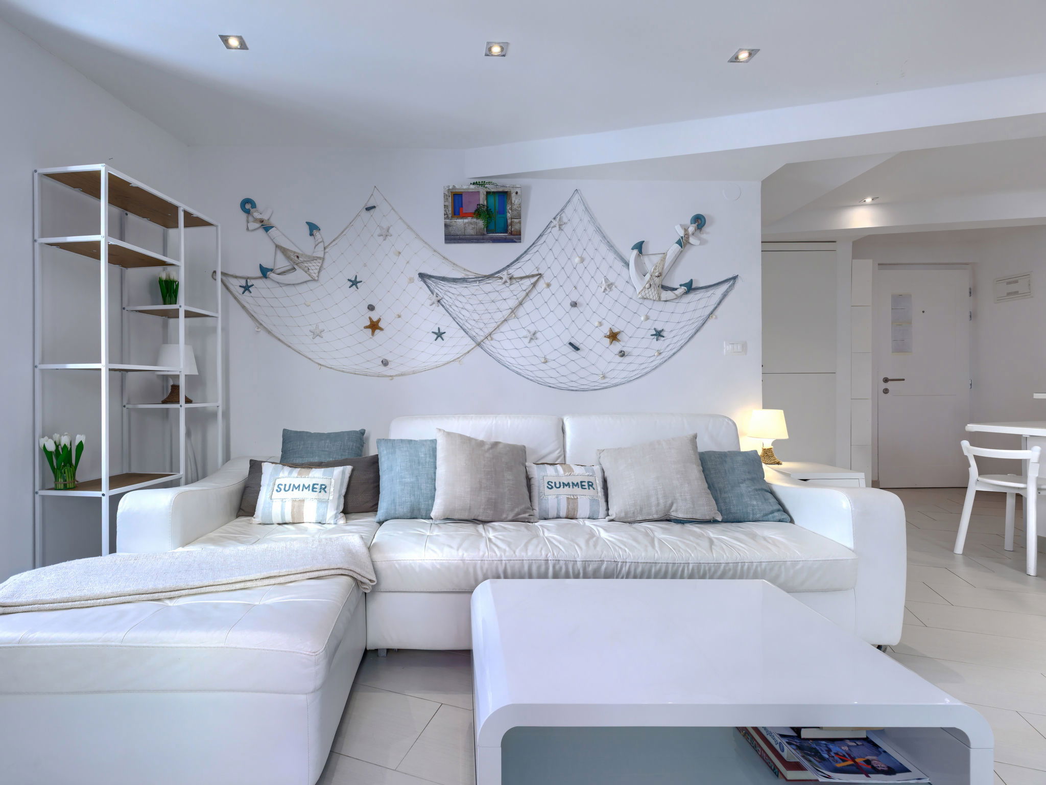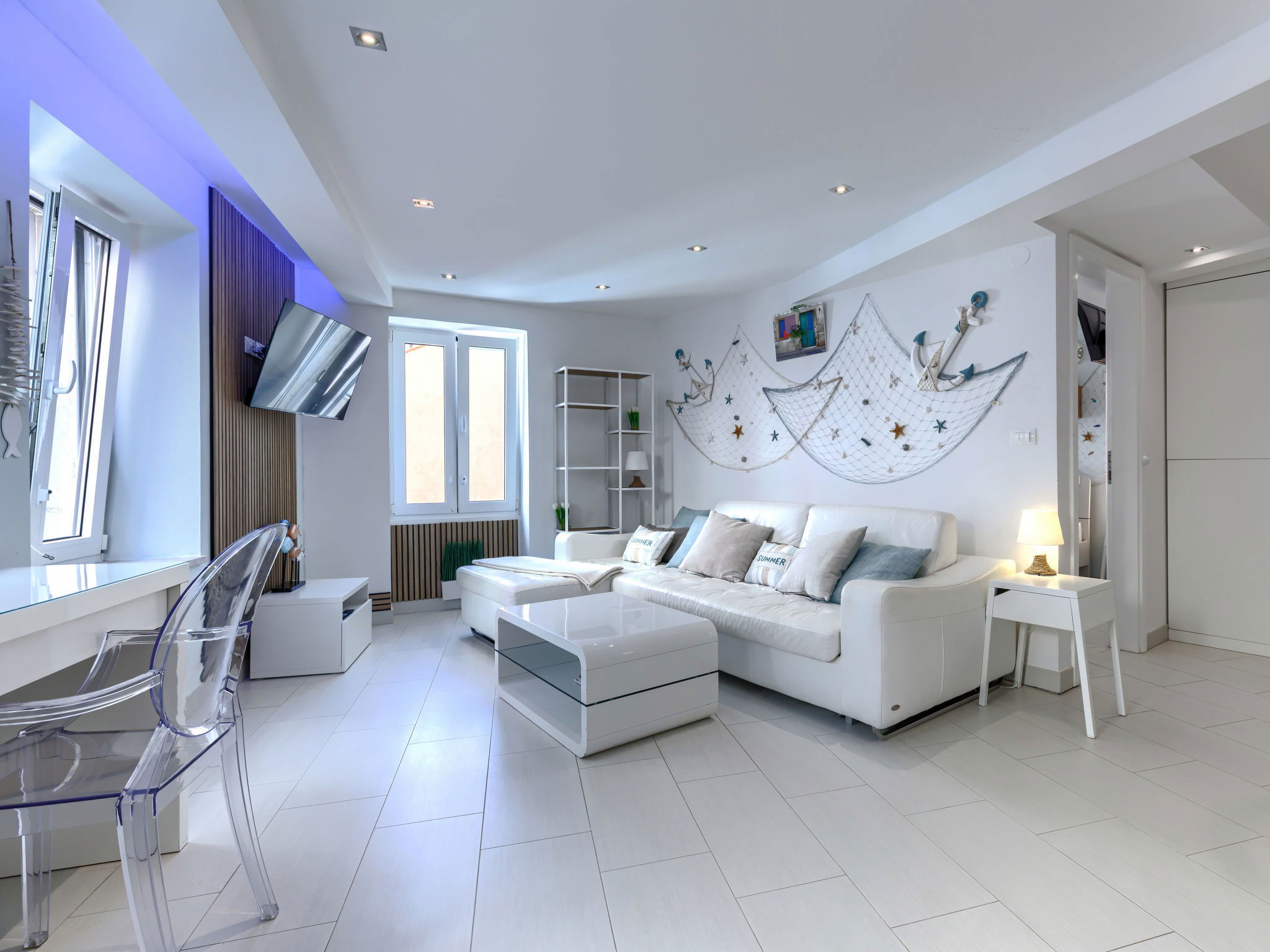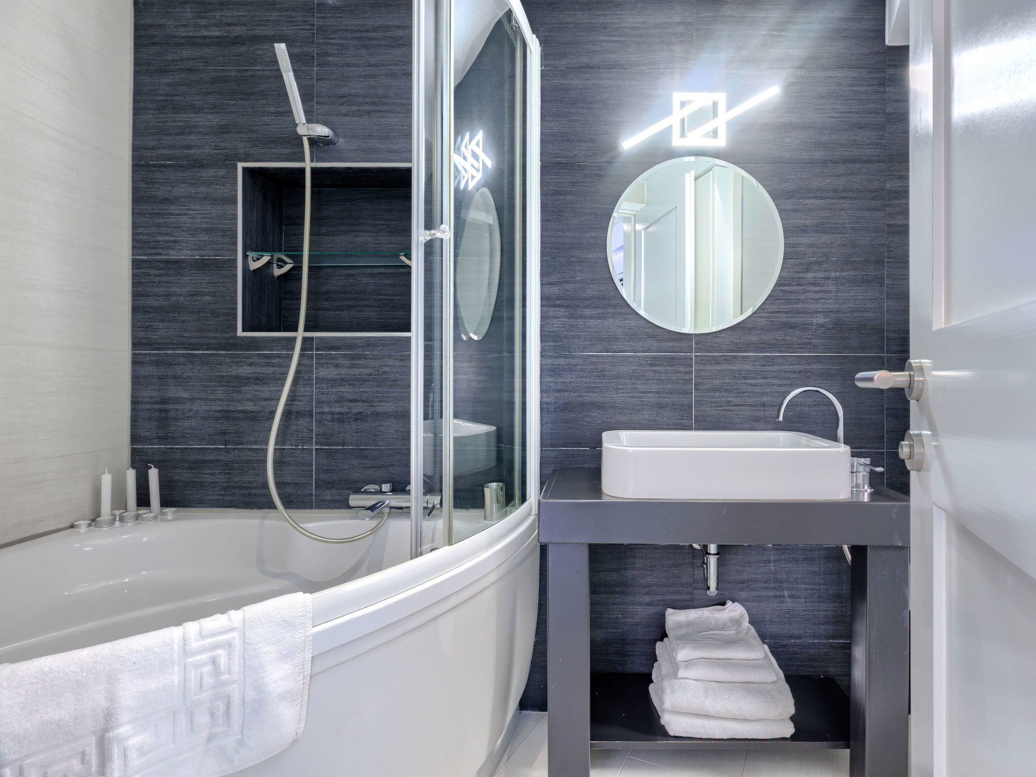"Ambient", 2-room apartment 45 m2, on the upper floor. Bright, modern and tasteful furnishings: living/dining room with 1 double sofabed (160 cm, length 200 cm), TV and air conditioning. 1 room with 1 french bed (160 cm, length 200 cm). Open kitchen (2 hot plates, dishwasher, toaster, kettle, microwave, electric coffee machine). Shower/WC with corner bath. Forced-air heating. Facilities: washing machine, safe, iron, hair dryer. Internet (WiFi, free). Maximum 1 small pet/ dog allowed.