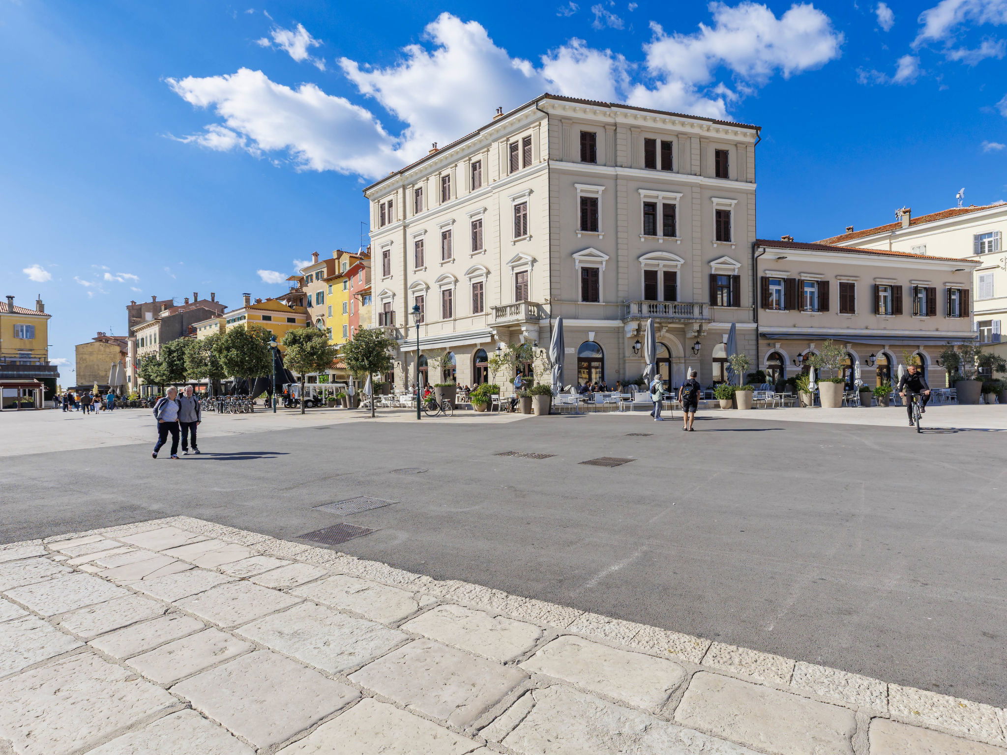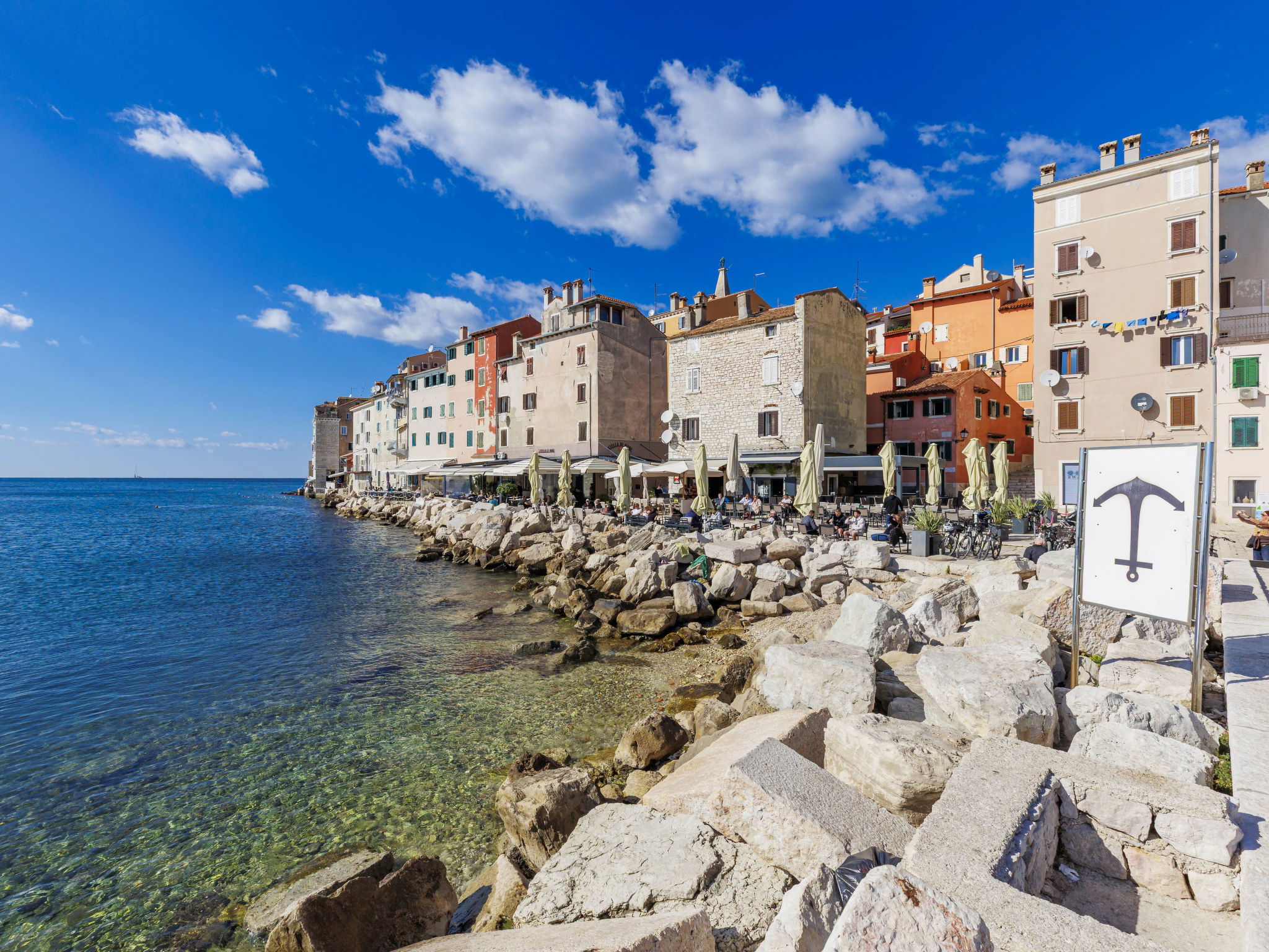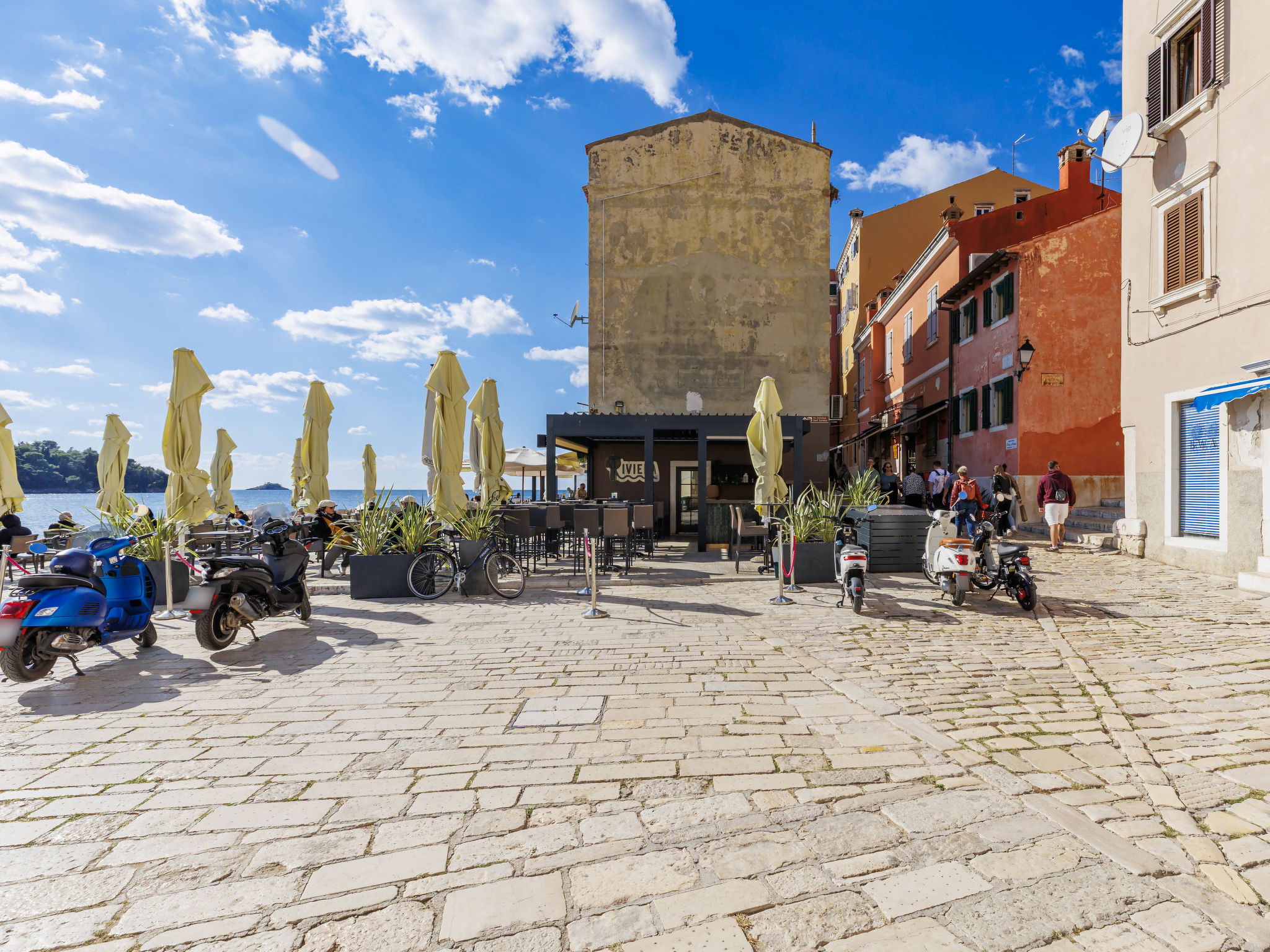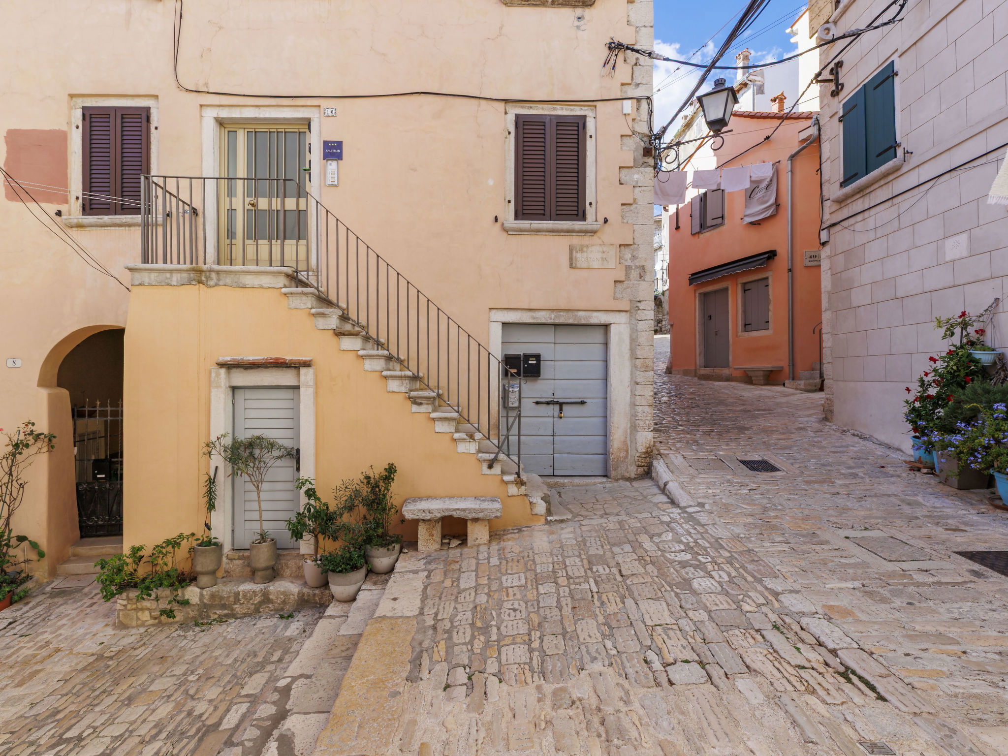 Apartment block. In the centre of Rovinj, in the heart of the city, 100 m from the sea, 100 m from the beach, in a pedestrian area. In the house: internet access, bicycles available. Available: bicycles (2). Public parking 600 m extra. Shop, restaurant 100 m, café 10 m, bus stop 650 m, rocky beach 100 m, public bathing area 250 m. Please note: airfield 40 km from the property.