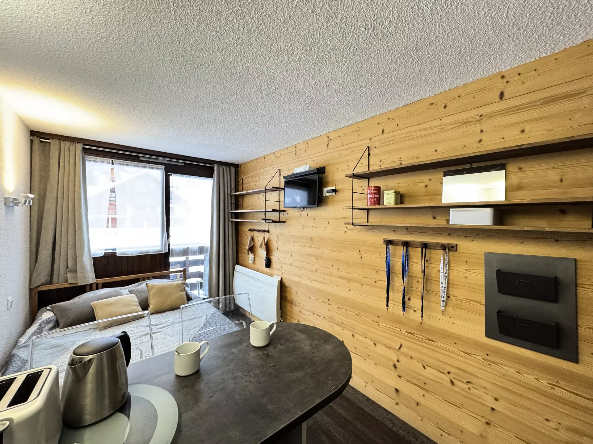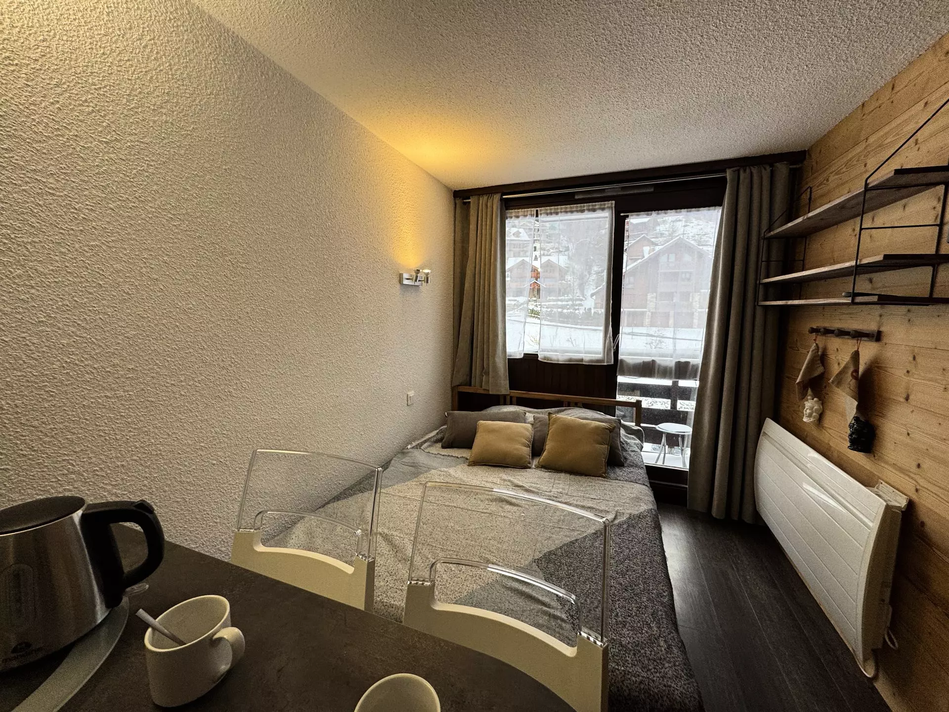 Ideal for couples, this lovely, newly renovated 17 m² studio apartment is equipped with all the necessary comforts. It features a sofa bed for maximum space and a very practical ski locker. To enjoy the sun and the view, you have an east-facing balcony overlooking the mountains. The design has been thought of in a modern chalet style and is warm. A perfect cocoon for a romantic stay in the resort!