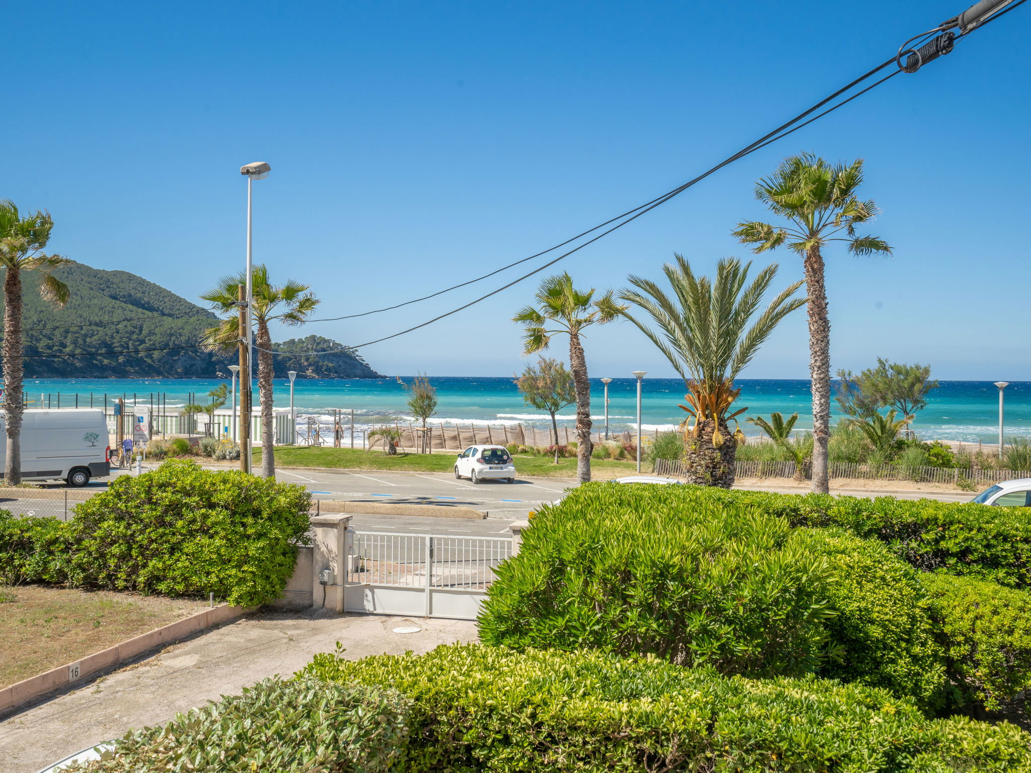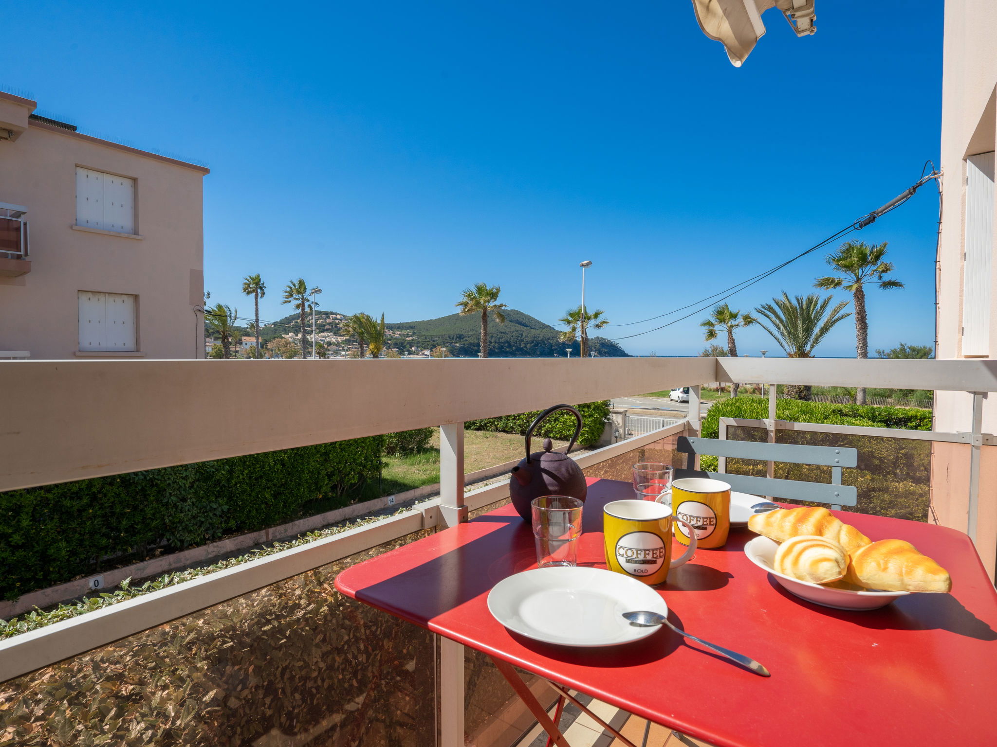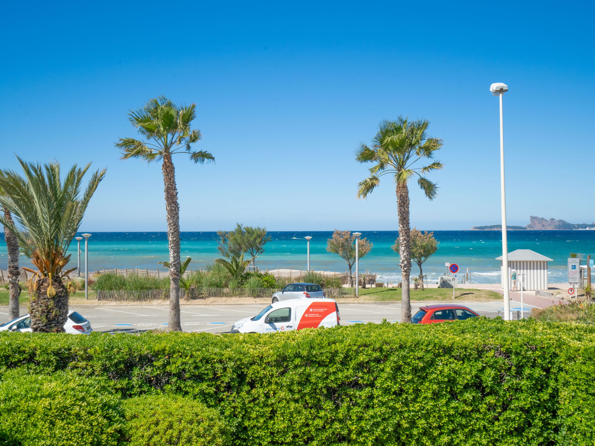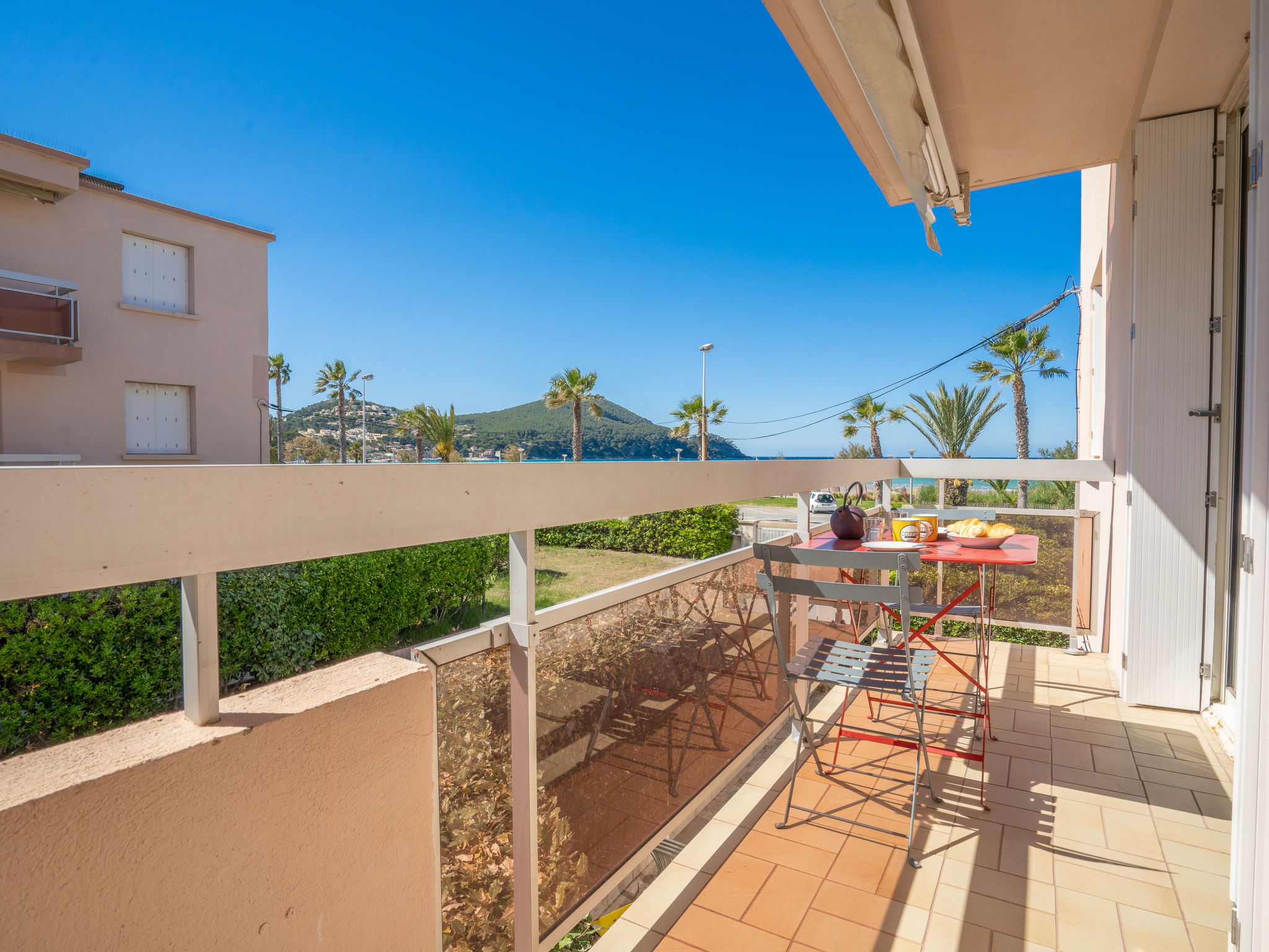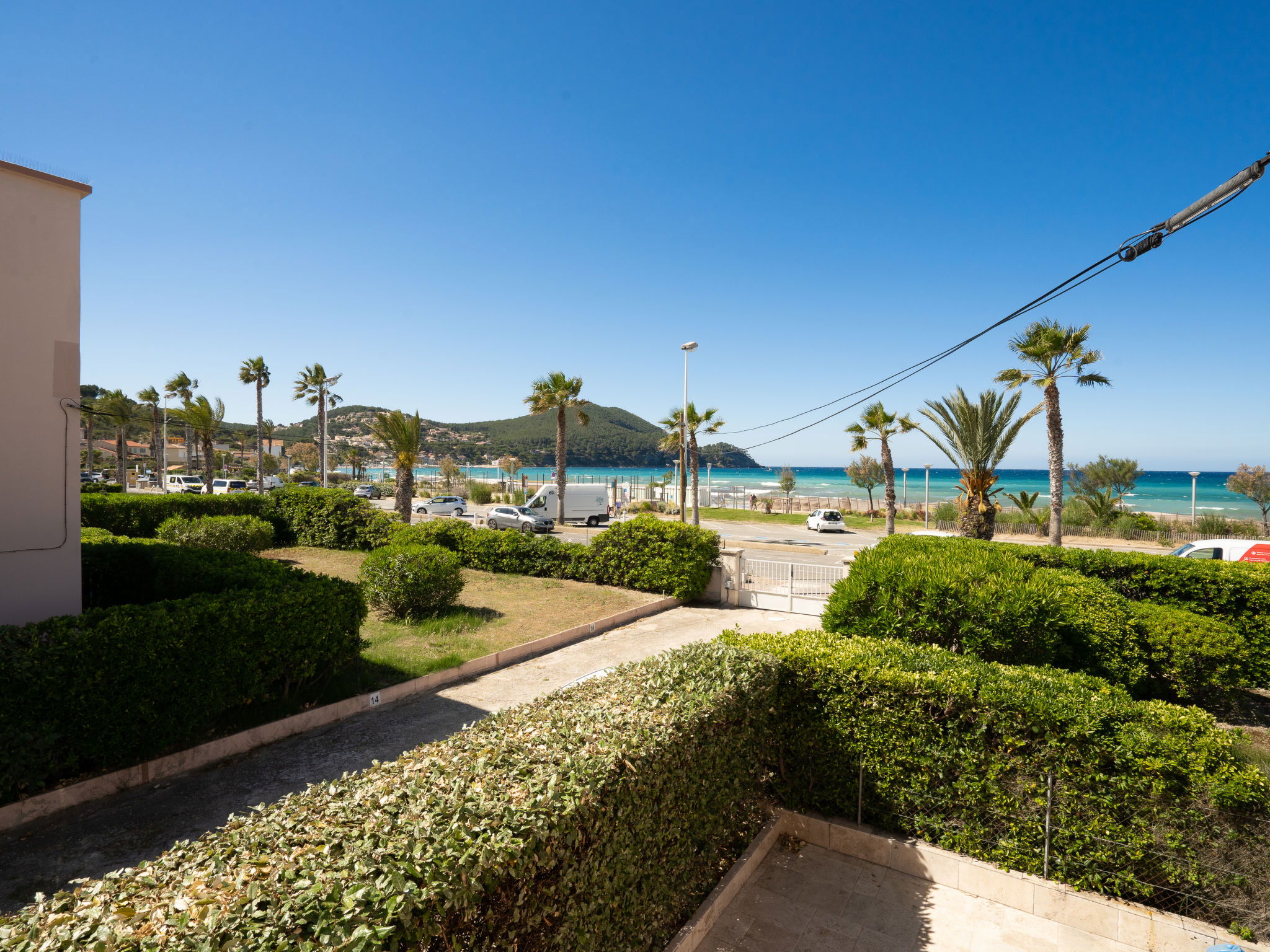 1-room apartment 30 m2 on 1st floor. Simple furnishings: living/dining room with 1 pull-out bed (2 x 80 cm, length 200 cm), TV. Exit to the terrace. Kitchenette (2 ceramic glass hob hotplates, toaster, kettle, microwave, freezer, electric coffee machine, Capsules for coffee machine (Senséo) extra). Shower/WC. Electric heating. Terrace 5 m2, roofed, south-east facing position. Terrace furniture. Side view of the sea. Facilities: washing machine, iron. Internet (WiFi, extra). Parking space n 5. Please note: maximum 1 pet/ dog allowed. TV only FR. Smoke alarm. 83112 000179 QU