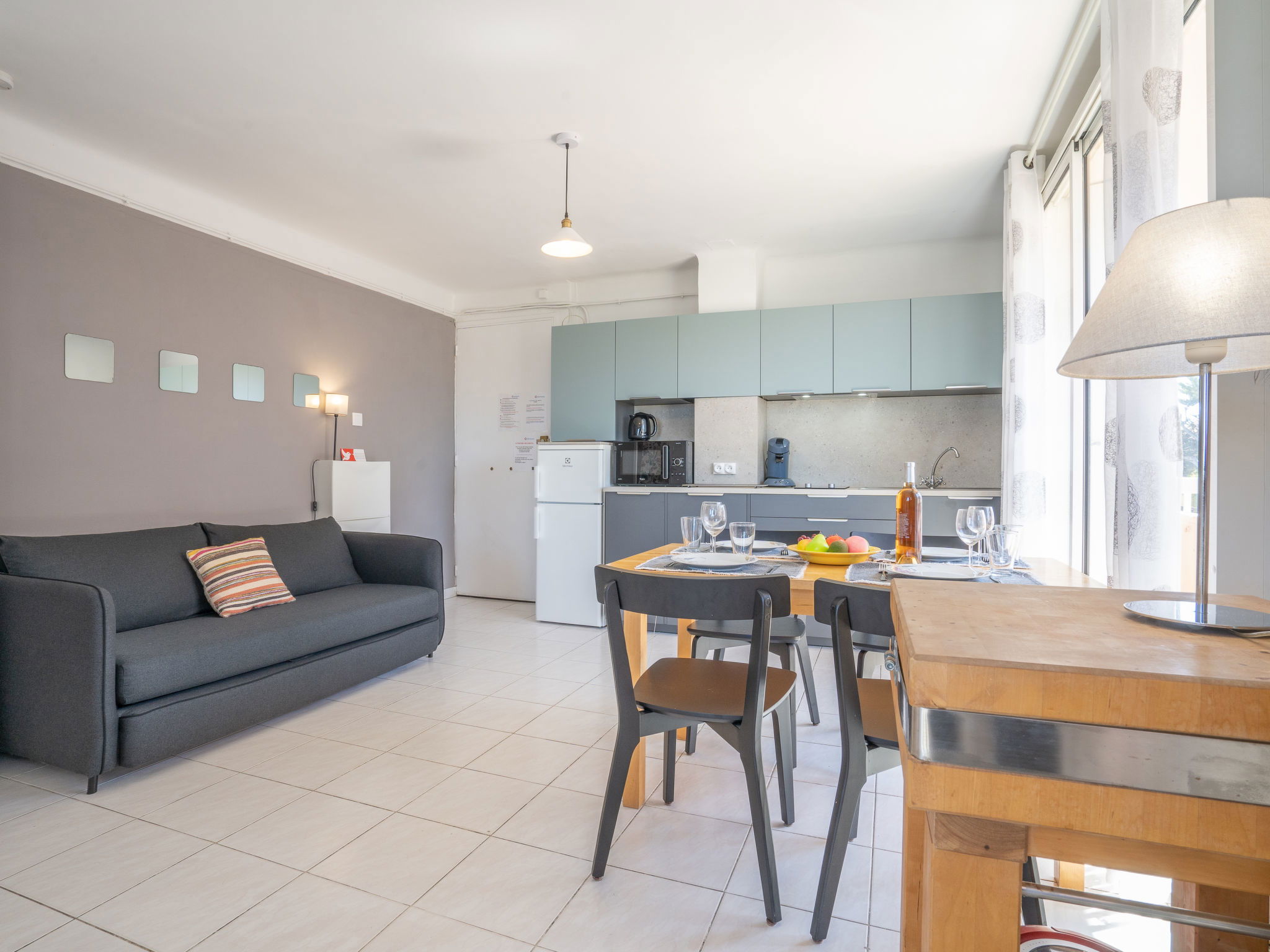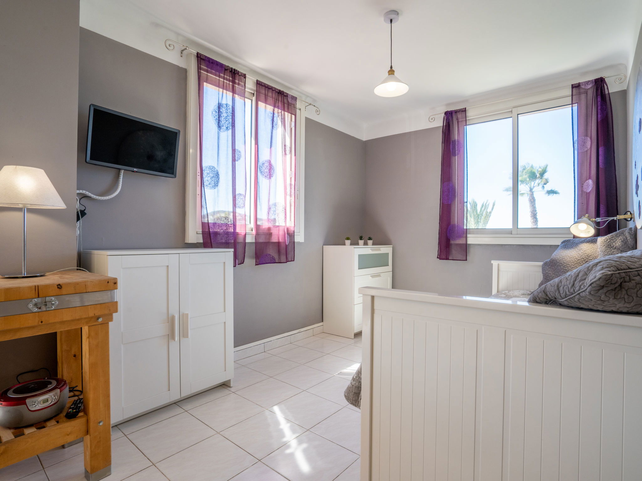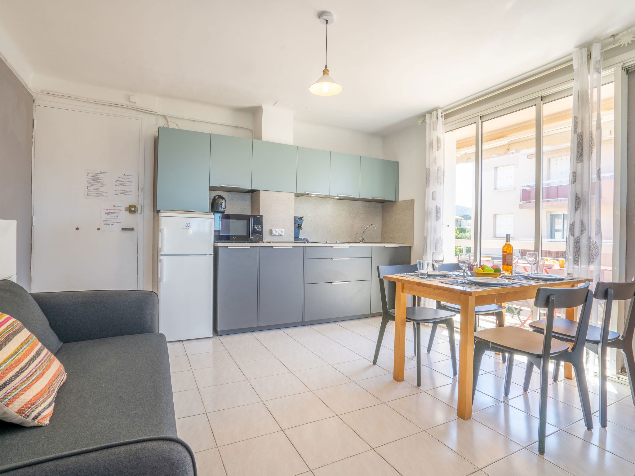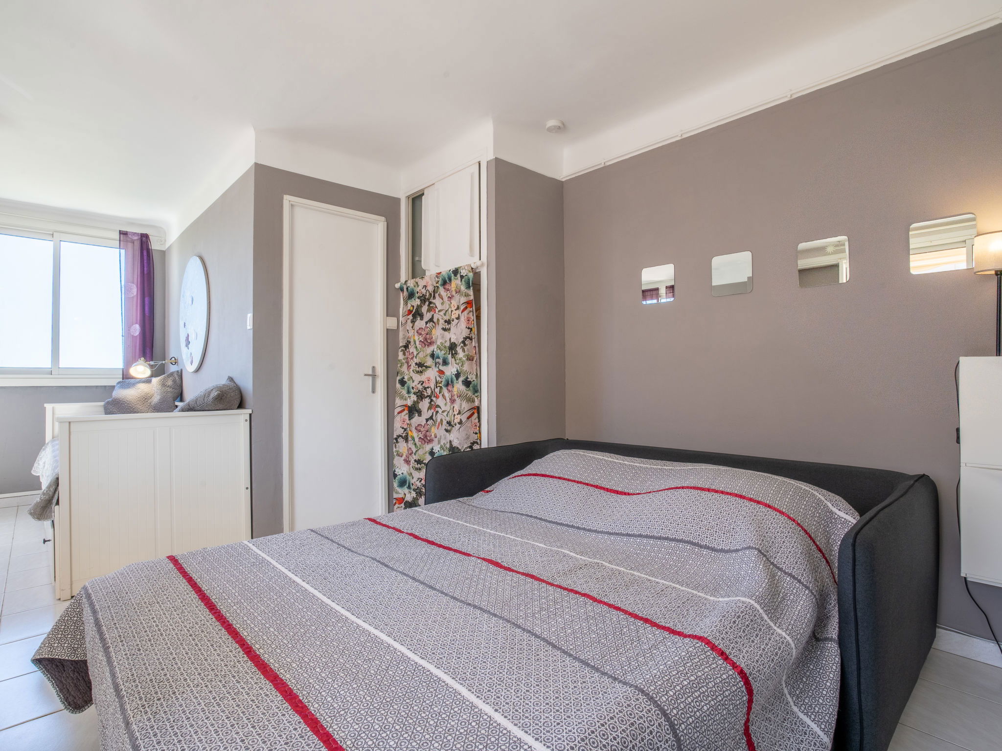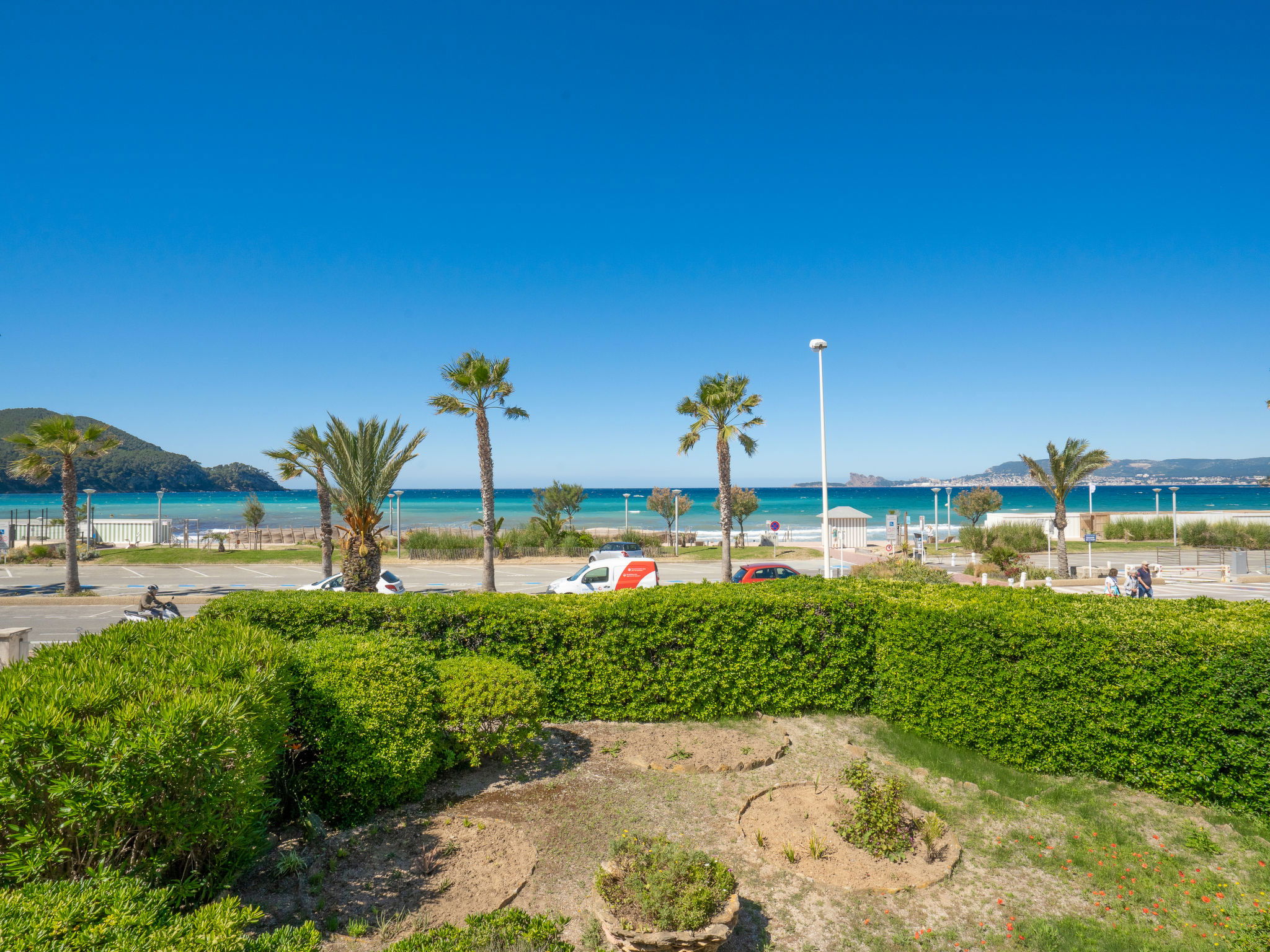 1-room apartment 30 m2 on 1st floor. Simple furnishings: living/dining room with 1 pull-out bed (2 x 80 cm, length 200 cm), TV. Exit to the terrace. Kitchenette (2 ceramic glass hob hotplates, toaster, kettle, microwave, freezer, electric coffee machine, Capsules for coffee machine (Senséo) extra). Shower/WC. Electric heating. Terrace 5 m2, roofed, south-east facing position. Terrace furniture. Side view of the sea. Facilities: washing machine, iron. Internet (WiFi, extra). Parking space n 5. Please note: maximum 1 pet/ dog allowed. TV only FR. Smoke alarm. 83112 000179 QU