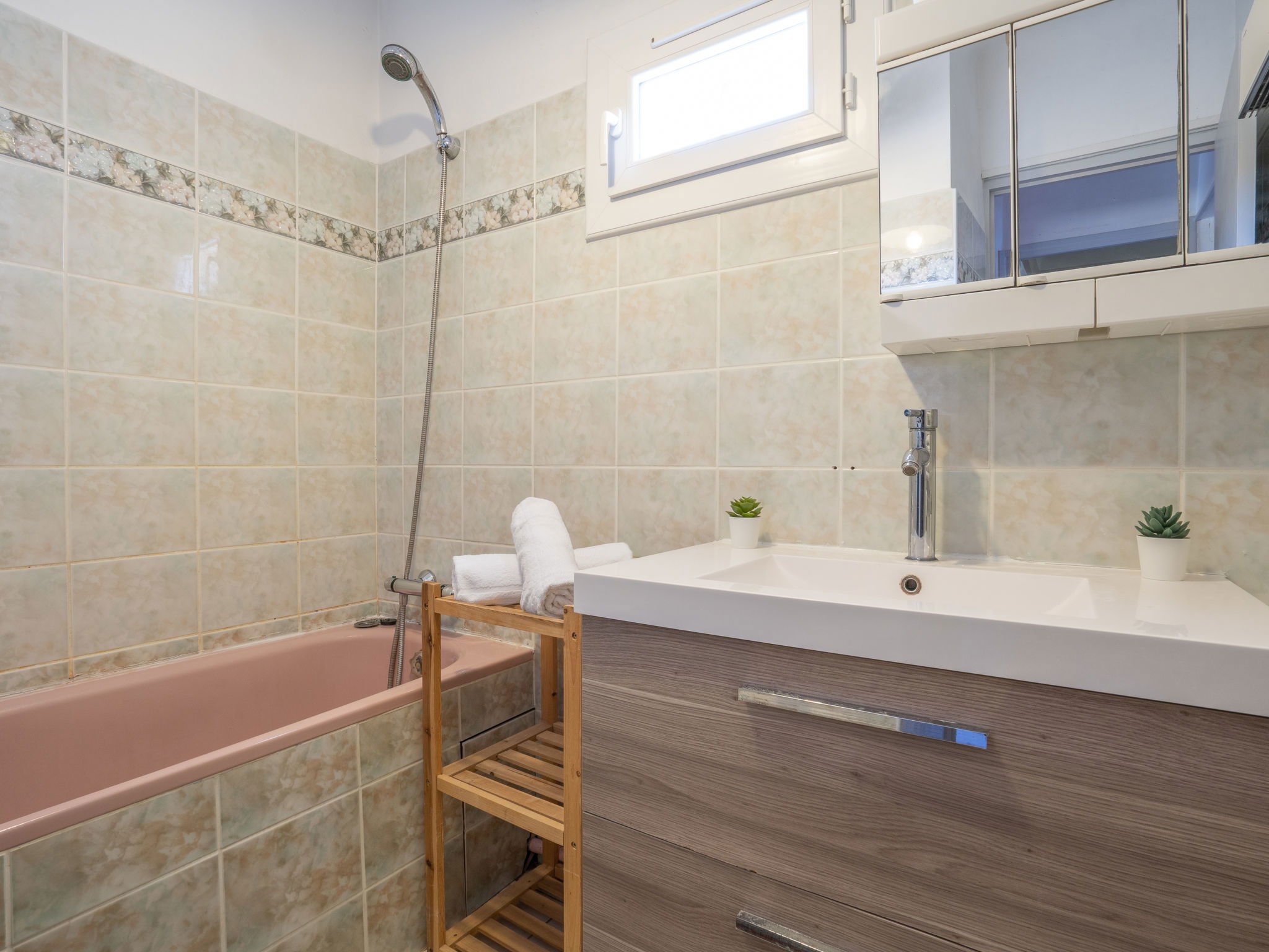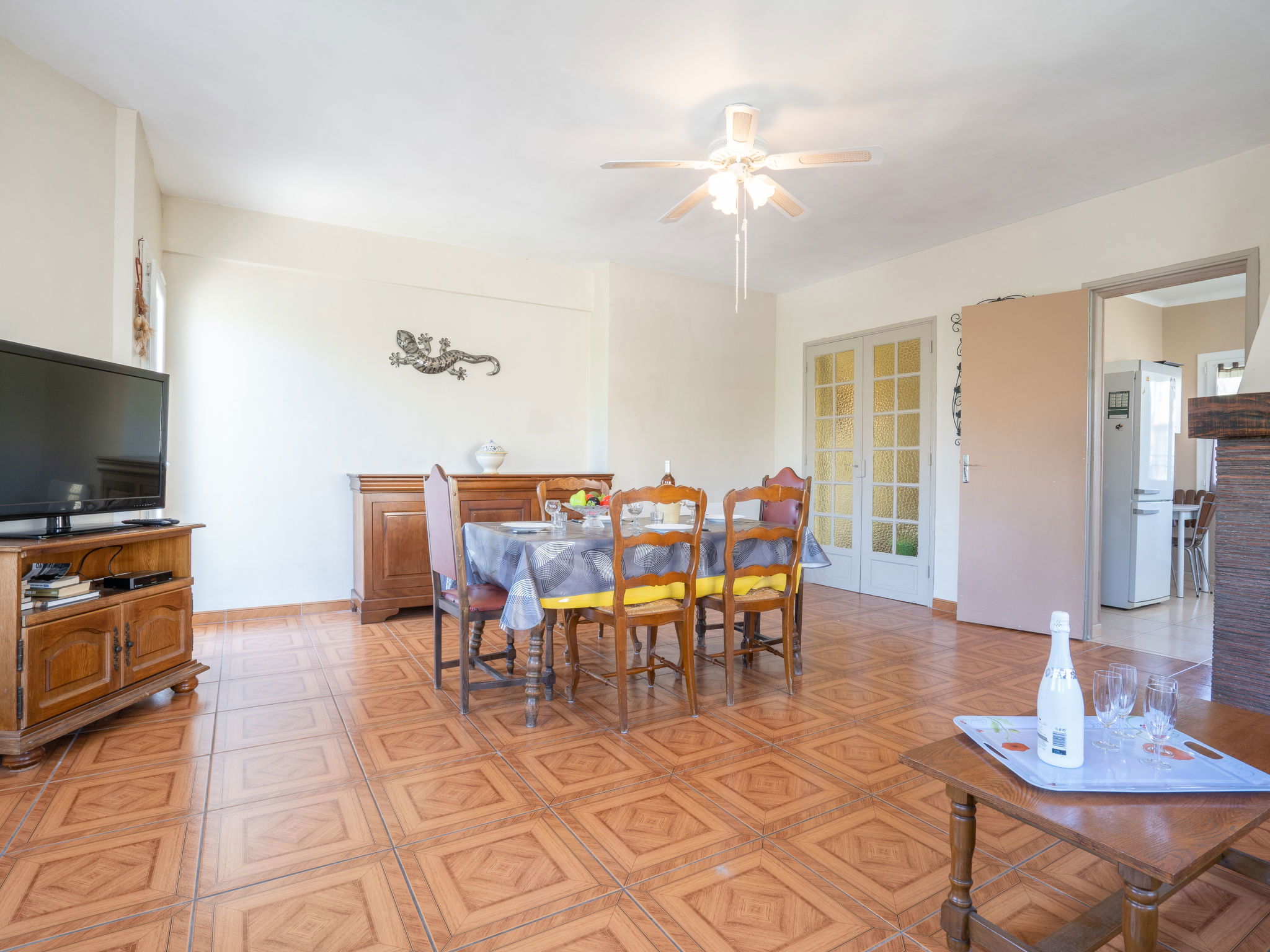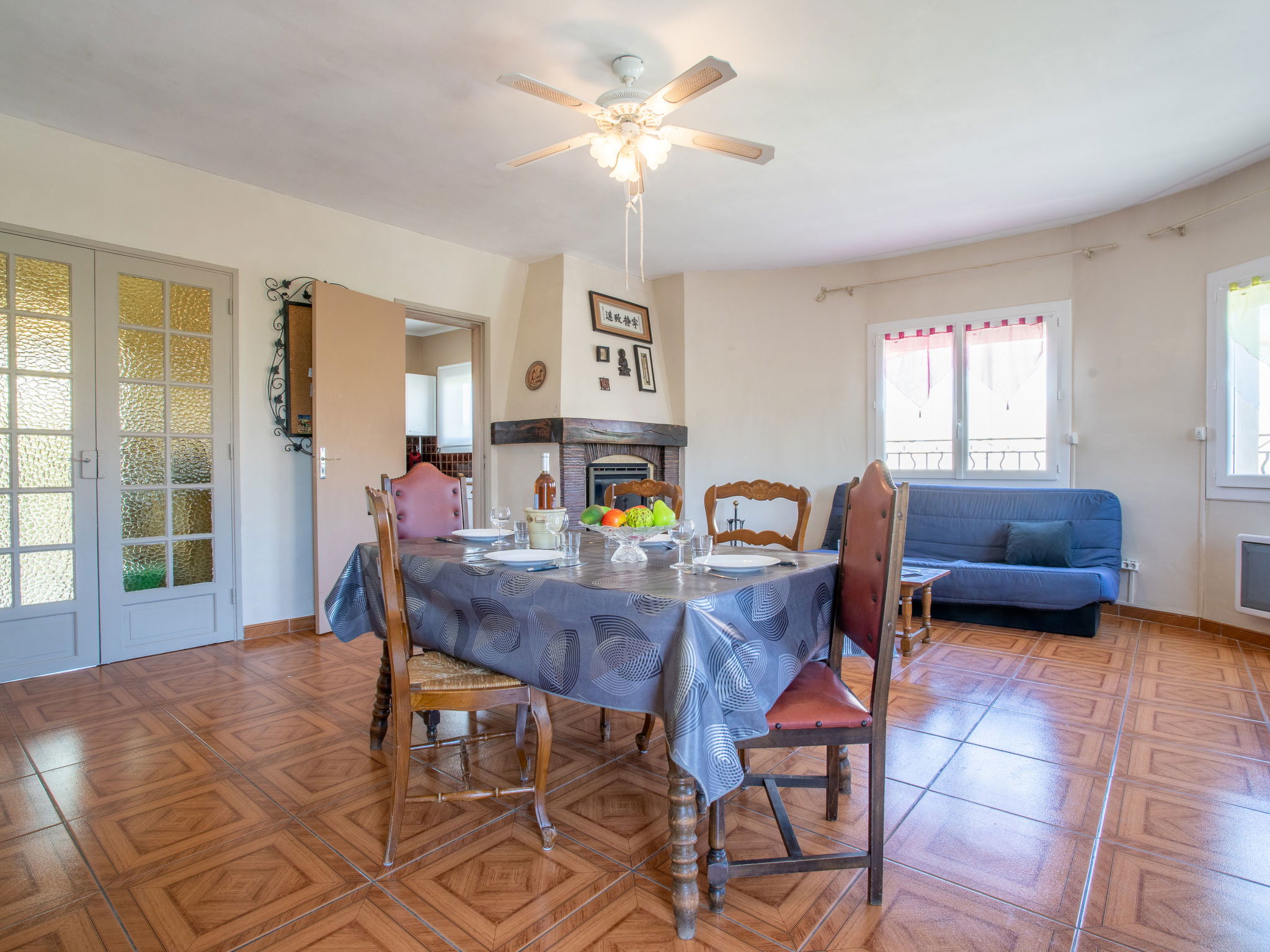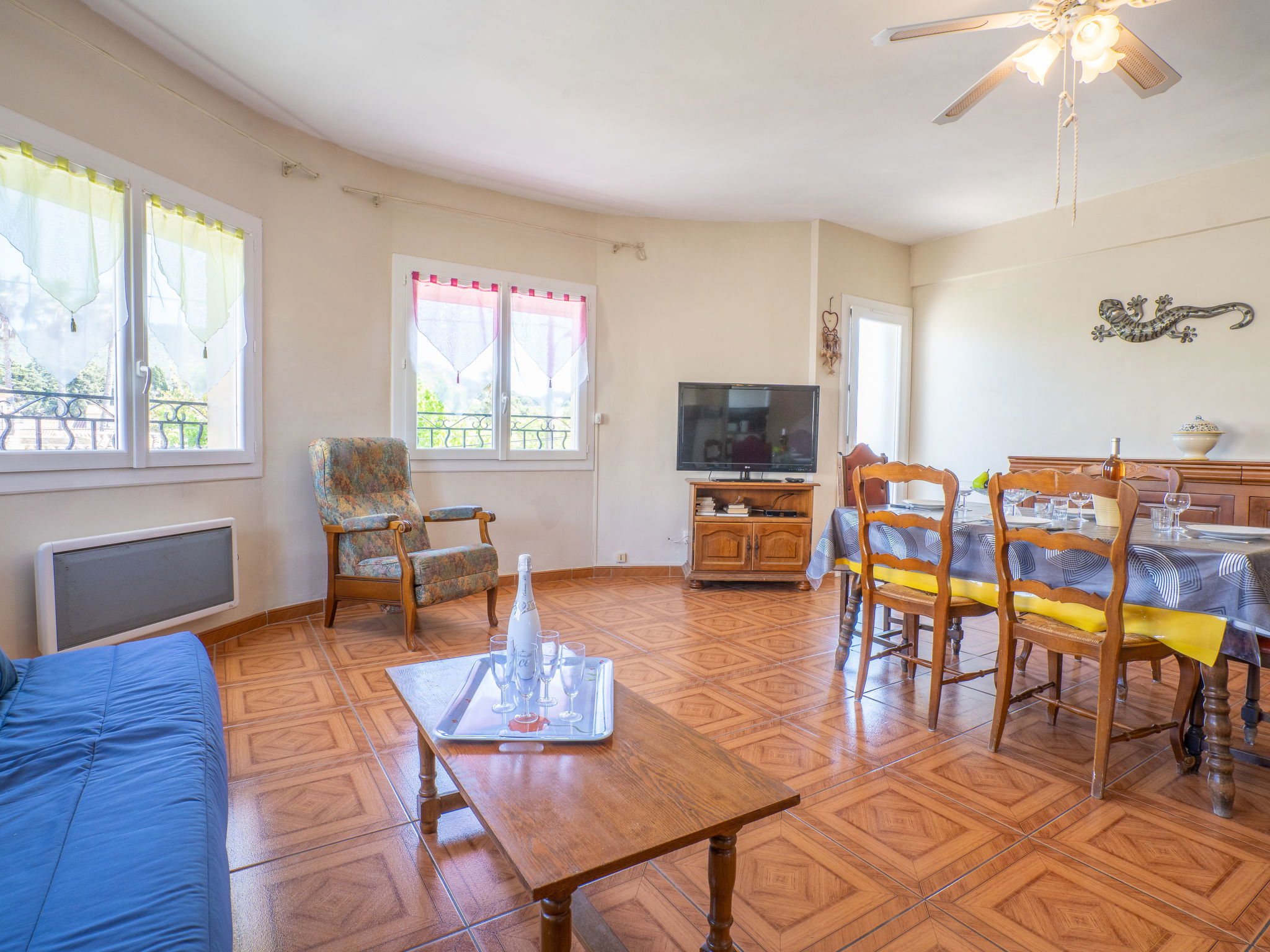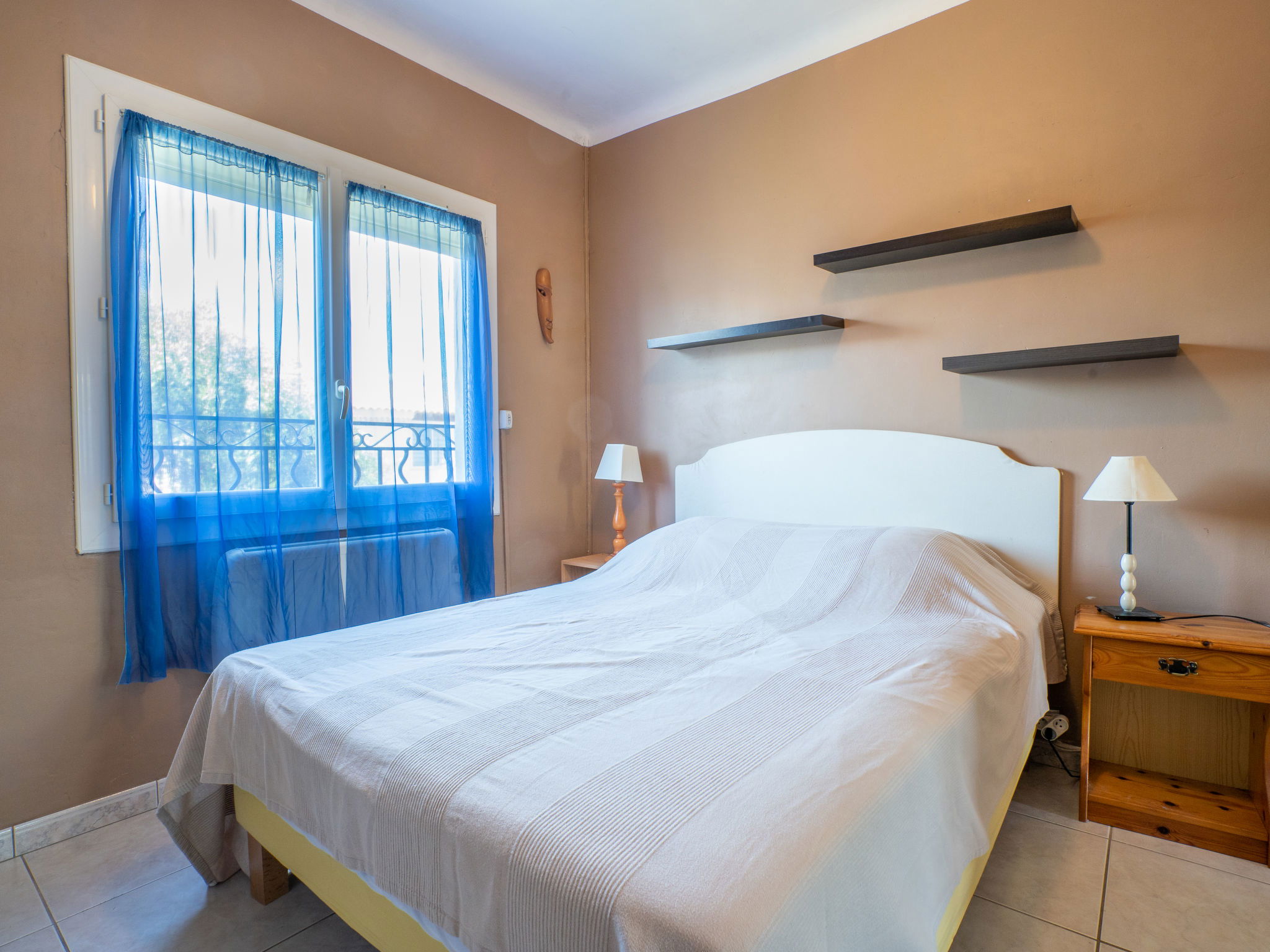 3-room apartment 75 m2 on 1st floor. Simple and practical furnishings: living/dining room with 1 sofabed (120 cm, length 190 cm), TV. Exit to the balcony. 1 room with 1 french bed (140 cm, length 190 cm). Exit to the balcony. 1 room with 1 french bed (140 cm, length 190 cm). Kitchen (4 hot plates, oven, toaster, kettle, microwave, freezer, electric coffee machine, Capsules for coffee machine (Senséo) extra). Bathroom, sep. WC. Electric heating. Small balcony 4 m2, south-east facing position, garden 160 m2, north-west facing position. Terrace furniture. Facilities: washing machine, iron. Internet (WiFi, extra). Parking at the house. Please note: 1 small pet/ dog allowed. TV only FR. Smoke alarm. 83112 000404 KN