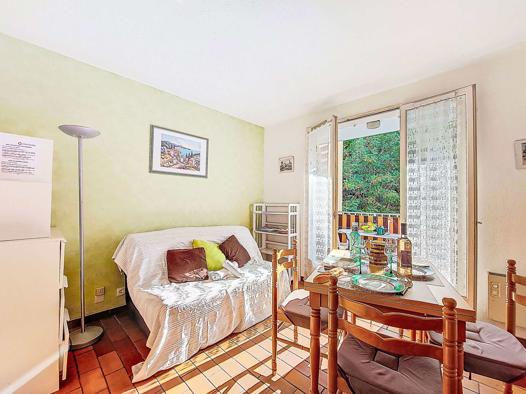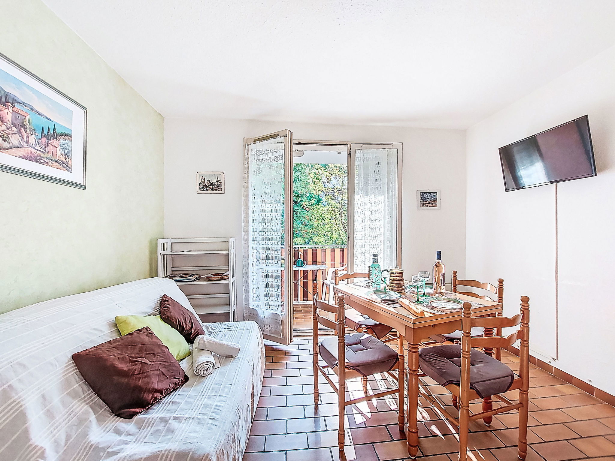 1-room apartment 22 m2 on 1st floor. Living/dining room with 1 double sofabed (140 cm, length 190 cm), TV. Exit to the terrace. Entrance hall, without window with 1 x 2 bunk beds (80 cm, length 190 cm). Kitchenette (2 ceramic glass hob hotplates, toaster, kettle, microwave, electric coffee machine, Capsules for coffee machine (Senséo) extra). Shower/WC. Electric heating. Terrace 5 m2, roofed, east facing position. Terrace furniture. View of the garden. Facilities: Internet (WiFi, extra). Please note: fridge without freezer. Maximum 1 pet/ dog allowed. TV only FR. Smoke alarm. Property for a maximum of 4 adults and a baby. 83112 000278 6H