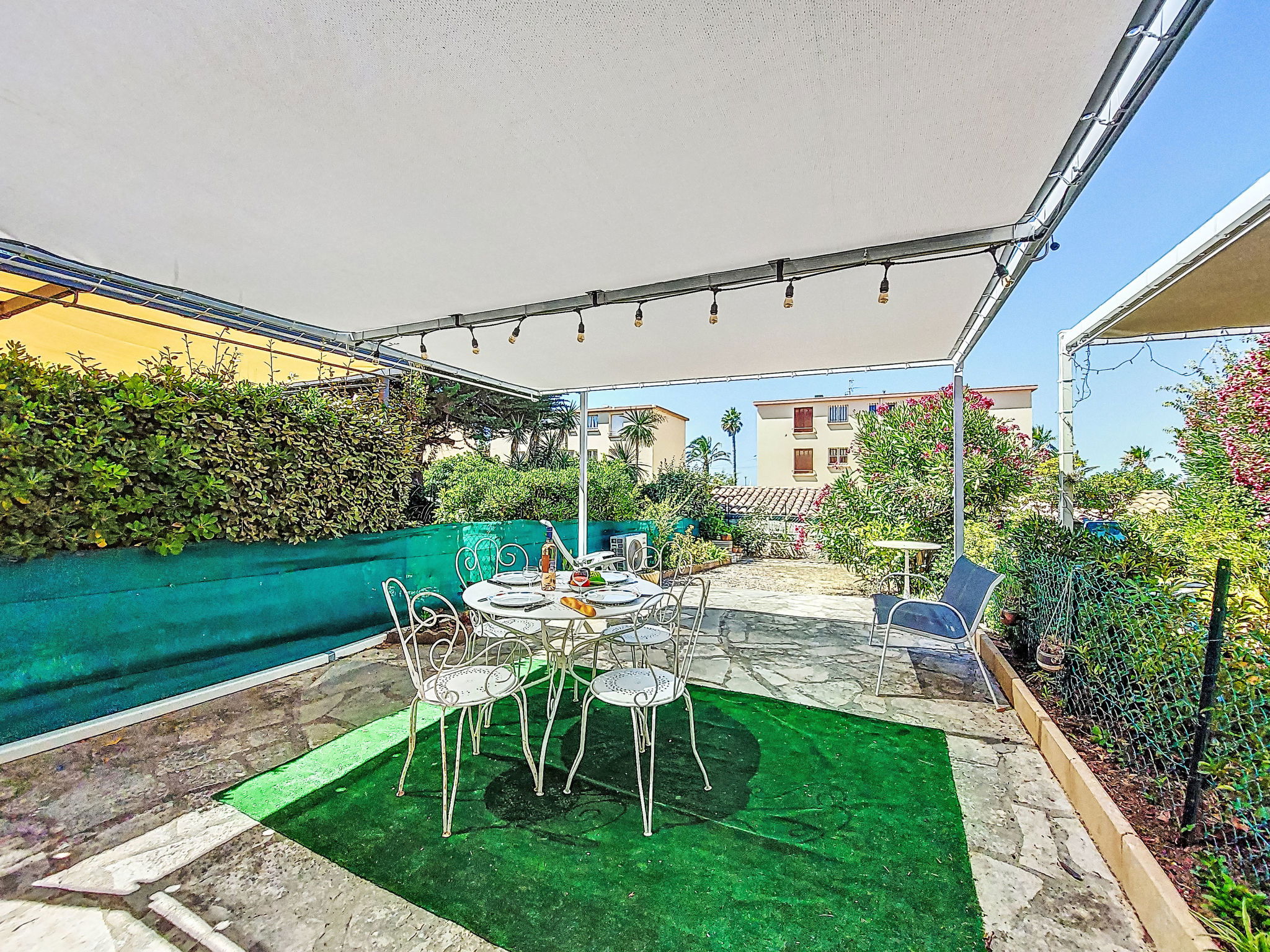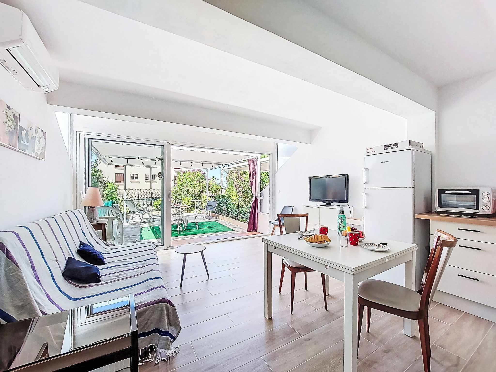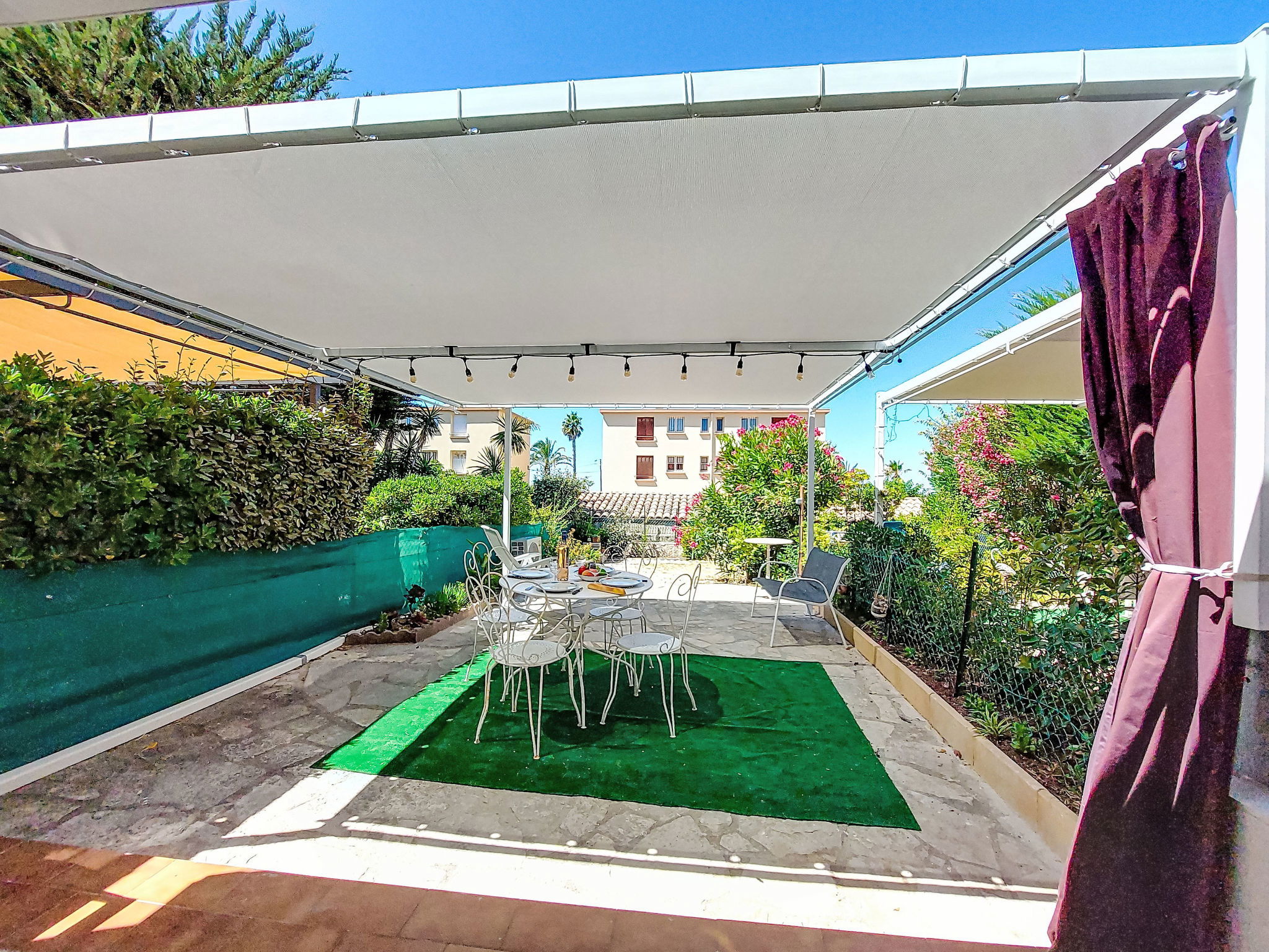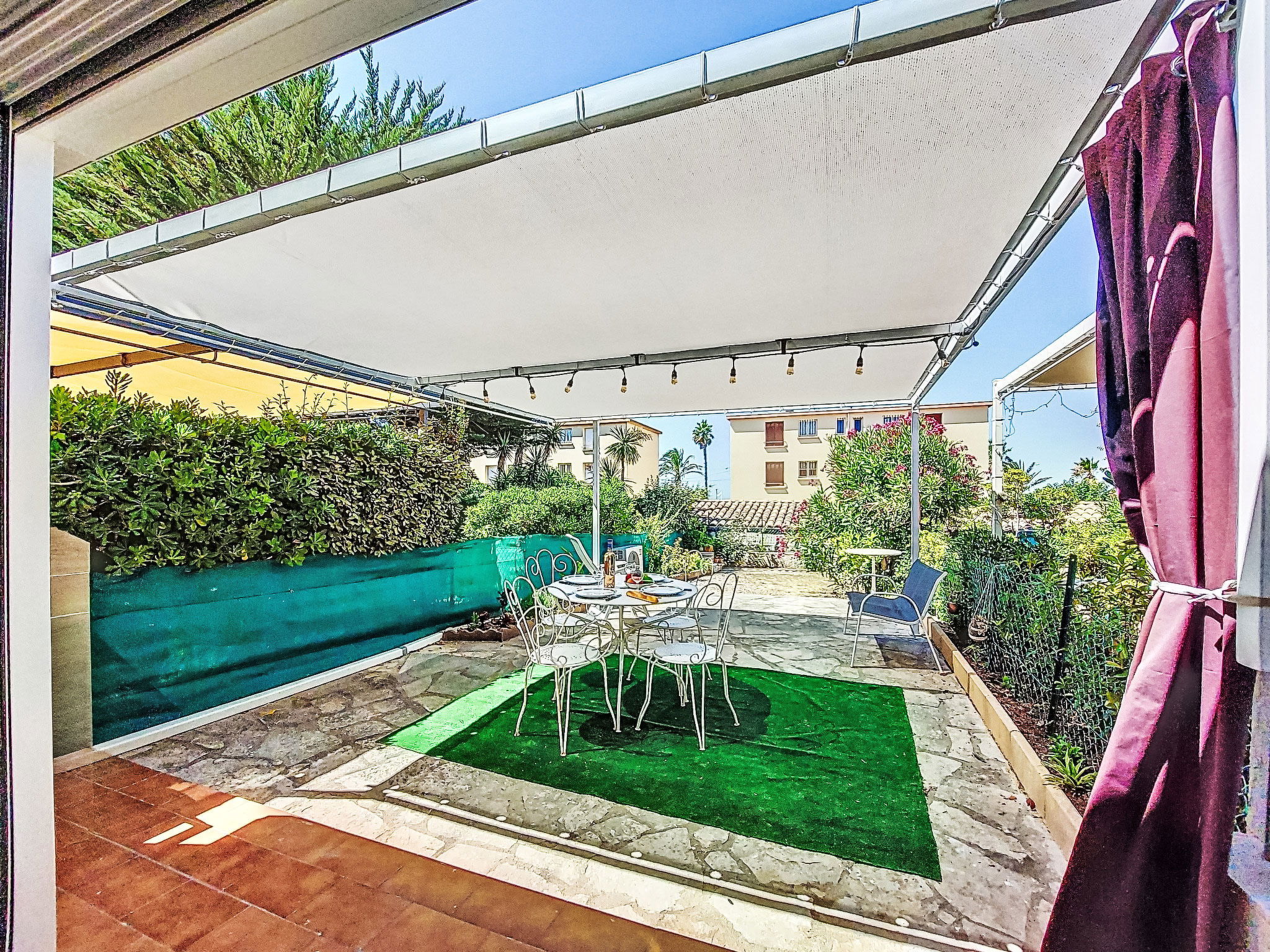 2-room apartment 35 m2, on the ground floor. Bright, comfortable and beautiful furnishings: living/dining room with 1 double sofabed (140 cm, length 200 cm), TV (flat screen), air conditioning. Exit to the terrace. 1 room with 1 french bed (140 cm, length 190 cm). Kitchenette (mini-oven, dishwasher, 3 induction hot plates, toaster, kettle, microwave, electric coffee machine). Shower/WC. Electric heating. Terrace 25 m2, south-east facing position. Terrace furniture, electric barbecue. Facilities: washing machine. Internet (WiFi, extra). Please note: non-smokers only. 1 small pet/ dog allowed. TV only FR. Smoke alarm. Offer by a private individual according to Art. 155, IV of CGI. 83112001795QC