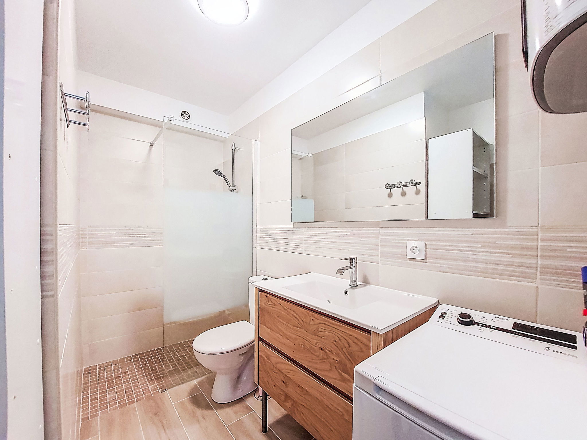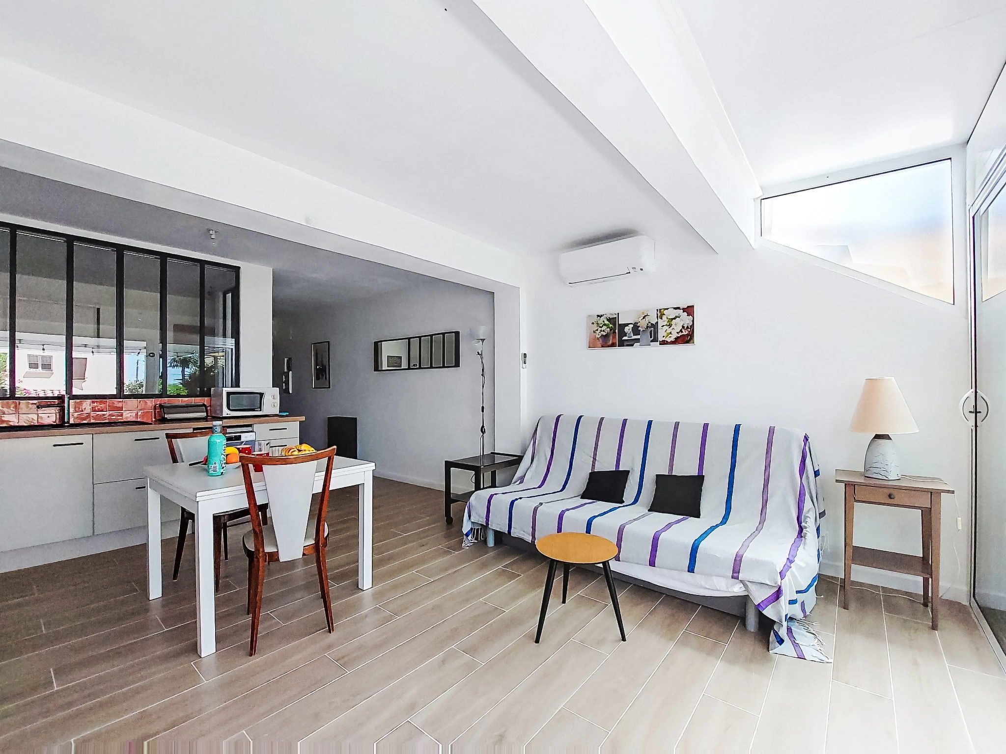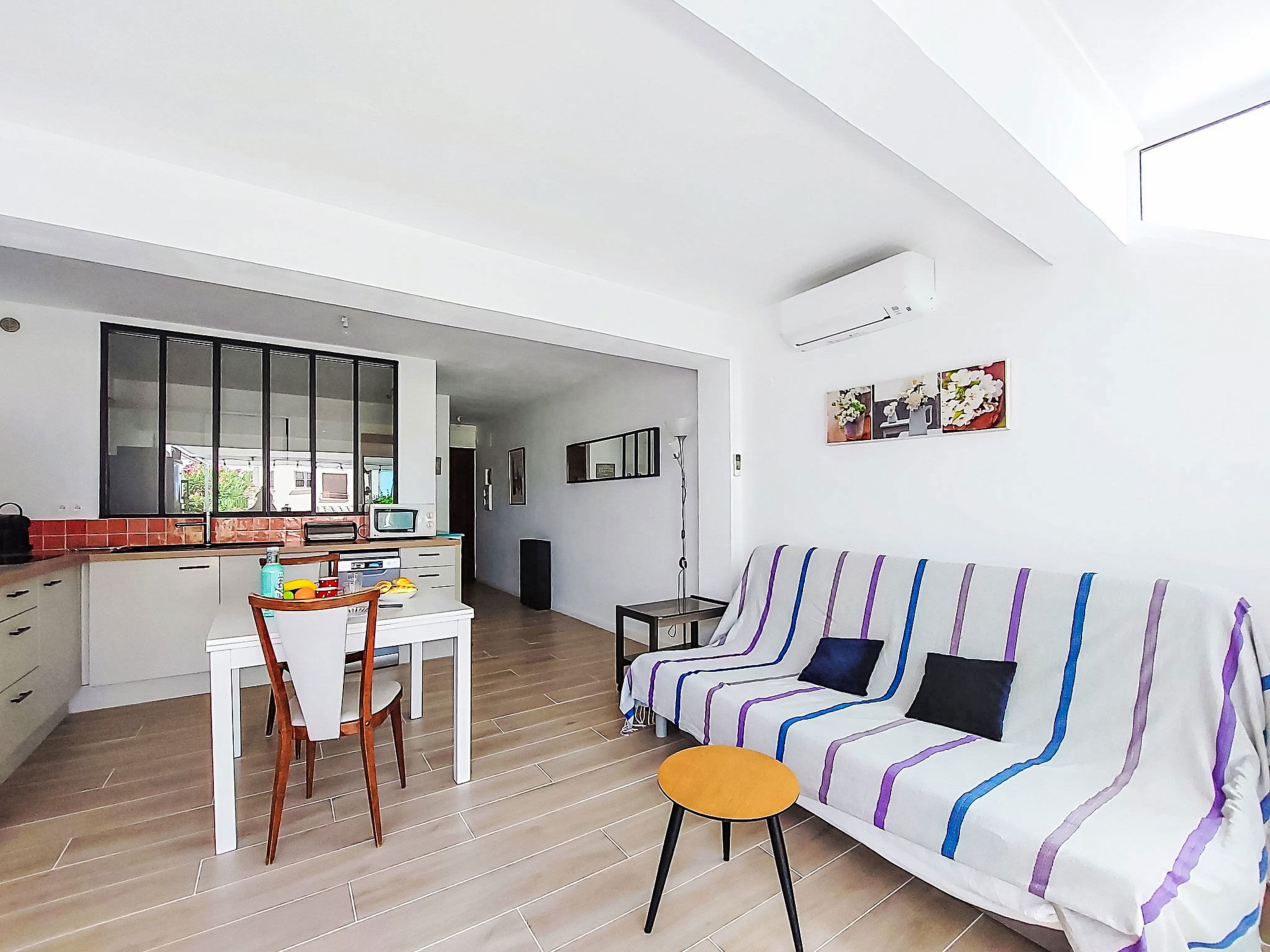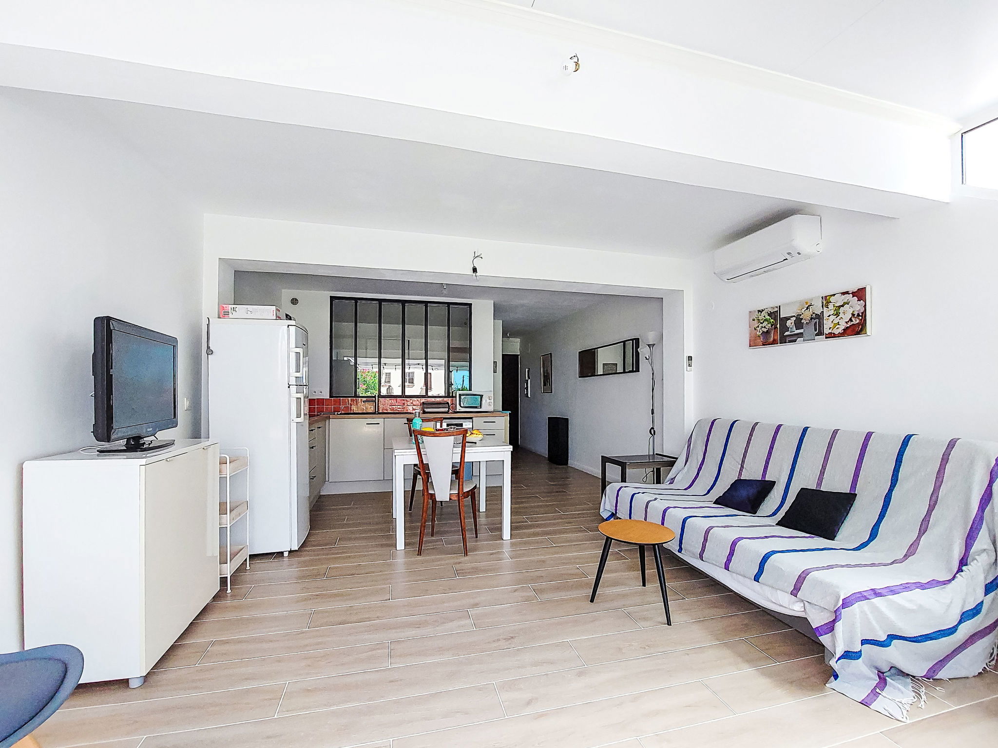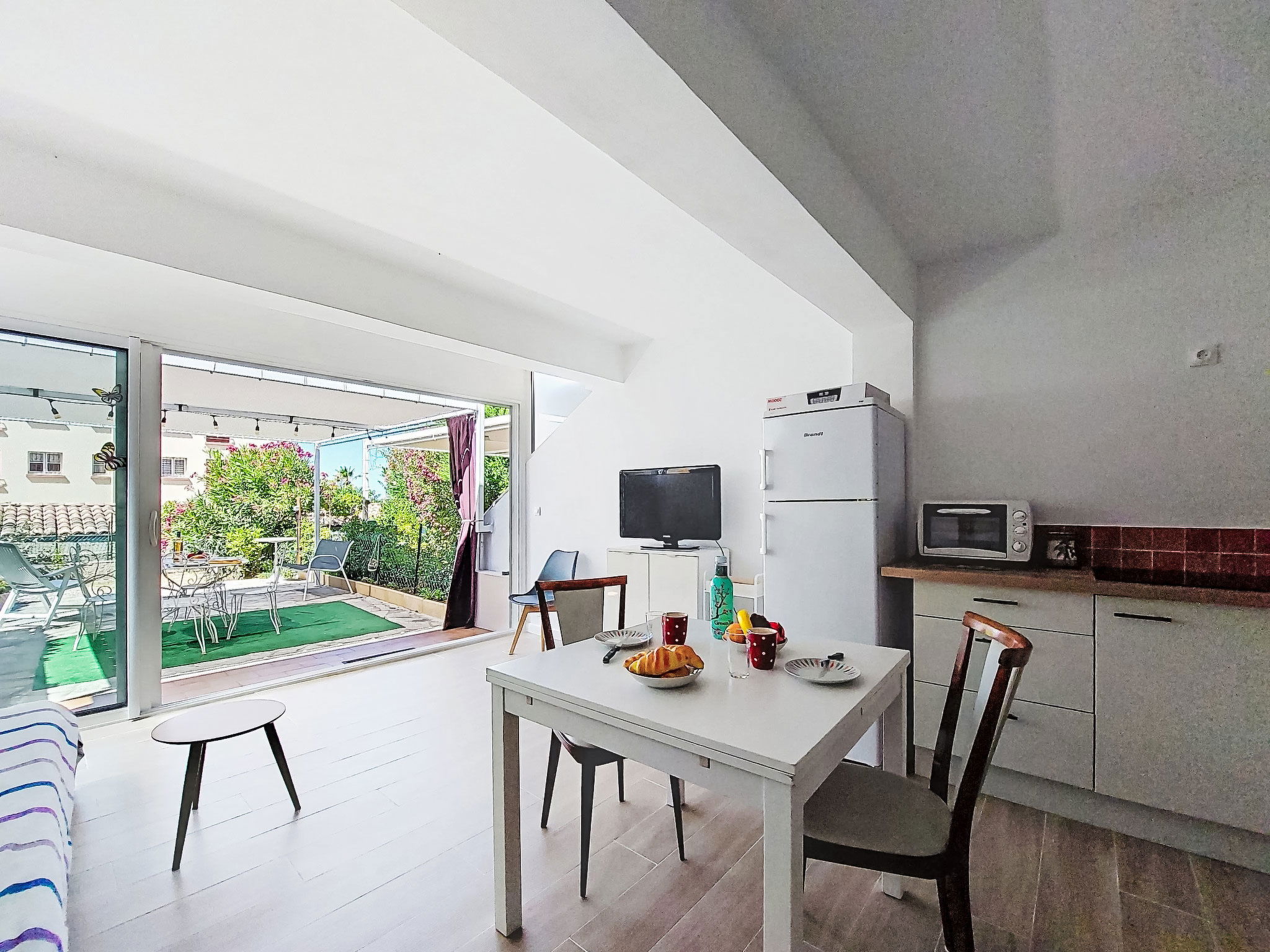 2-room apartment 35 m2, on the ground floor. Bright, comfortable and beautiful furnishings: living/dining room with 1 double sofabed (140 cm, length 200 cm), TV (flat screen), air conditioning. Exit to the terrace. 1 room with 1 french bed (140 cm, length 190 cm). Kitchenette (mini-oven, dishwasher, 3 induction hot plates, toaster, kettle, microwave, electric coffee machine). Shower/WC. Electric heating. Terrace 25 m2, south-east facing position. Terrace furniture, electric barbecue. Facilities: washing machine. Internet (WiFi, extra). Please note: non-smokers only. 1 small pet/ dog allowed. TV only FR. Smoke alarm. Offer by a private individual according to Art. 155, IV of CGI. 83112001795QC