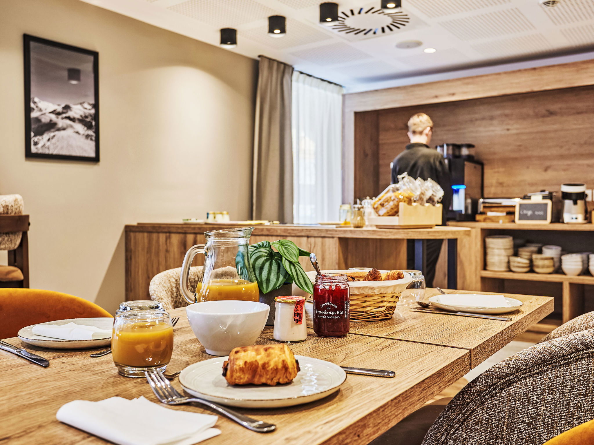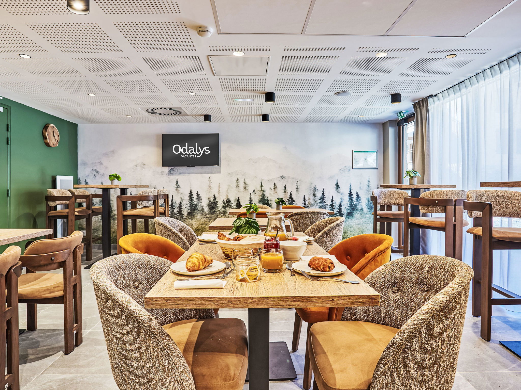"Odalys Collection Le Mont d'Auron", 4-room apartment 57 m2. Modern and tasteful furnishings: living/sleeping room with 1 double sofabed (140 cm, length 190 cm), dining table and TV (flat screen). 3 rooms, each room with 2 sleeping facilities. Small, open kitchen (dishwasher, 4 ceramic glass hob hotplates, toaster, kettle, microwave, electric coffee machine). Bathroom, sep. WC. Electric heating. Balcony or terrace. Beautiful view of the mountains. Facilities: children's high chair, baby cot, hair dryer. Internet (WiFi, free). Please note: maximum 1 pet/ dog allowed. Smoke alarm.