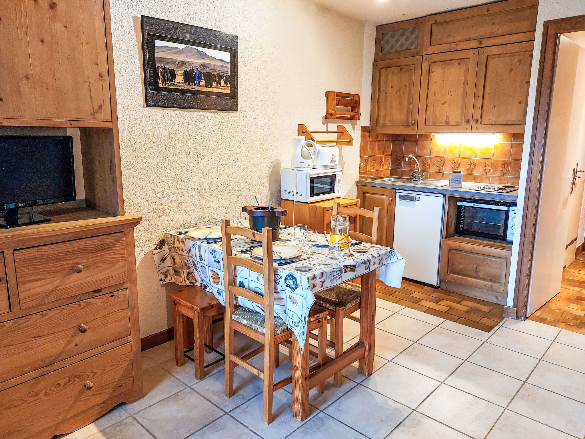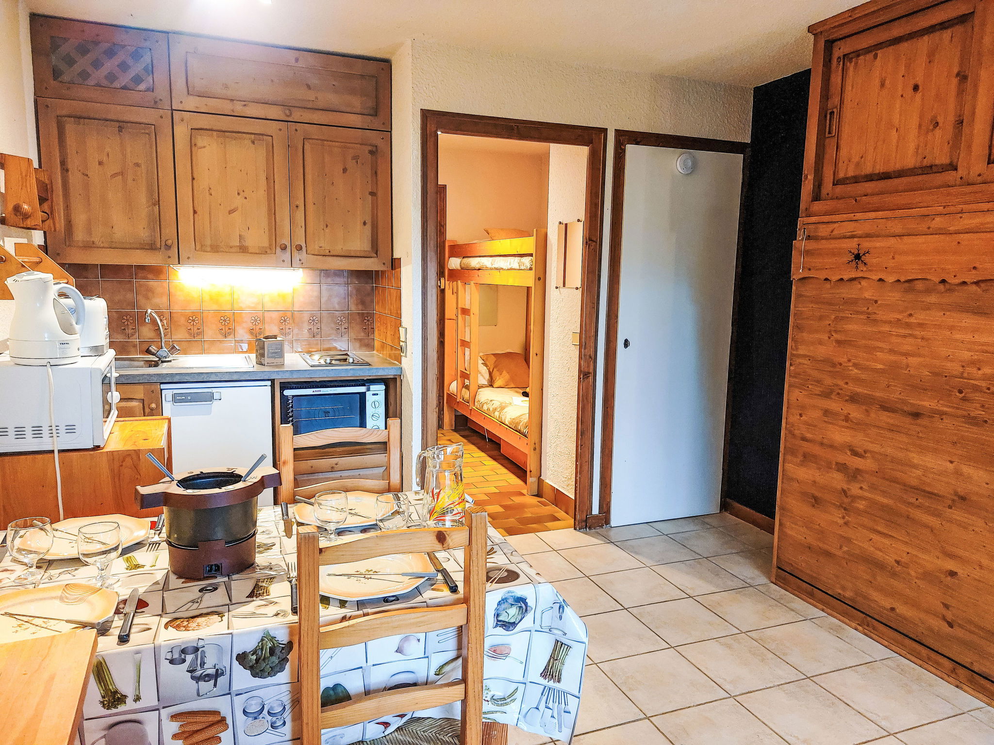 "Le Taguy", 1-room studio 26 m2. Entrance hall with 1 x 2 bunk beds (90 cm). Living/dining room with 1 double wall-trunk bed (140 cm), TV and flat screen. Exit to the terrace, south-east facing position. Kitchenette (2 hot plates, mini-oven, oven, toaster, kettle, electric coffee machine, raclette grill, combination microwave, fondue Set (cheese)). Bath/WC. Electric heating, underfloor heating. Small terrace, south-east facing position. Terrace furniture. Marvellous panoramic view of the mountains. Facilities: Internet (WiFi, extra). Please note: non-smokers only. Maximum 1 pet/ dog allowed. TV only FR. Smoke alarm, no lift.