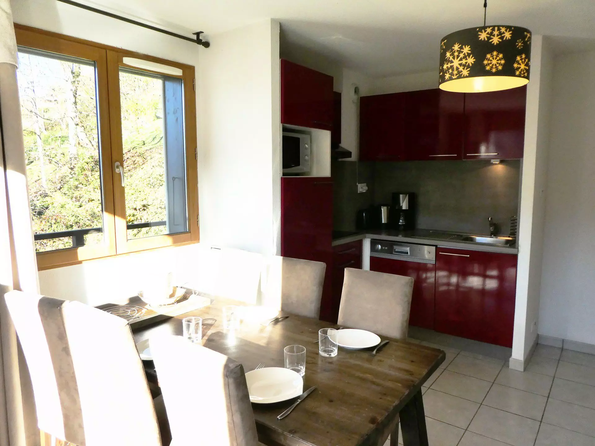 - Kitchen equipped with dishwasher, ceramic hob, refrigerator, microwave, coffee maker, toaster and kettle.