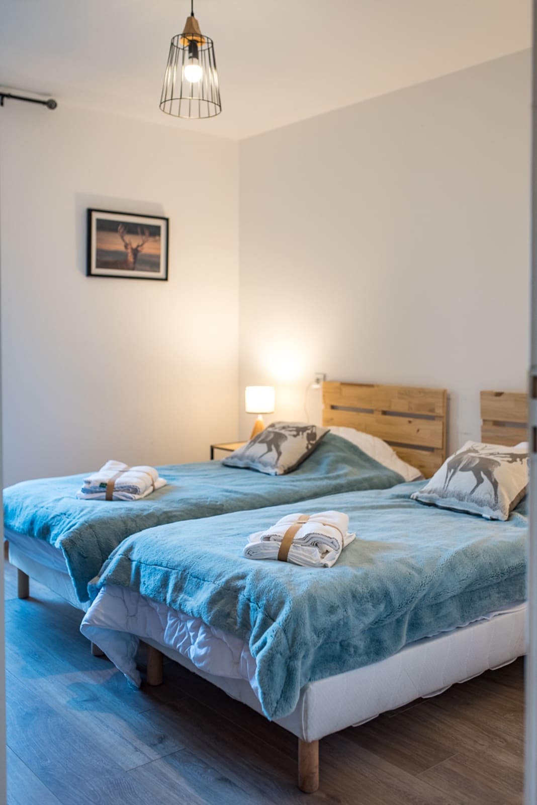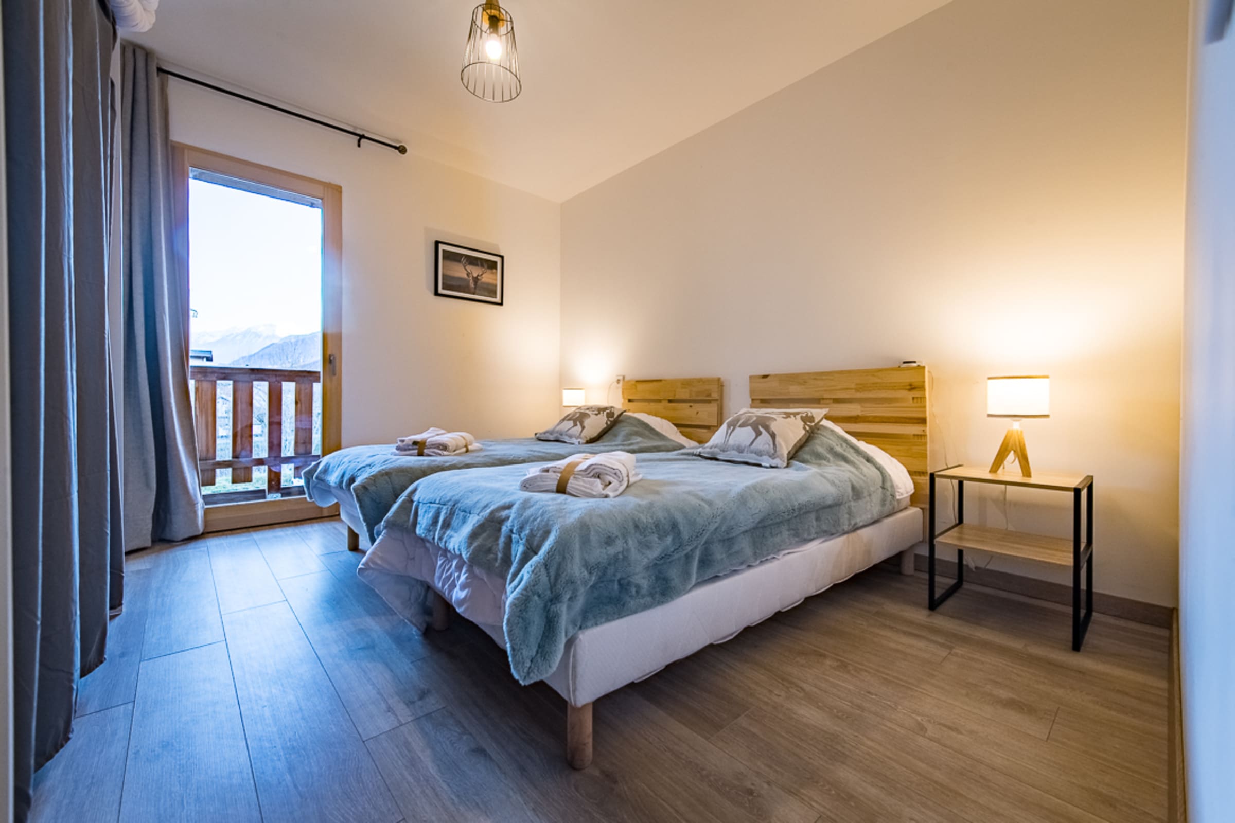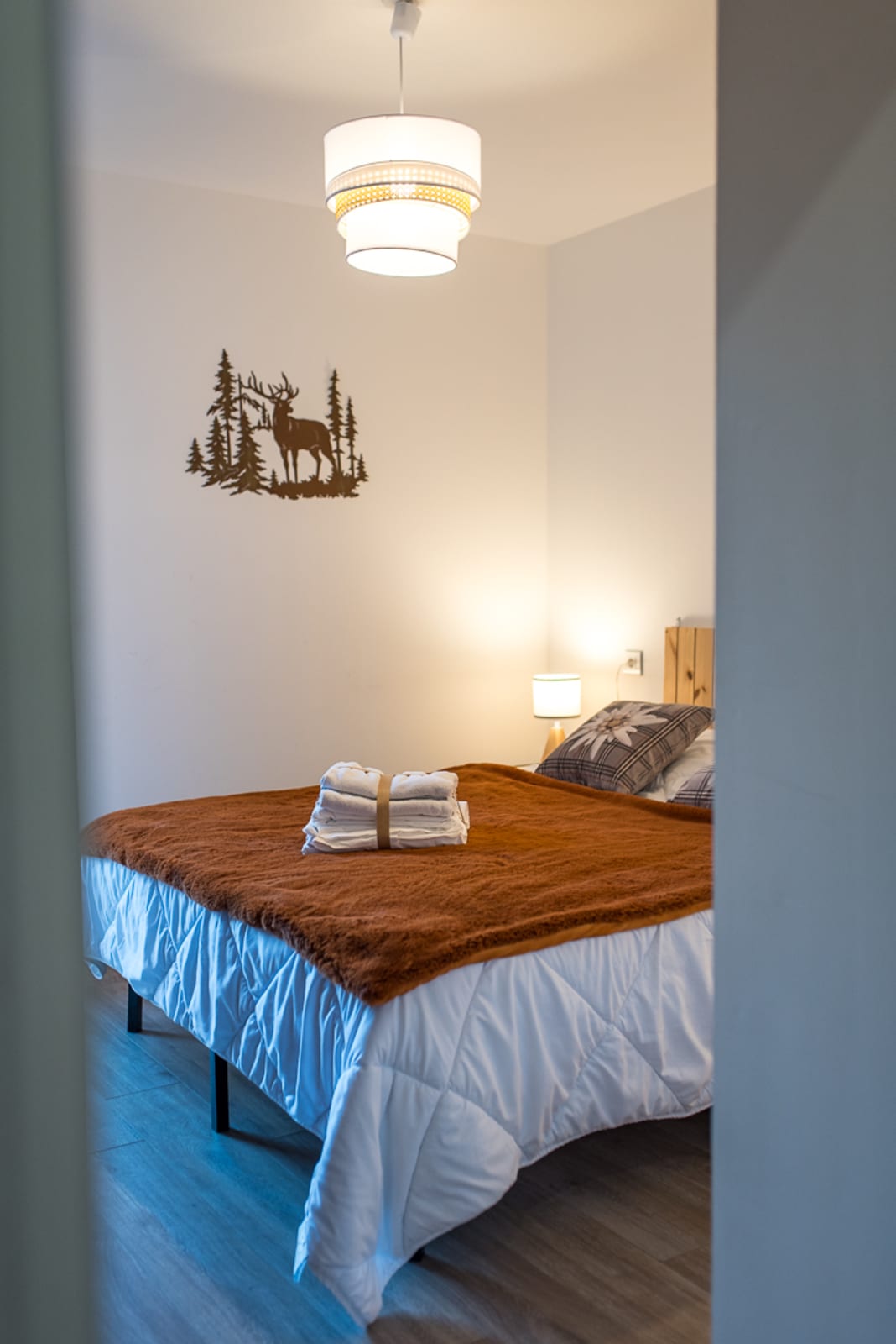 The apartment has two bedrooms. The bedroom includes a queen-size bed, offering a comfortable resting space. The second bedroom has two 90 cm single beds, perfect for children. The bedrooms are decorated in a contemporary Savoyard style, combining charm and modernity.