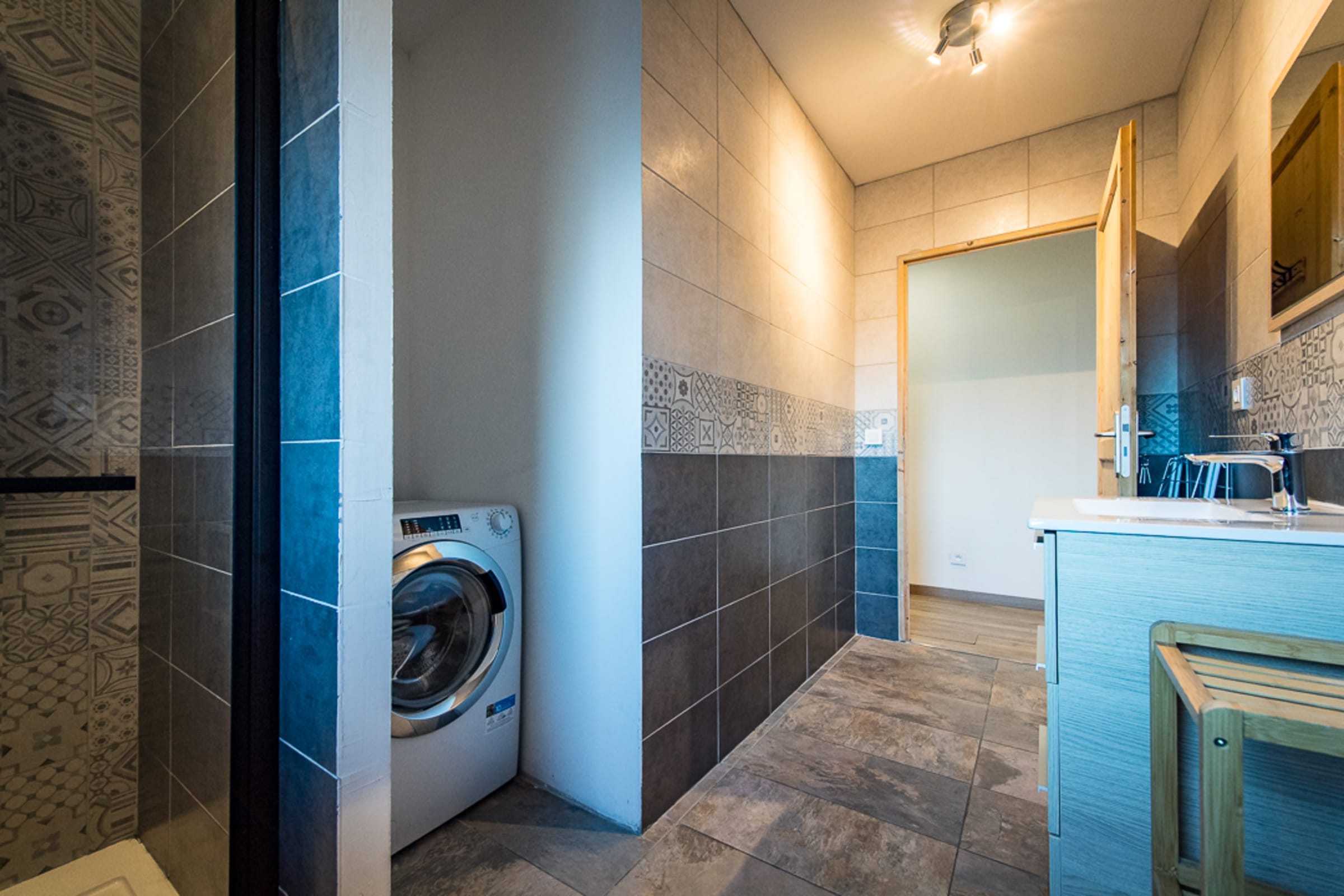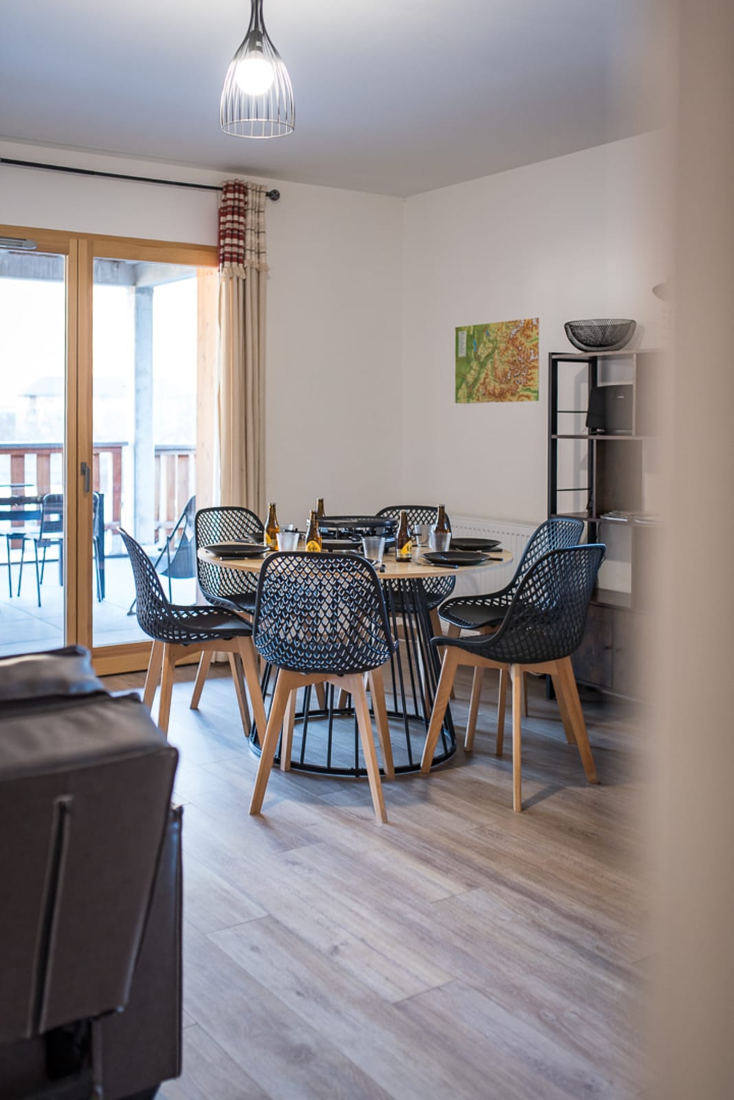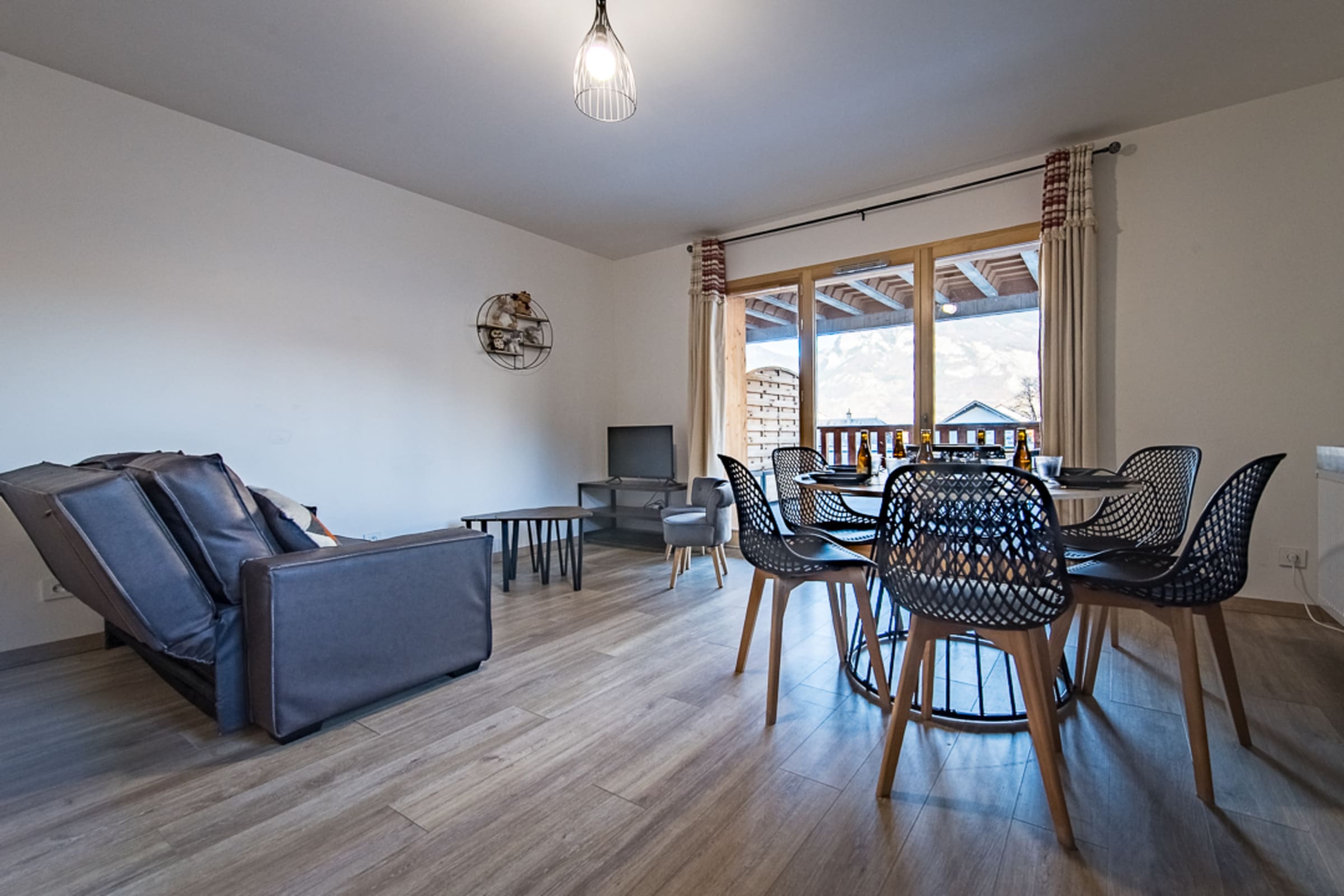 The apartment has two bedrooms. The bedroom includes a queen-size bed, offering a comfortable resting space. The second bedroom has two 90 cm single beds, perfect for children. The bedrooms are decorated in a contemporary Savoyard style, combining charm and modernity.