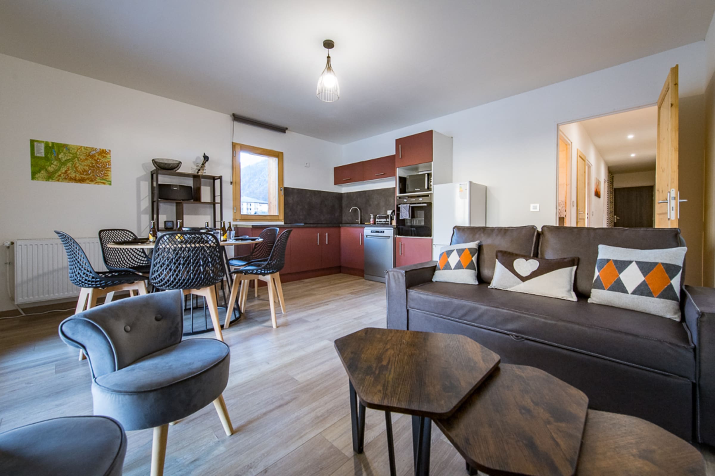 The spacious 25 m² living room is filled with natural light thanks to large windows opening onto the private 15 m² terrace. It features a double sofa bed, ideal for accommodating extra guests. The open-plan kitchen is fully equipped with an oven, dishwasher, fridge-freezer, as well as appliances such as a filter coffee machine, toaster, and raclette and fondue sets. Everything is designed to let you cook and enjoy meals with ease.