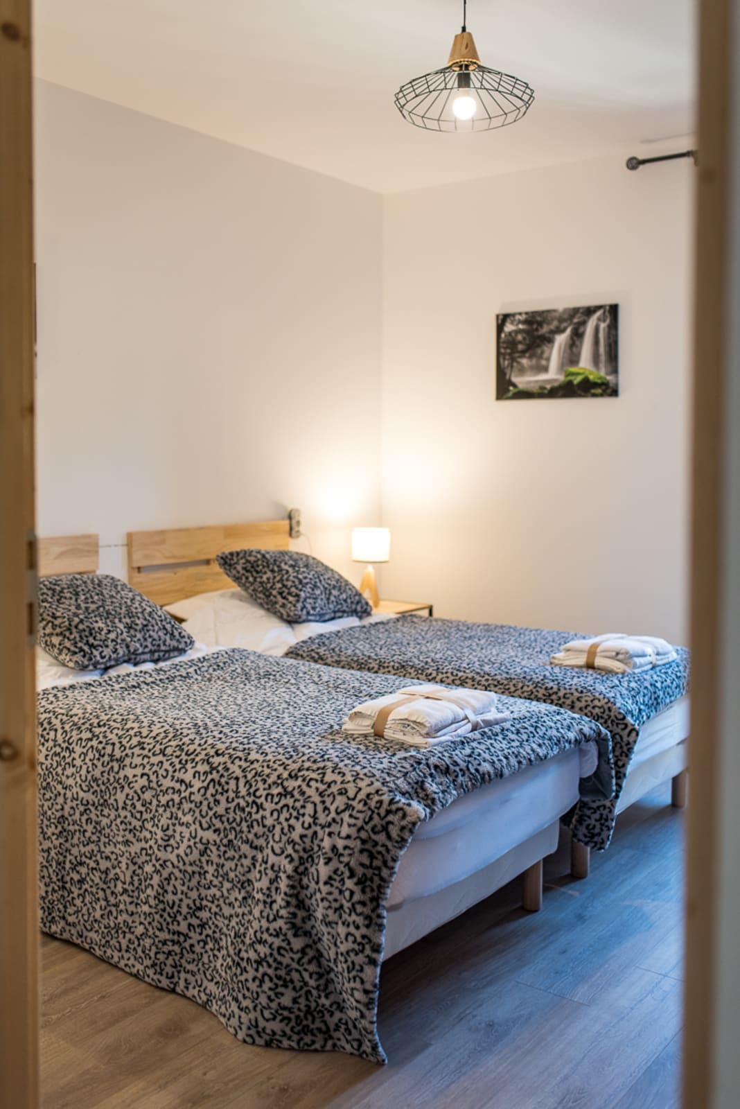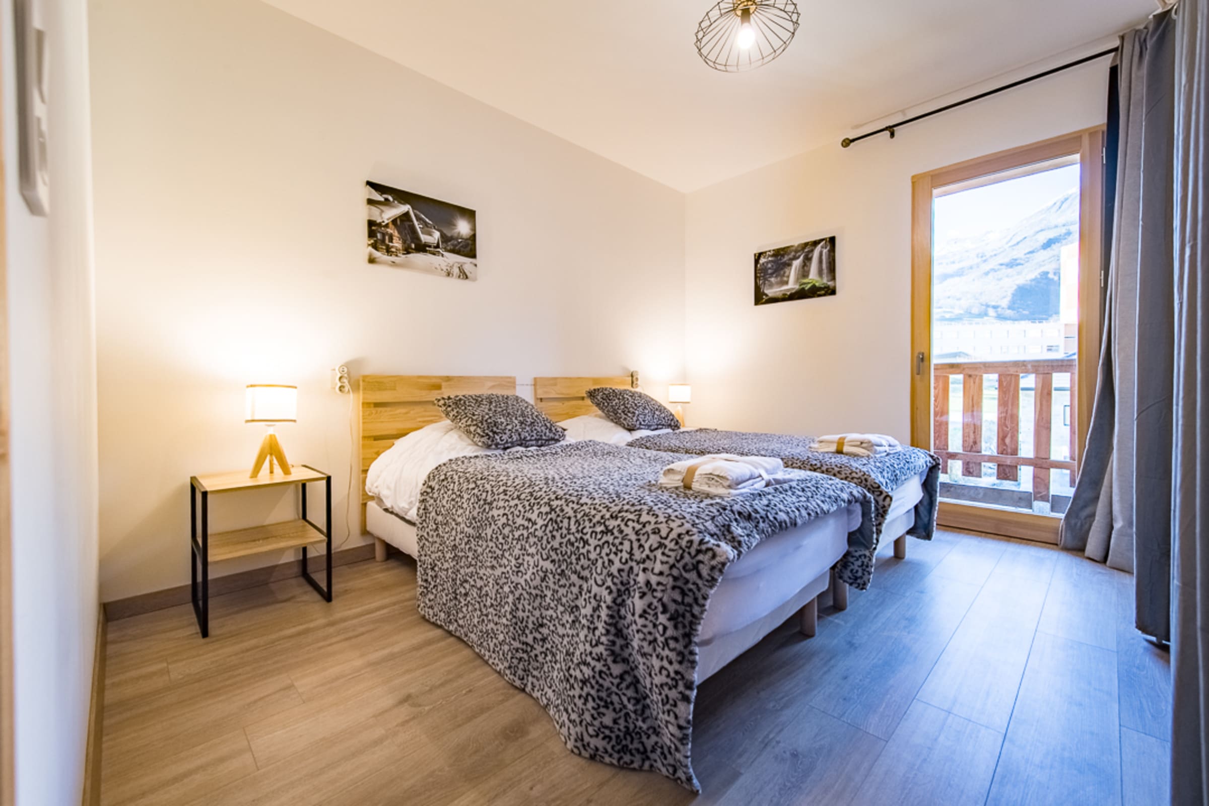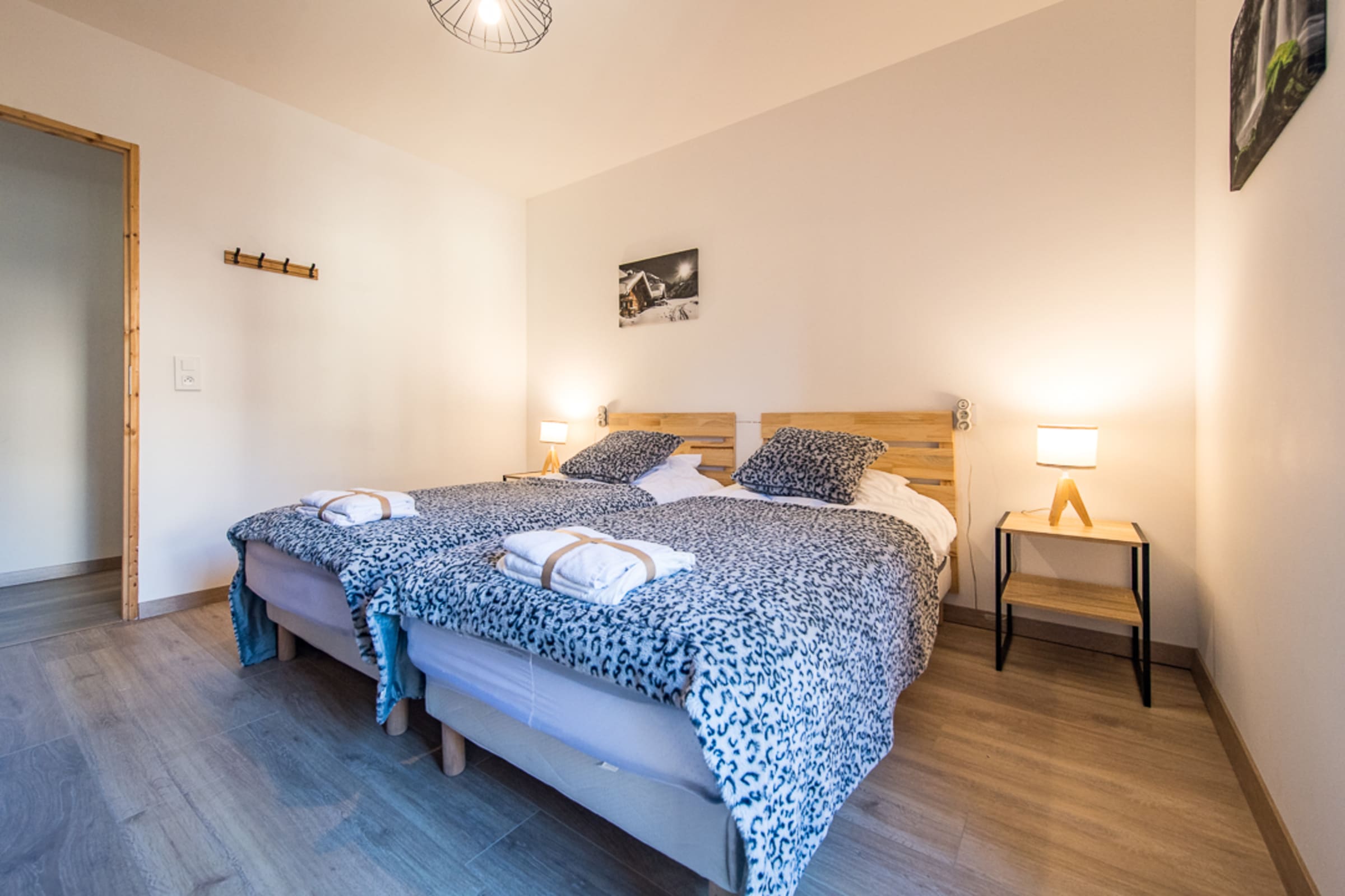 The apartment includes two bedrooms. The bedroom has a queen-size bed, offering a comfortable space to rest. The second bedroom has two single beds (90 cm), perfect for children. The bedrooms are decorated in a contemporary Savoyard style, combining charm and modernity.