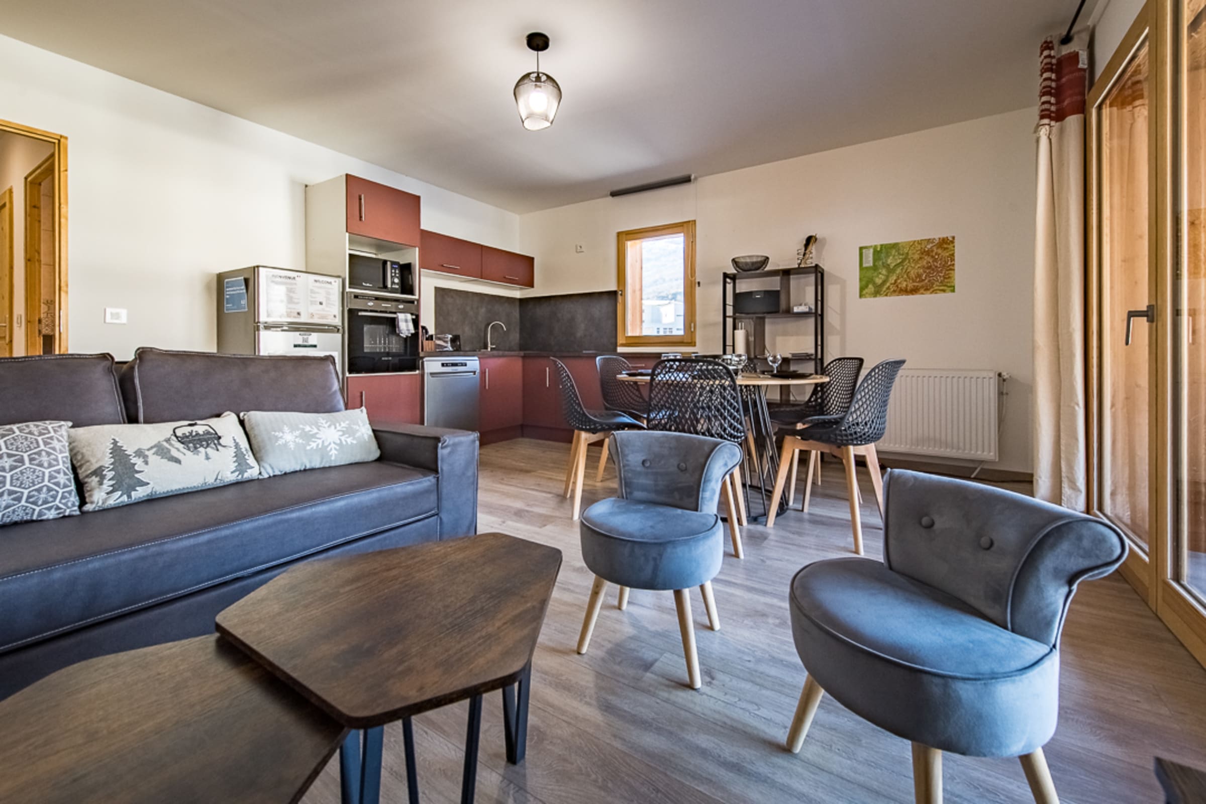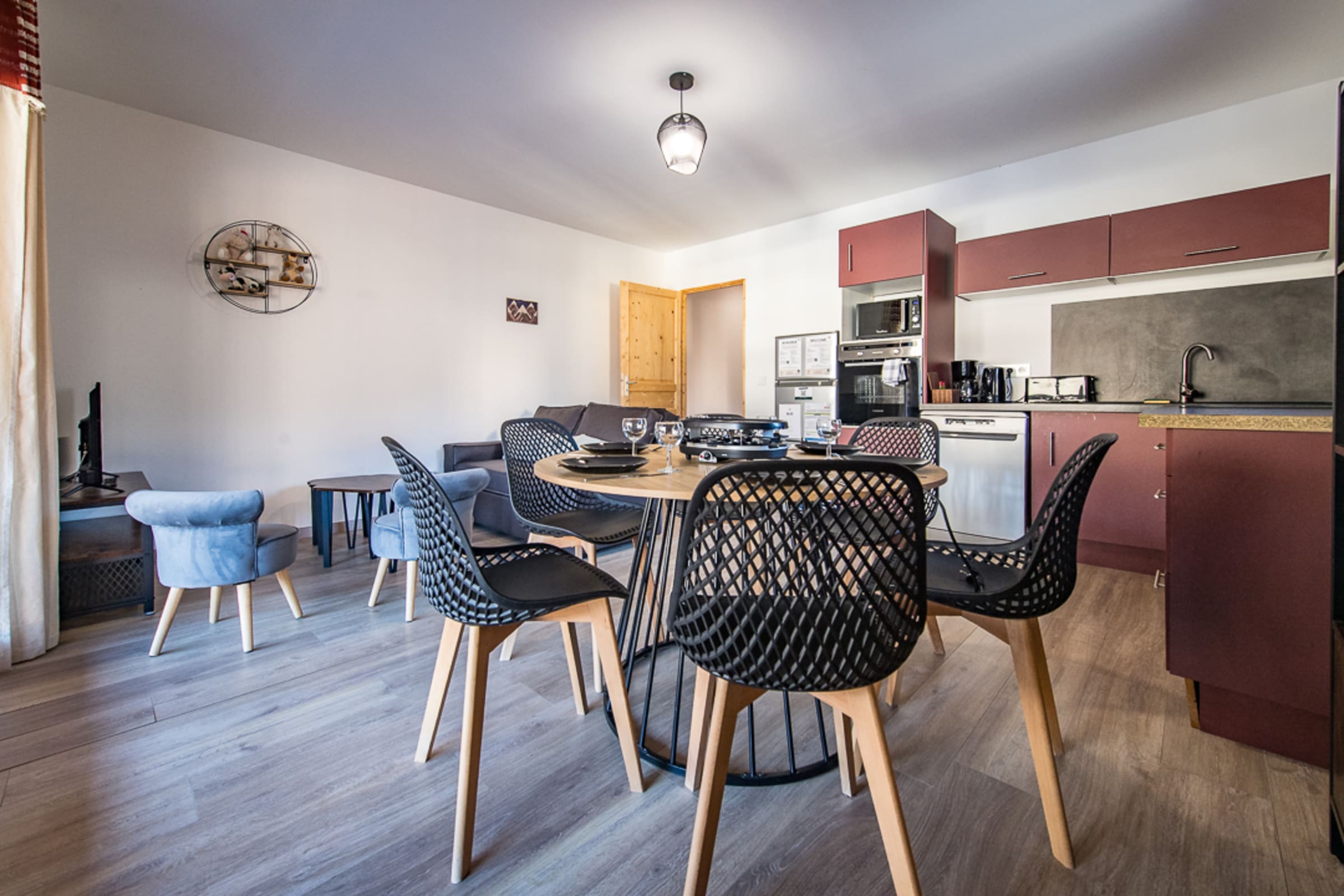 The spacious 25 m² living room is bathed in natural light thanks to the large windows that open onto the private 60 m² terrace. This living room features a double sofa bed, ideal for accommodating additional guests. The open kitchen is fully equipped with an oven, dishwasher, fridge-freezer, as well as appliances like a coffee maker (filter), a toaster and equipment for raclette and fondue. It is designed so you can prepare and enjoy your meals with ease.